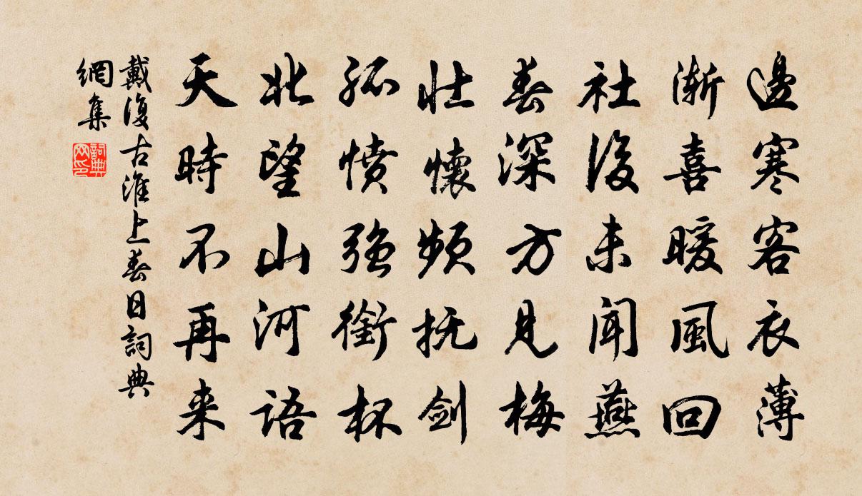 詩詞名句歷史字典書法欣賞書法字典國語詞典說文解字康熙字典古漢語字典標 題 作 者 詩 句 淮上春日作者:戴復古 朝代:宋代淮上春日原文邊寒客衣薄,漸喜暖風回。社後未聞燕,春深方見梅。壯懷頻撫劍,孤憤強銜杯。北望山河語,天時不再來。詩詞問答問:淮上春日的作者是誰?答:戴復古問:淮上春日寫於哪個朝代?答:宋代問:戴復古的名句有哪些?答:戴復古名句大全戴復古淮上春日書法欣賞淮上春日書法作品詩詞推薦巴東三峽歌佚名〔宋代〕巴東三峽巫峽長,猿鳴三聲淚沾裳。巴東三峽猿鳴悲,猿鳴三聲淚沾衣。約同僚游佳陰馮伯規〔宋代〕晚霽青山無處逃,秋來乘興便登高。□君欲暮休催去,小驛依然□嫩醪。雪楊公遠〔宋代〕怪得雲頑凍不開,漫空忽攪豆稭灰。青留一半窗前竹,白勝三分屋外格。剡曲舟應撐月去,灞橋驢想得詩回。吾儂滿庭芳(泛梅)葛立方〔宋代〕庾信何愁,休文何瘦,范叔一見何寒。梅花酷似,索笑畫檐看。便肯嫣然一笑,疏籬上、玉臉冰顏。須勤賞,莫教寄濟南守李公擇蘇轍〔宋代〕岱陰皆平田,濟南附山麓。山窮水泉見,發越遍溪谷。分流繞塗巷,暖氣烝草木。下田滿粳稻,秋成比禾菽。池塘扇子詩李石〔宋代〕負笈無他奇貨,筆端有力躬耕。僰道頗思山谷,蘭陵一變荀卿。句高似孫〔宋代〕老蟹自應強依逸,壯蛑不定期只象豪粱。和綿州於中丞登越王樓作二首(時為校書郎)於瑰〔唐代〕樓因藩邸號,川勢似依樓。顯敞含清暑,嵐光入素秋。山宜姑射貌,江泛李膺舟。郢曲思朋執,輕紗畫勝游。極目江行遇風董嗣杲〔宋代〕風急難開船,高浪潑銀屋。下水輒畏之,病篙舌愈縮。商人貨物重,久諳風信熟。我舟輕抵葉,帆破無完幅。歸心次韻程弟方岳〔宋代〕一船月自不嫌貧,伴我荒灣理釣緡。歸去莫橫深夜笛,怕驚溪友與山賓。和張純父霜月三首陳杰〔宋代〕洞庭高秋乃無事,洞庭主人獨多才。滿天如水烏啼夜,寫出寒蟬濕兔來。珍珠簾 內午冬雪梁寅〔元代〕西窗夢斷檐光曉。雪交墜、□□山僮驚報。岩岫化銀宮,似白雲仙島。萬樹梨花都開遍,怪一夜、春風來早。凝眺雪崖釋紹曇〔宋代〕空花翳眼沒根莖,平白誰知太險生。窮一色邊須撒手,且無玄路與人行。頌證道歌證道歌釋印肅〔宋代〕剎那滅卻三祗劫,更無絲髮相交涉。無名天地亦非先,有名萬物光重疊。使過瑤台寺,有懷圓寂上人顏真卿〔唐代〕上人居此寺,不出三十年。萬法元無著,一心唯趣禪。忽紆塵外軫,遠訪區中緣。及爾不復見,支提猶岌然。方寺丞新第二首劉克莊〔宋代〕宅成天下借圖看,始笑書生眼力慳。地占百弓多是水,樓無一面不當山。荷深似入苕溪路,石怪疑行雁盪間。只恐空第陳杰〔宋代〕潭潭居府美哉輪,歌舞回頭跡已陳。東閣早知為馬廄,西曹正可認車茵。高明易瞰多招鬼,富貴無常忽易人。看取自上元後閒作五首張耒〔宋代〕閶闔樓南粉署西,舊時種柳長應齊。如今冷落窮山縣,臥聽春風百鳥啼。次韻子瞻杜介供奉送魚蘇轍〔宋代〕天街雪霽初通駟,禁籞冰開漸躍魚。十尾煩君穿細柳,一杯勸我芼青蔬。寒樽獨酌偶逢客,佳句相酬不用書。江海寒食日早出城東羅隱〔唐代〕青門欲曙天,車馬已喧闐。禁柳疏風雨,牆花拆露鮮。向誰誇麗景,只是嘆流年。不得高飛便,回頭望紙鳶。名句推薦古岩泉滴滴,幽谷鳥關關。令狐楚《賦山 / 一七令·山》 雨足高田白,披蓑半夜耕。崔道融《田上》 訪戴歸來,尋梅懶去,獨釣無聊。薛昂夫《蟾宮曲·雪》 八佾舞於庭,是可忍也,孰不可忍也?孔子弟子《論語·八佾篇》 去好去惡,臣乃見素;去舊去智,臣乃自備。韓非及後人《韓非子·主道》 糟糠不飽者不務粱肉,短褐不完者不待文繡。韓非及後人《韓非子·五蠹》 正雁水夜清,臥虹平帖。吳文英《暗香·送魏句濱宰吳縣解組分韻得闔字》 記得短亭歸馬,暮衙蜂鬧。吳文英《天香·蠟梅》 憶與君別年,種桃齊蛾眉。李白《獨不見》 黃雲萬里動風色,白波九道流雪山。李白《廬山謠寄盧侍御虛舟》