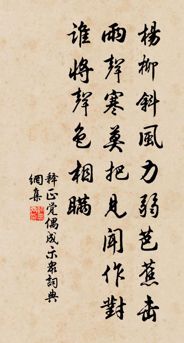 詩詞名句歷史字典書法欣賞書法字典國語詞典說文解字康熙字典古漢語字典標 題 作 者 詩 句 偶成示眾作者:釋正覺 朝代:宋代偶成示眾原文楊柳斜風力弱,芭蕉擊雨聲寒。莫把見聞作對,誰將聲色相瞞。詩詞問答問:偶成示眾的作者是誰?答:釋正覺問:偶成示眾寫於哪個朝代?答:宋代釋正覺偶成示眾書法欣賞偶成示眾書法作品詩詞推薦挽樓朝奉陳傅良〔宋代〕裘馬朋簪盛,緋魚筦庫卑。行藏公論在,然否雨心知。歲晏曾三接,民功僅一麾。空餘華袞字,有恨蓋棺時。浣溪沙佚名〔宋代〕春院無人花自香。飛來蜂蝶意何狂。玉鉤簾卷日偏長。笑又不成愁未是,曲屏閒倚繡鴛鴦。歸時應供□□妝。鳳簫閣翫月四首白玉蟾〔宋代〕暮靄收無歸鳥盡,鳳簫閣上聽松濤。宿枝不穩鴉飛起,照水當中月上高。次韻歐陽伯威見和趙蕃〔宋代〕宗派滔滔是,於今得障流。無悲和者寡,故愈暗中投。我願下取履,君其高臥樓。穹岡如許割,肯愛一官休。偈頌一百零九首釋可湘〔宋代〕溈仰兩爺兒,採茶機對機。只知呈體用,不覺露槍旗。正值風和日暖,何妨把手同歸,子規啼破已多時。滿江紅陸游〔宋代〕危堞朱欄,登覽處、一江秋色。人正似、征鴻社燕,幾番輕別。繾綣難忘當日文,淒涼又作它鄉客。問鬢邊、都有水淺舟滯解悶十絕鄭獬〔宋代〕斗城縹緲浮雲里,歸路陂陀碧草斜。北極已看龍虎氣,神州漸近帝王家。游洞霄登蓬山隱居魏克愚〔宋代〕仙境孰為真,蓬山隱獨清。樹林陰上下,樓觀影崢嶸。雨送流泉響,禽供搗藥聲。何須天柱頂,身已在空明。再答明略二首黃庭堅〔宋代〕挾策讀書計餬口,故人南箕與北斗。江南江北萬重山,千里寄書聲不還。當時朱弦寫心曲,果在高山深水間。沽桐春遊陸游〔宋代〕春風堤上草萋萋,草軟沙平護馬蹄。似蓋微雲才障日,如絲細雨不成泥。千秋觀里逢新燕,九里山前聽午雞。追憶癸卯歲毗陵登高會中貽同志章碣〔唐代〕流落常嗟勝會稀,故人相遇菊花時。鳳笙龍笛數巡酒,紅樹碧山無限詩。塵土十分歸舉子,乾坤大半屬偷兒。長楊高麗鏡文佚名〔唐代〕三水中,四維下,上帝降子於辰馬。先操雞,後搏鴨。己年中,二龍見。一則藏身青木中,一則見形黑金東。江西送人曹鄴〔唐代〕八月江上樓,西風令人愁。攜酒樓上別,盡見四山秋。但愁今日知,莫作他時疑。郎本不住此,無人泣望歸。何水過新開湖五首楊萬里〔宋代〕遠遠人煙點樹梢,船門一望一魂消。幾行野鴨數聲鴈,來為湖天破寂寥。危見心攜示別去寄謝艾性夫〔宋代〕好客來今雨,長吟出古風。詩神君獨富,文鬼我方窮。湖海飄零外,乾坤感慨中。相逢難袞袞,取別竟匆匆。鳳棲梧 天台石橋張可久〔元代〕兩袖剛風凌倒景。小磴松聲,獨上招提境。碧水流雲三百頃。白龍飛過青天影。折腳鐺中留苦茗。野菊生花,猶記龍井十題龍井亭釋元淨〔宋代〕虛亭亂石間,中有潛虬府。澄湛源莫窮,旱歲為靈雨。金蓮出玉花 案調名即減字木蘭花 得遇行化丘處機〔元代〕重陽師父。昔日甘河曾得遇。大道心開。設教東遊海上來。天涯回首。挈得吾鄉三四友。魏國升遐。驚動秦川百萬禽獸昆蟲之孝十首猿林同〔宋代〕不忍身逃箭,知為母塞瘡。人心有如此,獸面本何常。讀書陸游〔宋代〕堯庭君相都俞盛,闕里師生博約深。我讀殘編食忘味,朱弦三嘆有遺音。名句推薦玉在櫝中求善價,釵於奩內待時飛。曹雪芹《紅樓夢·第一回》 遼東小婦年十五,慣彈琵琶解歌舞。李頎《古意》 暖風熏得遊人醉,直把杭州作汴州。林升《題臨安邸》 雷雨窈冥而未半,皦日籠光於綺寮。左思《三都賦》 守恬淡以養道,處卑下以養德,去嗔怒以養性,薄滋味以養氣。陳繼儒《小窗幽記·集景篇》 善謀生者,但令長幼內外,勤修恆業,而不必富其家王永彬《圍爐夜話·第九則》 自與東君作別,剗地無聊。納蘭性德《風流子·秋郊即事》 青蒲銜紫茸,長葉復從風。佚名《拔蒲二首》 借問酒家何處有?牧童遙指杏花村。杜牧《清明》 停車坐愛楓林晚,霜葉紅於二月花。杜牧《山行》