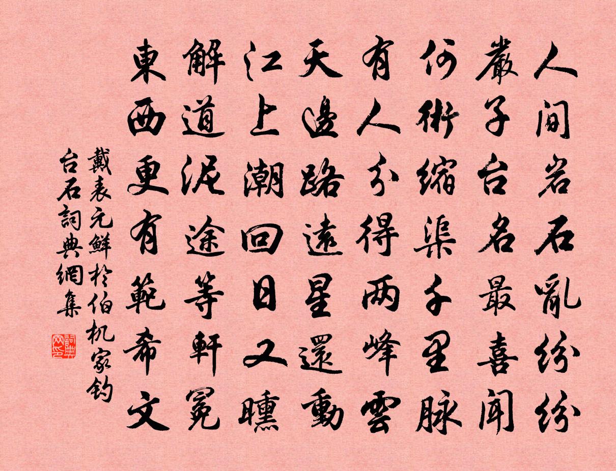 詩詞名句歷史字典書法欣賞書法字典國語詞典說文解字康熙字典古漢語字典標 題 作 者 詩 句 鮮于伯機家釣台石作者:戴表元 朝代:宋代鮮于伯機家釣台石原文人間岩石亂紛紛,嚴子台名最喜聞。何術縮渠千里脈,有人分得兩峰雲。天邊路遠星還動,江上潮回日又曛。解道泥途等軒冕,東西更有范希文。詩詞問答問:鮮于伯機家釣台石的作者是誰?答:戴表元問:鮮于伯機家釣台石寫於哪個朝代?答:宋代戴表元鮮于伯機家釣台石書法欣賞鮮于伯機家釣台石書法作品詩詞推薦簡史子由主簿釋寶曇〔宋代〕曉行雲海意蒼茫,畫入王維鴻雁行。煙樹屏山分遠近,風帆沙鳥認微芒。筆端應有鮫人淚,句法仍搜墨客腸。日暮香山篇楊維楨〔元代〕放舟脂塘曲,盤游湖上雷。雷鳴湖雨作,還泊香山隈。美人斗香草,上有九畹栽。美人在何所,搴芳招歸來。露下減字木蘭花(用舊韻戲吳奉議)舒亶〔宋代〕眉山斂額。往事追思空手拍。雁字頻飛。生怕人來說著伊。閒拋繡履。愁殢香衾渾不起。莫似揚州。只作尋常薄倖寒食李餘〔唐代〕玉輪江上雨絲絲,公子遊春醉不知。翦渡歸來風正急,水濺鞍帕嫩鵝兒。郭及之僉判招飲雅安同僚也李流謙〔宋代〕江來從此合,我上爾東行。節物驚心地,主人留客情。霧花搖老眼,霧花灩深觥。醉恐清歌斷,應須更數聲。題西隱三首吳江趙主〔宋代〕偶無公事獨憑欄,領略風煙萬頃寬。說似西廊曾懋父,倩君椽筆寫郊寒。連日治圃至山亭又作五字陸游〔宋代〕門開度略彴,路盡上坡陀。農隙閒耕犢,樵歸起醉歌。青煙舞鸞鳳,白石伏黿鼉。剩有筇枝興,窮冬氣已和。扇子詩李石〔宋代〕晴日淺深著柳,暖風高下吹花。醉里蝴蝶作夢,醒後狂蜂報衙。秋晚病起陸游〔宋代〕心靜病良已,翛然巾履輕。灰深地爐暖,日出紙窗明。宿雨全消瘴,新霜剩得晴。井梧殊可念,無葉送秋聲。鷓鴣天辛棄疾〔宋代〕上巳風光好放懷。憶君猶未看花回。茂林映帶誰家竹,曲水流傳第幾杯。摛錦繡,寫玫瑰。長年富貴屬多才。要知信筆陸游〔宋代〕少年醉眼傲王侯,末路悲歌夜飯牛。濟世有時生一念,鏡中白髮勸人休。老彭像舒岳祥〔宋代〕籛鏗自古壽稱延,上下堯殷九百年。自是周遮加謹畏,至今百忌歷猶傳。暮春滻水送別 / 一作暮春送客韓琮〔唐代〕綠暗紅稀出鳳城,暮雲樓閣古今情。行人莫聽官前水,流盡年光是此聲。感秋五首楊萬里〔宋代〕平生畏長夏,一念願清秋。如何遇秋至,不喜卻成愁。書冊秋可讀,詩句秋可搜。永夜宜痛飲,曠野宜遠遊。江南同莊秀才宿鎮星觀馬戴〔唐代〕的的星河落,沾苔復灑松。濕光微泛草,石翠澹搖峰。野觀雲和月,秋城漏間鍾。知君親此境,九陌少相逢。郜溪別周伯弓釋永頤〔宋代〕夜館寒相對,篝燈語不眠。夕煙生水郭,風柳泊沙船。暖棄山中宅,春耕葑上田。西峰晴靄碧,歸去挹飛泉。緋桃開小酌陸游〔宋代〕我廬城南村,家無十金產。種花雖歷歲,名品終有限。頗欲及暇時,著譜書之簡。今朝緋桃開,歡喜洗酒琖。鄰翁偈頌二百零五首釋正覺〔宋代〕一陣清霜,千峰寒色,里許是誰看轉側。家風克紹紹非功,撫背忽驚兒脫白。四皓二首王安石〔宋代〕秦敺九州逃,知力起經綸。重利誘眾策,頗知聚秦民。頹然此四老,上友千載魂。采芝商山中,一視漢與秦。靈珠偈頌七十八首釋正覺〔宋代〕衲僧只麽是家風,隱顯磨礱入混融。歸子返擲全歸火,羚羊掛角不同功。名句推薦清愁滿眼共誰論。卻應台下草,不解憶王孫。李之儀《臨江仙·登凌歊台感懷》 三春白雪歸青冢,萬里黃河繞黑山。柳中庸《征人怨 / 征怨》 書中自有黃金屋,書中自有顏如玉趙恆《勸學詩》 為有犧牲多壯志,敢叫日月換新天。 * 《七律·到韶山》 月上柳梢頭,人約黃昏後。歐陽修《生查子·元夕》 酷暑天,葵榴發,噴鼻香十里荷花。白樸《得勝樂·夏》 形勝三分國,波流萬世功。潘大臨《江間作四首·其三》 蕭條亭障遠,悽慘風塵多庾信《擬詠懷二十七首·其二十六》 青蒲銜紫茸,長葉復從風。佚名《拔蒲二首》 奸有益,人皆可為奸;忠致禍,人難為忠。來俊臣《羅織經·察奸卷第八》