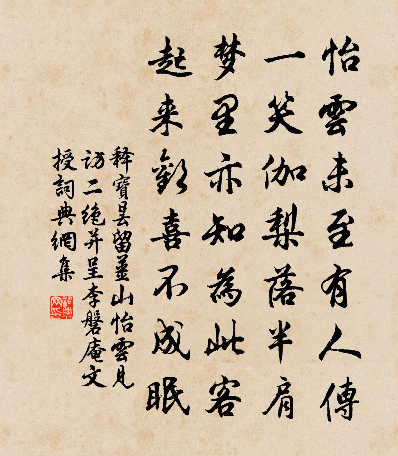 詩詞名句歷史字典書法欣賞書法字典國語詞典說文解字康熙字典古漢語字典標 題 作 者 詩 句 留姜山怡雲見訪二絕並呈李磐庵文授作者:釋寶曇 朝代:宋代原文怡雲未至有人傳,一笑伽梨落半肩。夢裡亦知為此客,起來歡喜不成眠。詩詞問答問:《留姜山怡雲見訪二絕並呈李磐庵文授》的作者是誰?答:釋寶曇問:該詩寫於哪個朝代?答:宋代書法欣賞留姜山怡雲見訪二絕並呈李磐庵文授書法作品詩詞推薦丹陽湖阻風二首王之道〔宋代〕老去心猶壯,詩成喜欲顛。時危思報主,窮極待呼天。歸夢先湖外,離情到酒邊。晚來風更惡,舟臥不成眠。宿香山寺石樓李頎〔唐代〕夜宿翠微半,高樓聞暗泉。漁舟帶遠火,山磬發孤煙。衣拂雲松外,門清河漢邊。峰巒低枕席,世界接人天。靄靄萼嶺四望皇甫曾〔唐代〕漢家仙仗在鹹陽,洛水東流出建章。野老至今猶望幸,離宮秋樹獨蒼蒼。句陳傅良〔宋代〕夢由今日賚,事與古人求。金錢菊史鑄〔宋代〕天女將圖買斷秋,筭來白帝價難酬。金錢滿合翻嫌富,撒向幽叢竟不收。送高司直尋封閬州杜甫〔唐代〕丹雀銜書來,暮棲何鄉樹。驊騮事天子,辛苦在道路。司直非冗官,荒山甚無趣。借問泛舟人,胡為入雲霧。與子贈日東鑒禪師司空圖〔唐代〕故國無心度海潮,老禪方丈倚中條。夜深雨絕松堂靜,一點飛螢照寂寥。頌古四十五首釋慧遠〔宋代〕不是風幡動,亦非仁者心。自從胡亂後,淈{左氵右盾}到而今。宮中題佚名〔唐代〕輦路生春草,上林花發時。憑高何限意,無復侍臣知。偈頌七十二首釋祖欽〔宋代〕殺活縱橫得自由,懸崖撒手覓冤讎。瞎驢滅卻 * 眼,射斗寒光夜不收。西楚霸王廟二絕陳淳〔宋代〕氣壓關河力拔山,絕人武勇更無前。若於今代當戎寄,子弟何須用八千。偈頌九十三首釋梵琮〔宋代〕世尊拈花,迦葉破顏。只因學步,失卻邯鄲。斫卻庭前樹,放出雲外山。行人才眨眼,身在畫圖間。鳥飛不到處,游雲際山陳洙〔宋代〕清曉捫蘿踏嶺雲,寒風飛溜濕衣巾。上攀霄漢無多地,直視城闉幾點塵。古木半陰藏宿霧,山禽相語厭遊人。明年次韻徐何慊詠雪陳著〔宋代〕馮夷翦水暗中央,映帶同雲淺與黃。旋積層寒消宿瘴,平鋪一白洗時妝。行仙休羨王恭興,僵叟應關洛令腸。不覺不寐蘇泂〔宋代〕風露淒清入敝裘,月明偏照五更頭。無衣畢竟乾誰事,徹夜寒螿叫不休。句田農夫〔宋代〕桃李場中已免參,只將農輔繁頭術。婦女之孝二十首梁夫人嬺林同〔宋代〕能返母萬里,還榮父九原。可憐帝有母,亦自待人言。春熱鄭剛中〔宋代〕地氣冬來不復藏,桃花都向臘前芳。無寒疑是青春老,耐靜從他白日長。野蝶舞餘還自去,沙鷗飛斷卻成行。迎風夜行船仇遠〔宋代〕十二闌乾和露倚。銀潢淡、玉蟾如洗。萬籟無聲,纖雲不染。目斷楚天千里。自把黃花閒數蕊。空招隱、湘君山鬼偶憩吳則禮〔宋代〕系馬後河川。可人冬景妍。要看花到晚,付與水浮天。未覺隨戎馬,端來喚酒船。誰雲是關塞,勝事總堪傳。名句推薦人有悲歡離合,月有陰晴圓缺,此事古難全。蘇軾《水調歌頭·丙辰中秋》 塞垣多少思歸客,留著長條贈遠遊。朱栴《官橋柳色》 躬自厚而薄責於人,則遠怨矣。孔子弟子《論語·衛靈公篇》 白毛浮綠水,紅掌撥清波駱賓王《詠鵝》 天闕象緯逼,雲臥衣裳冷杜甫《游龍門奉先寺》 依舊,依舊,人與綠楊俱瘦。秦觀《如夢令·春景》 粗繒大布裹生涯,腹有詩書氣自華。蘇軾《和董傳留別》 波光水鳥驚猶宿, 露冷流螢濕不飛。湯顯祖《江宿》 易樂者必多哀,輕施者必好奪。王通《中說·卷一·王道篇》 明月青山夜,高天白露秋。李嶠《同賦山居七夕》