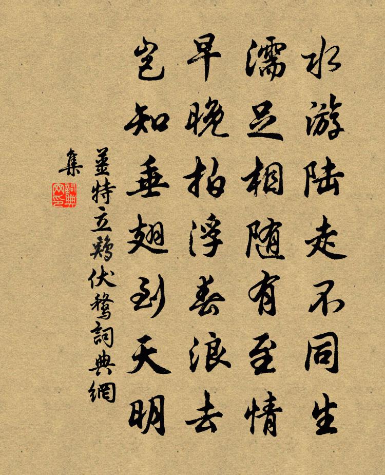 詩詞名句歷史字典書法欣賞書法字典國語詞典說文解字康熙字典古漢語字典標 題 作 者 詩 句 雞伏鶩作者:姜特立 朝代:宋代雞伏鶩原文水游陸走不同生,濡足相隨有至情。早晚拍浮春浪去,豈知垂翅到天明。詩詞問答問:雞伏鶩的作者是誰?答:姜特立問:雞伏鶩寫於哪個朝代?答:宋代姜特立雞伏鶩書法欣賞雞伏鶩書法作品詩詞推薦次韻楊宰捕蝗宿競岩四首陳造〔宋代〕龍公私我雨滂浪,釀酒須防有乞漿。慚愧四鄰千萬室,{上四下各}無笑語及時暘。句釋曉瑩〔宋代〕隨宜領覽到斜暉。解連環(春夢)黃水村〔宋代〕鳳樓倚倦。正海棠睡足,錦香衾軟。似不似、霧閣雲窗,擁絕妙靈君,霎時曾見。屏里吳山,又依約、獸環半掩。徐秀才園亭王安石〔宋代〕茂松修竹翠紛紛,正得山阿與水濆。笑傲一生雖自樂,有司還欲選方聞。落葉釋文珦〔宋代〕落葉重得與砌平,流泉澹澹入池清。無人訓我無人到,獨自吟詩獨自行。芳草羅鄴〔唐代〕曲江岸上天街里,兩地縱生車馬多。不似萋萋南浦見,晚來煙雨半相和。雜興宋祁〔宋代〕殘暑辭遙夕,初涼澹蕭辰。燕索西飛伴,雁作南來賓。霽巒靜矗矗,遠水清鱗鱗。由來搖落恨,先付長年人。鸚鵡曲 龐隱圖馮子振〔元代〕團欒話里禪龕住。靈昭女對老龐父。利名心不掛絲毫,更肯沾風粘雨。嘆黃金散盡還家,逝水看流年去。只尋常賣慈恩寺南池秋荷詠韋應物〔唐代〕對殿含涼氣,裁規覆清沼。衰紅受露多,餘馥依人少。蕭蕭遠塵跡,颯颯凌秋曉。節謝客來稀,回塘方獨繞。李相薨後題斷金集(一作裴夷直詩)令狐楚〔唐代〕一覽斷金集,載悲埋玉人。牙弦千古絕,珠淚萬行新。記夢(並敘)蘇軾〔宋代〕樂全先生夢人以詩三篇示之,字皆旁行而不可識。傍有人道衣古貌,為讀其中一篇云:人事且常在,留質悟圓間。送顏復赴闕蘇轍〔宋代〕簟瓢未改安貧性,鳧繹猶傳直道余。不見失官愁戚戚,但聞高臥起徐徐。居中舊厭軍容講,補外仍遭城旦書。此去小暑日寄山甫二首劉克莊〔宋代〕微官便有簡書畏,貧舍非無水菽歡。插架簽存先世舊,堆床笏美一時觀。遠書且問平安好,前哲曾嗟嗣守難。了卻新月應制盧多遜〔宋代〕太液池邊看月時,好風吹動萬年枝。誰家玉匣開新鏡,露出清光些子兒。福州長溪樂山王居士遣兒惟惺投師薙髮寫師頂釋普濟〔宋代〕聞名不如見面,見面不如聞名。兩重虛假,一對眼晴,不近人情處,是句也劃,非句也劃。一味拍盲時,逼犬透牆次韻子瞻和淵明擬古九首蘇轍〔宋代〕夜夢被發翁,騎驎下大荒。獨行無與游,闖然款我堂。高論何崢嶸,微言何渺茫。我徐聽其說,未離翰墨場。平生偈釋義懷〔宋代〕須彌頂上,不扣金鐘。畢缽岩中,無人聚會。山僧倒騎佛殿,諸人反著草鞋。朝游檀特,暮到羅浮。拄杖針筒,自薛侍朗移鎮合肥被命入覲賦唐律詩二章曹彥約〔宋代〕平生惟仰薛居州,病渴尋梅正所求。風送有時參畫鷁,幕開無路到青油。百年萬事常交臂,一代數人今白頭。帷幄偶題殷堯藩〔唐代〕越女收龍眼,蠻兒拾象牙。長安千萬里,走馬送誰家。夏雲曹松〔唐代〕勢能成岳仞,頃刻長崔嵬。暝鳥飛不到,野風吹得開。一天分萬態,立地看忘回。欲結暑宵雨,先聞江上雷。名句推薦春遊之盛,西湖未能過也。姜夔《琵琶仙·雙槳來時》 得成比目何辭死,願作鴛鴦不羨仙。盧照鄰《長安古意》 惡無定議,莫以惡為惡者顯;善無定評,勿以善為善者安。來俊臣《羅織經·保身卷第七》 入門休問榮枯事,且看容顏便得知。佚名《增廣賢文·上集》 故園腸斷處,日夜柳條新。宋之問《途中寒食題黃梅臨江驛寄崔融》 水激則悍,矢激則遠劉向《說苑·談叢》 九華山路雲遮寺,清弋江村柳拂橋。杜牧《宣州送裴坦判官往舒州時牧欲赴官歸京》 可有梅花寄一枝?雪來翠羽飛。吳錫麒《長相思·以書寄西泠諸友即題其後》 碧窗斜月藹深暉,愁聽寒螿淚濕衣張仲素《秋閨思二首》 黃河九天上,人鬼瞰重關。元好問《水調歌頭·賦三門津》