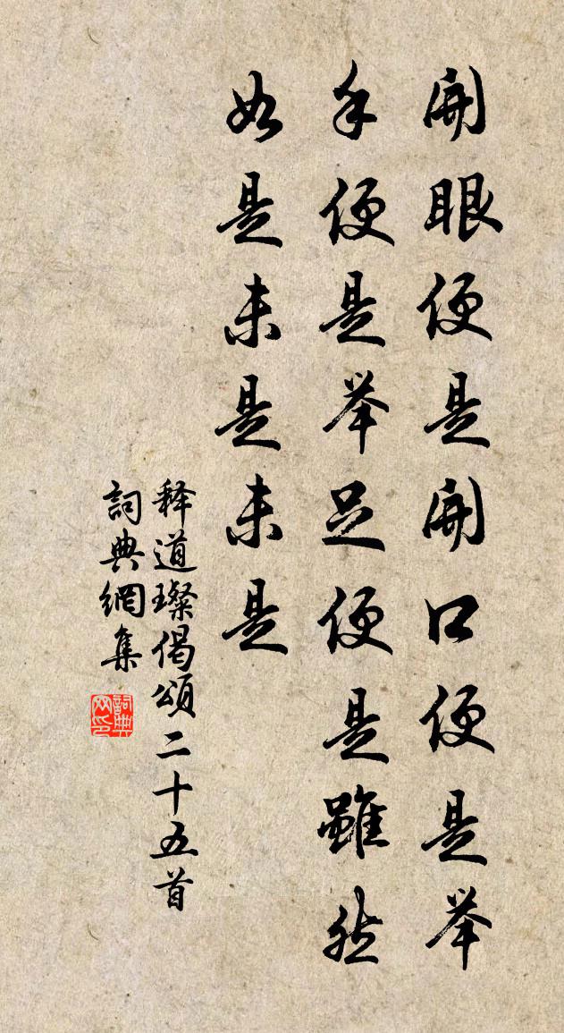 詩詞名句歷史字典書法欣賞書法字典國語詞典說文解字康熙字典古漢語字典標 題 作 者 詩 句 偈頌二十五首作者:釋道璨 朝代:宋代偈頌二十五首原文開眼便是,開口便是。舉手便是,舉足便是。雖然如是,未是未是。詩詞問答問:偈頌二十五首的作者是誰?答:釋道璨問:偈頌二十五首寫於哪個朝代?答:宋代釋道璨偈頌二十五首書法欣賞偈頌二十五首書法作品詩詞推薦墨君十詠弄雨王銍〔宋代〕一段風煙筆下開,小枝帶雨思縈迴。障風一袖如相向,說與嫦蛾淚落來。偶成用溪陰韻趙處澹〔宋代〕虛室蕭蕭百慮忘,近來趣味一何長。清談自笑如東晉,好句誰能學盛唐。舊日故園春寂寞,三年上國夢淒涼。功名句張良臣〔宋代〕客向愁中都老盡,只留平楚伴銷凝。和郭戶部中秋月李復〔宋代〕重雲宿靄風收盡,千丈銀毫吐海涯。露氣洗開青玉闕,龍宮浮出白蓮華。寒驚棲鵲翻庭樹,陰引靈珠耀浦沙。我是弱柳張詠〔宋代〕枝莖何弱種何緣,著架扶持勢可憐。但見低垂長衛足,更無疏疏欲參天。離情謾指千條線,野興堪驚一點菸。最惜鏡湖女陸游〔宋代〕湖中居人事舟橶,家家以舟作生業。女兒妝面花樣紅,小繖翻翻亂荷葉。日暮歸來月色新,菱歌縹緲泛煙津。到家皇太后閣六首蘇軾〔宋代〕翠筒初裹棟,薌黍復纏菰。水殿開冰監,瓊漿凍玉壺。句劉筠〔宋代〕鶴伴鳴琴公事晚,烏驚調角戍城秋。早春寄景仁司馬光〔宋代〕疊石溪上春,茅茨卜築新。前言如不踐,山蟬又笑人。思佳客仇遠〔宋代〕霜醉秋花錦覆堤。西風一舸小橋西。閒將窗下紅蘭夢,寫入江南白薴詞。芳緒斷,舊遊非。空遺香墨濕烏絲。碧雲得故人訊息李中〔唐代〕多難分離久,相思每淚垂。夢歸殘月曉,信到落花時。未必乖良會,何當有後期。那堪樓上望,煙水接天涯。又和謝良輔惠箭筍吳芾〔宋代〕卜得幽居山繞屋,四圍景物何紛郁。門前掩映百垂楊,牆裡迴環萬修竹。風來花氣競薰人,日出鳥聲渾滿谷。檐前偈頌六十七首釋原妙〔宋代〕大海無魚,大地無草。大富無糧,大悟無道。雜曲歌辭行路難張宏紘〔唐代〕君不見溫家玉鏡台,提攜抱握九重來。君不見相如綠綺琴,一撫一拍鳳凰音。人生意氣須及早,莫負當年行樂心。口占俞桂〔宋代〕園林綠暗又紅稀,蜀鳥啼山筍蕨肥。春夏一番交篆早,綿衣脫了著單衣。絕句張伯端〔宋代〕釋氏教人修極樂,亦緣極樂是金方。大都色相惟茲實,餘二非真謾度量。雪中連日行役戲書簡同僚黃庭堅〔宋代〕簡書催出似驅雞,聞道饑寒滿屋啼。炙背巿眠榾柮火,嚼冰晨飯薩波虀。風如利劍穿狐腋,雪似流沙飲馬蹄。官小晚晴李廌〔宋代〕陰壑留殘雪,林虹帶晚霞。孤煙障漁市,不見兩三家。江郊蘇軾〔宋代〕江郊蔥曨,雲水蒨絢。碕岸斗入,洄潭輪轉。先生悅之,布席閒燕。初日下照,潛鱗俯見。意釣忘魚,樂此竿線。又和月夜理笛答晤見寄蘇頌〔宋代〕聞說羌戎出塞行,征人才聽淚交橫。三秋霜氣先時至,萬里鄉心半夜驚。子野踞床思逐弄,季長臥鄔亦牽情。闋終名句推薦竹葉於人既無分,菊花從此不須開。杜甫《九日五首·其一》 一鼓作氣,再而衰,三而竭。左丘明《左傳·莊公·莊公十年》 堪笑楚江空渺渺,不能洗得直臣冤。文秀《端午》 問訊湖邊春色,重來又是三年。張孝祥《西江月·問訊湖邊春色》 一朝權在手,便把令來行。佚名《增廣賢文·下集》 北窗高臥,莫教啼鳥驚著。辛棄疾《念奴嬌·賦雨岩》 丈夫貧賤應未足,今日相逢無酒錢。高適《別董大二首》 淡薄之士,必為濃艷者所疑洪應明《菜根譚·概論》 客思吟商還怯。怨歌長、瓊壺暗缺。周密《玉京秋·煙水闊》 泠泠七弦上,靜聽松風寒。劉長卿《聽彈琴》