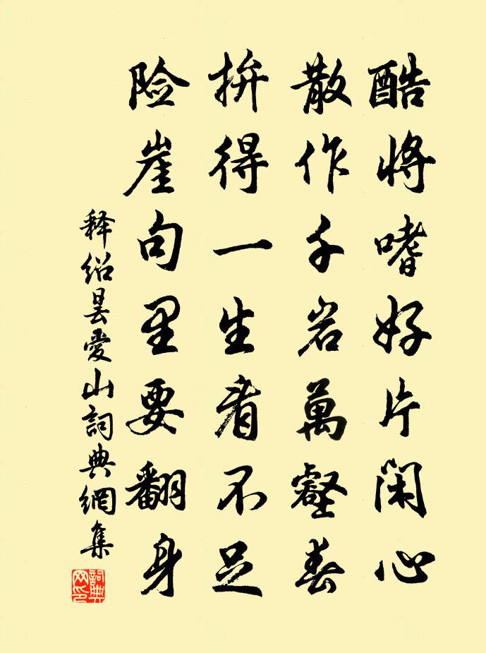 詩詞名句歷史字典書法欣賞書法字典國語詞典說文解字康熙字典古漢語字典標 題 作 者 詩 句 愛山作者:釋紹曇 朝代:宋代愛山原文酷將嗜好片閒心,散作千岩萬壑春。拚得一生看不足,險崖句里要翻身。詩詞問答問:愛山的作者是誰?答:釋紹曇問:愛山寫於哪個朝代?答:宋代釋紹曇愛山書法欣賞愛山書法作品詩詞推薦宮詞三十三首曹勛〔宋代〕元正不賀自清衷,壑札頻頒念兩宮。天相吉音來自北,便知孝悌與天通。和子野四首仇遠〔宋代〕詭遇非吾事,支離笑我身。文章寧可拙,仕宦豈宜貧。鄉故多新鬼,年荒少佚民。休嗟華黍廢,陽穀易回春。夏至過東市二絕洪咨夔〔宋代〕漲落平溪水見沙,綠陰兩岸市人家。晚風來去吹香遠,蔌蔌冬青幾樹花。辛亥二月望祭齋公因游甘園朱繼芳〔宋代〕朝霏作雨連天濕,春氣熏人到骨香。四望水亭無正面,有花多處背湖光。百字歌/自度曲佚名〔宋代〕蓂飛十莢,覺九分秋色,六分將極。桂子風高時更好,天產英賢同日。橋梓齊芳,一慈一孝,奪建真奇特。稱觴華好事近(十二之五)陸游〔宋代〕華表又千年,誰記駕雲孤鶴。回首舊曾游處,但山川城郭。紛紛車馬滿人間,塵土污芒屩。且訪葛仙丹井,看岩花好事近 春寒繼劉君卿韻三首王惲〔元代〕斗柄轉春城,向暖小桃開徹。不似今年正月,過深冬時節。故將新巧發陰機,春事未容說。且就驅雲風帚,埽西山送鄧善這翰林應奉並呈交代汪親家方回〔宋代〕海內師儒四十強,皋比一撤即鵷行。聲名久動黃金闕,相貌宜登白玉堂。真學士當專翰墨,寡言人定鎮岩廊。交承以庭前海棠梨花一枝寄李十九員外韓偓〔唐代〕二月春風澹蕩時,旅人虛對海棠梨。不如寄與星郎去,想得朝回正畫眉。憶秦娥(雪中擁琴對梅花寓言)楊冠卿〔宋代〕東風惡。雪花亂舞穿簾幕。穿簾幕。寒侵綠綺,音斷弦索。宮梅已破香紅萼。梅妝想稱伊梳掠。伊梳掠。十分全似雜詩錢選〔宋代〕青春躍馬兩山間,溪柳岩花動客顏。日落孤城金鐸振,草深荒塚石人閒。庾郎賦就元無味,阮籍途窮且未還。江左朝中措(席上贈南劍翟守)曾覿〔宋代〕雙溪樓上憑欄時。瀲灩泛金卮。醉到鬧花深處,歌聲遏住雲飛。風流太守,鸞台家世,玉鑒丰姿。行奉紫泥褒詔,次韻和酬刁景純春雪戲意梅堯臣〔宋代〕雪與春歸落歲前,曉開庭樹有餘妍。楊花撲撲白漫地,蛺蝶紛紛飛滿天。胡馬嘶風思塞草,吳牛喘月困沙田。我貧卜運算元(立春日賦)汪莘〔宋代〕夏則飲紅泉,冬則餐紅術。一片新春入手來,不費些兒力。春在水無痕,春在山無跡。李白桃紅未吐時,好個春消詩應璩〔魏晉〕郡國貪慕將。馳騁習弓戟。雖妙未更事。難用應卒迫。慶元二年冬後圃蔬莖連理籬楊殊木同枝又蓏生楊簡〔宋代〕兄弟和氣與天通,連理蔬莖瑞郁蔥。造化神機非遠近,不當言異又言同。偈頌一百零二首釋紹曇〔宋代〕活鱍鱍,硬糾糾,明眼人覷不透。剛被春山杜宇知,點血啼清晝。臨風{左足右孛}跳撼坤維,驢前馬後。秋夜有感蘇泂〔宋代〕燈影三更夜,蟲聲四壁秋。雨階疏滴滴,風幔颯悠悠。朋友新凋喪,湖山舊釣游。平生匡復志,老去未能休。卜運算元姜夔〔宋代〕綠萼更橫枝,多少梅花樣。惆悵西村一塢春,開遍無人賞。細草藉金輿,歲歲長吟想。枝上么禽一兩聲,猶似宮娥春題湖上白居易〔唐代〕湖上春來似畫圖,亂峰圍繞水平鋪。松排山面千重翠,月點波心一顆珠。碧毯線頭抽早稻,青羅裙帶展新蒲。未能名句推薦君子不畏虎,獨畏讒夫之口。王充《論衡·卷二十三·言毒篇》 日暮詩成天又雪,與梅並作十分春。盧梅坡《雪梅·其二》 知足者富。強行者有志。不失其所者久。老子《老子·道經·第三十三章》 千里孤墳,無處話淒涼。蘇軾《江城子·乙卯正月二十日夜記夢》 欲知卻老延齡藥,百草摧時始起花。蘇軾《趙昌寒菊》 曾逐東風拂舞筵,樂遊春苑斷腸天。李商隱《柳》 君子以成德為行,日可見之行也。佚名《易傳·文言傳·乾文言》 欲買桂花同載酒,終不似,少年游。劉過《唐多令·蘆葉滿汀洲》 多謝浣紗人未折,雨中留得蓋鴛鴦。鄭谷《蓮葉》 梧桐葉上,點點露珠零。尹鶚《臨江仙·深秋寒夜銀河靜》
