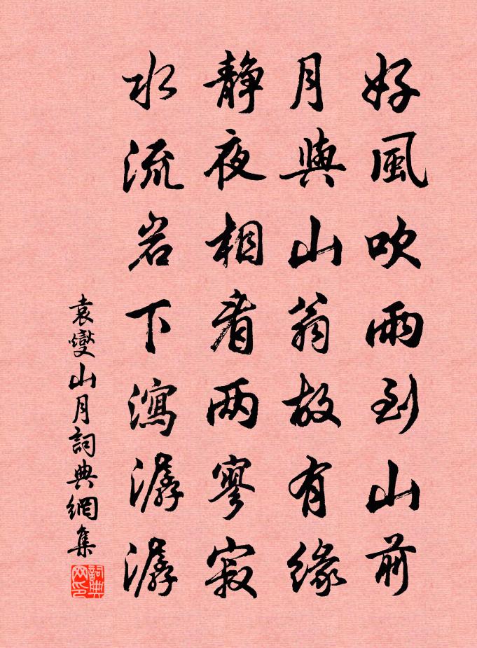 詩詞名句歷史字典書法欣賞書法字典國語詞典說文解字康熙字典古漢語字典標 題 作 者 詩 句 山月作者:袁燮 朝代:宋代山月原文好風吹雨到山前,月與山翁故有緣。靜夜相看兩寥寂,水流岩下瀉潺潺。詩詞問答問:山月的作者是誰?答:袁燮問:山月寫於哪個朝代?答:宋代袁燮山月書法欣賞山月書法作品詩詞推薦除夜白居易〔唐代〕病眼少眠非守歲,老心多感又臨春。火銷燈盡天明後,便是平頭六十人。題陳待制湖樓徐照〔宋代〕天游觀妙化,人世事皆輕。沆瀣藏仙境,津涯截海城。一身潛汗漫,品類仰高明。有道行藏小,無心視聽精。上疑奉和襲美醉中即席見贈次韻張賁〔唐代〕桂枝新下月中仙,學海詞鋒譽藹然。文陣已推忠信甲,窮波猶認孝廉船。清標稱住羊車上,俗韻慚居鶴氅前。共許懷方嚴州仇遠〔宋代〕八十一年亡,哀哉老紫陽。佳兒方戒道,小妾漫專房。每憶先生被,常懷太守章。桐江詩萬首,端可及龜堂。送別陳侍郎應求知泉州林光朝〔宋代〕百片牙旗水面長,蔡邕題在刺桐鄉。十年杯酒開雲榭,一樣官銜過洛陽。我亦攜家緣送客,誰能掃地 * 香。野橋春林張耒〔宋代〕春林露如雨,蕭蕭曉花寒。引手攀高紅,微香來鼻端。何以比芳潔,置之青玉盤。持歸供像佛,相對淡無言。送休公歸衡劉昭禹〔唐代〕草履初登南嶽船,銅瓶猶貯北山泉。衡陽舊寺春歸晚,門鎖寒潭幾樹蟬。送白秀才福州省親梅堯臣〔宋代〕士憂行不修,不憂祿不及。之子久好學,何患名未立。聖時開賢科,子獨不肯入。固非遠仕進,服期難赴集。南歸旌德道中陳天麟〔宋代〕山邑無郵傳,農夫半甲兵。石橋橫斷岸,草逕入荒城。聞道甘泉駕,將臨細柳營。風塵何日靖,留眼看昇平。眉子石硯歌贈胡誾蘇軾〔宋代〕君不見成都畫手開十眉,橫雲卻月爭新奇。遊人指點小顰處,中有漁陽胡馬嘶。又不見王孫青瑣橫雙碧,腸斷浮空峽路山行即事十首袁說友〔宋代〕浩蕩東風晚更嚴,黃埃得得上霜髯。細題今日山中景,更有前頭萬點尖。菩薩蠻蔡伸〔宋代〕金鋪半掩銀瞻滿。個人應恨歸來晚。軋軋櫓聲遲。那知心已飛。迎門一笑粲。嬌困橫波慢。偎倚綠窗前。今宵人月送鄭尚書出鎮南海(各用來字)張籍〔唐代〕遠鎮承新命,王程不假催。班行爭路送,恩賜並時來。牙旆從城展,兵符到府開。蠻聲喧夜市,海色浸潮台。畫角翟簿示似中秋高作命意著語殆與商素爭清讀至史彌寧〔宋代〕歌子秋風疊,誦子明月篇。信有習鑒齒,勝讀書十年。八至李冶〔唐代〕至近至遠東西,至深至淺清溪。至高至明日月,至親至疏夫妻。徐氏太淑人輓辭二首楊萬里〔宋代〕三子官期至,同時各致勤。爭迎阿潘母,獨就大馮君。喜入烏巢舍,驚傅鶴弔墳。傷心是廷尉,目斷太行雲。送何安中之官新安錄事賀鑄〔宋代〕帶郭荒山百匝牢,躋攀幾見病猿猱。官糧可數才雞肋,吏事懸知倍馬曹。芸閣有書行且召,萱堂須養未容高。慶湖紀事二十四首梁啓超〔清代〕一夫一妻世界會,我與瀏陽實創之。尊重公權割私愛,須將身作後人師。書事二首陳造〔宋代〕壯年膚骨已清臞,老去支離轉不如。二十七年扶病過,半緣耽酒半耽書。已亥雜詩 81龔自珍〔清代〕歷劫如何報佛恩,塵塵文字以為門。遙知法會靈山在,八部天龍禮我言。名句推薦明月出天山,蒼茫雲海間。李白《關山月》 丈夫一言許人,千金不易。司馬光《資治通鑑·唐紀二》 衣懶換,酒難賒。可憐此夕看梅花。吳文英《思佳客·癸卯除夜》 九華山路雲遮寺,清弋江村柳拂橋。杜牧《宣州送裴坦判官往舒州時牧欲赴官歸京》 利莫長乎簡,福莫久於安。韓非及後人《韓非子·大體》 草木搖殺氣,星辰無光彩。李白《經亂離後天恩流夜郎憶舊遊書懷贈江夏韋太守良宰》 愛人利人以得福者有矣,惡人賊人以得禍者,亦有矣。墨子《墨子·04章 法儀》 闌風伏雨催寒食,櫻桃一夜花狼藉。納蘭性德《菩薩蠻·闌風伏雨催寒食》 秋菊有佳色,裛露掇其英。陶淵明《飲酒·其四》 善為吏者樹德,不善為吏者樹怨。韓非及後人《韓非子·外儲說左下》