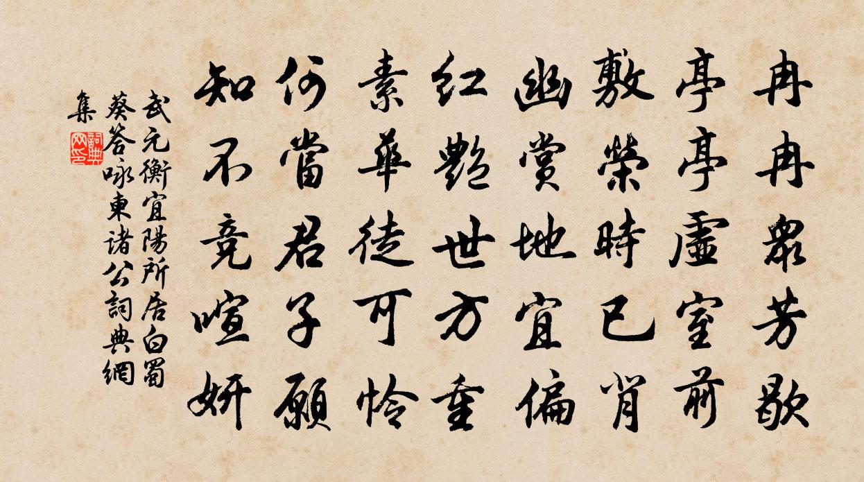 詩詞名句歷史字典書法欣賞書法字典國語詞典說文解字康熙字典古漢語字典標 題 作 者 詩 句 宜陽所居白蜀葵答詠柬諸公作者:武元衡 朝代:唐代宜陽所居白蜀葵答詠柬諸公原文冉冉眾芳歇,亭亭虛室前。敷榮時已背,幽賞地宜偏。紅艷世方重,素華徒可憐。何當君子願,知不競喧妍。詩詞問答問:宜陽所居白蜀葵答詠柬諸公的作者是誰?答:武元衡問:宜陽所居白蜀葵答詠柬諸公寫於哪個朝代?答:唐代問:宜陽所居白蜀葵答詠柬諸公是什麼體裁?答:五律武元衡宜陽所居白蜀葵答詠柬諸公書法欣賞宜陽所居白蜀葵答詠柬諸公書法作品注釋全唐詩:卷316-54詩詞推薦寂歷古關道二首李廌〔宋代〕寂歷古關道,曉煙寒未分。愁情滿秋草,歸思隔黃雲。客路自多感,宿酲猶帶醺。蕭蕭倦遊意,況可久離群。光福塘上范成大〔宋代〕指點炊煙隔莽蒼,午餐應可寄前莊。雞聲人語小家樂,木葉草花深巷香。春去已空衣尚絮,雨來何晚稻初芒。祗今和寄苕溪故人趙希逢〔宋代〕摶砂聚散易西東,覽鏡顏非舊日紅。千里雁郵成杳杳,百年駒隙去匆匆。暮雲杜憶謫仙子,夜雪王思安道公。蠶室初陽台董嗣杲〔宋代〕寶山山頂結芙蓉,方士凌虛幾御風。日月光華含吐異,雲萍蹤跡往來空。石盤草子粘深碧,土級苔花剝碎紅。側近詠素蝶詩劉孝綽〔南北朝〕隨蜂繞綠蕙,避雀隱青薇。映日忽爭起,因風乍共歸。出沒花中見,參差葉際飛。芳華幸勿謝,嘉樹欲相依。自詠唐彥謙〔唐代〕白髮三千丈,青春四十年。兩牙搖欲落,雙膝痺如攣。強仕非時彥,無聞惜昔賢。自期終見惡,未忍舍遺編。滿庭芳佚名〔宋代〕五十年來,追思疇曩,佳時去若雲浮。依然重見,感涕話西州。幸喜靈光不改,空自笑、蒲柳先秋。成何事,風波送趙澤石介〔宋代〕子來入吾圃,才食一寸苗。未足充子復,飢腸猶枯焦。玉山禾粒大如棗,食之令人身肥饒。留以侍鳳凰,不將食鴟賀德慶陳倅生朝曾豐〔宋代〕無伏無臘壺中天,不煙不火壺中仙。壺天因自遠世界,壺仙還自結世緣。昨夜壺公山外望,壺公駕鶴隨仙仗。逃身草丁謂〔宋代〕葭茁迎春早,山芮得地高。堪書同細帶,入詠似青袍。弱力綿綿葛,微香蓼蓼莪。王孫何處在,楚思遍江皋。呈陳深交二首趙蕃〔宋代〕役役到番國,悠悠誰故人。僧房半牢落,湖水失清淪。我豈倚樓趙,君真驚座陳。何為辱傾倒,相與盡情親。北風楊萬里〔宋代〕山雨無休歇,江雲政郁蔥。如何急灘水,更著打頭風。草作傷心碧,花能可意紅。一年春好處,卻在道塗中。江鄉丘葵〔宋代〕蘆荻叢邊日正長,人間樂處是江鄉。溪童釣艇分魚鬧,蠶婦山爐煮繭香。疏雨漏天青破碎,衝風滾浪白猖狂。鷗沙故白岩禪師院王魯復〔唐代〕能師還世名還在,空閉禪堂滿院苔。花樹不隨人寂寞,數枝猶自出牆來。榜書軒曰景白以爐香事樂天像因題詩六韻其上張鎡〔宋代〕賢如文正及文忠,迂叟東坡盡學公。自願人才雖太遠,仰希閒樂或相同。墅邱寺觀游須遍,台榭舟橋樂未窮。酩酊贊齡叟留東隱二首陳著〔宋代〕一片丹山雲出山,慈雲高處共清閒。春風輕借吹噓力,出本無心也會還。瑞鶴仙(贈道女陳華山內夫人)吳文英〔宋代〕彩雲棲翡翠。聽鳳笙吹下,飛軿天際。晴霞剪輕袂。澹春姿雪態,寒梅清泚。東皇有意。旋安排、闌乾十二。早不菩薩蠻劉學箕〔宋代〕暮濤掀浪溪流急。單衣未試春寒力。是處綠陰濃。春深楊柳風。人依溪岸住。酒美忘歸去。巢燕墮芹泥。幽禽花外選人歌佚名〔唐代〕今年選數恰相當,都由座主無文章。案後一腔凍豬肉,所以名為姜侍郎。寢夜杜牧〔唐代〕蛩唱如波咽,更深似水寒。露華驚弊褐,燈影掛塵冠。故國初離夢,前溪更下灘。紛紛毫髮事,多少宦遊難。名句推薦一手獨拍,雖疾無聲。韓非及後人《韓非子·功名》 夜吟敲落霜紅,船傍楓橋系。吳文英《荔枝香近·送人游南徐》 雨蓑煙笠嚴陵近,慚愧清流照客顏查慎行《雨過桐廬》 澤國江山入戰圖,生民何計樂樵蘇。曹松《己亥歲二首·僖宗廣明元年》 虛負凌雲萬丈才,一生襟抱未曾開。崔珏《哭李商隱》 高田如樓梯,平田如棋局。楊慎《出郊》 佳人獨立相思苦。薄袖欺寒脩竹暮。劉鎮《玉樓春·東山探梅》 料峭春寒中酒,交加曉夢啼鶯。吳文英《風入松·聽風聽雨過清明》 向河梁、回頭萬里,故人長絕。辛棄疾《賀新郎·別茂嘉十二弟》 更傾寒食淚,欲漲冶城潮。王安石《壬辰寒食》