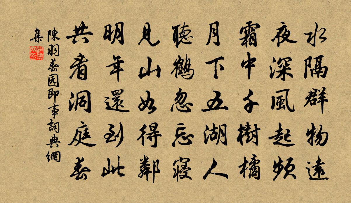詩詞名句歷史字典書法欣賞書法字典國語詞典說文解字康熙字典古漢語字典標 題 作 者 詩 句 春園即事作者:陳羽 朝代:唐代春園即事原文水隔群物遠,夜深風起頻。霜中千樹橘,月下五湖人。聽鶴忽忘寢,見山如得鄰。明年還到此,共看洞庭春。詩詞問答問:春園即事的作者是誰?答:陳羽問:春園即事寫於哪個朝代?答:唐代問:春園即事是什麼體裁?答:五律陳羽春園即事書法欣賞春園即事書法作品注釋全唐詩:卷348-9詩詞推薦京口王同祖〔宋代〕晚風來候過淮舟,閒上南徐多景樓。落日寒城伴荒草,江南人指是瓜洲。已亥雜詩 202龔自珍〔清代〕料理空山頗費才,文心兼似畫家來。矮茶密緻高松獨,記取先生親手栽。長安書事張喬〔唐代〕出送鄉人盡,滄洲未得還。秋風五陵樹,晴日六街山。有景終年住,無機是處閒。何當向雲外,免老別離間。先天易吟三十首方回〔宋代〕水平民不溺,谷播世無飢。氣數如寒暑,能無理轉移。糖多令 寄吳間張伯淳〔元代〕移住還瀛洲。天槎去莫留。數歸期、已過中秋。上界群仙官府足,雲不礙,水長流。酒令與詩籌。依然記舊遊。倚奉酬臞菴李侍郎白玉蟾〔宋代〕全是山林居士風,不知位重更官穹。名書玉幾金甌內,心在 * 紙帳中。靈石日長老訪留之樗庵劉克莊〔宋代〕妄念已知今世錯,勤修別結後身緣。尺三汗腳踏龍尾,丈六金身坐象筵。昔趁蛾眉班謁帝,今從牛矢路歸田。未知和運司園亭翠錦亭孫甫〔宋代〕森森棟樑材,駢空翥鸞鳳。危亭抅其間,曾不礙梁棟。檐陰織翠紋,砌溜諧清弄。攤飯宜晝眠,一枕華胥夢。南鄉子歐陽修〔宋代〕雨後斜陽。細細風來細細香。風定波平花映水,休藏。照出輕盈半面妝。路隔秋江。蓮子深深隱翠房。意在蓮心無水邊聞雁宋伯仁〔宋代〕蘆花新有雁,四面水連天。清淨非人世,吾詩詠不全。趙少師自南都訪歐陽少師於潁州留西湖久之作蘇轍〔宋代〕公居潁水上,德與潁水清。身閒道轉勝,內足無復營。平昔富交遊,開門坐常盈。退居萬事樂,獨恨無友生。汝潁江城子 西山之通仙觀,卜以重陽作醮。前數尹志平〔元代〕微作,眾意憂惶。八日發牒之後,俄而開霽,雨畫夜畢。十日險雪復作,萬古一辭,讚嘆有勝緣。因作一詞,以紀送雅上人自鄞歸杭釋文珦〔宋代〕之子幡然別,何人伴寂寥。相從非世道,獨去是寒朝。目送孤帆遠,魂隨曉浪消。重來須定約,莫待隔江招。代張元老上許漕李新〔宋代〕人生刊維久覆醯,故教使節出天西。後來武庫成清職,平日家風歸品題。欲見流錢憑馬策,稍聞刮膜待金篦。鴒原術人求頌釋曇華〔宋代〕造化村誰手,君來聊解顏。欲游天上路,先破鬼門關。禍福行藏內,高低方寸間。毫芒差錯處,過犯重如山。夜飛鵲/夜飛鵲慢張艾〔宋代〕霓裳按歌地,涼影參差。還是佩解江湄。滄波正洗襪塵恨,流霞空沁銖衣。盈盈半輸笑,向朱闌凝佇,欲訴心期。酬樂天嘆窮愁見寄元稹〔唐代〕病煎愁緒轉紛紛,百里何由說向君。老去心情隨日減,遠來書信隔年聞。三冬有電連春雨,九月無霜盡火雲。並與鷓鴣天晏幾道〔宋代〕曉日迎長歲歲同。太平簫鼓間歌鐘。雲高未有前村雪,梅小初開昨夜風。羅幕翠,錦筵紅。釵頭羅勝寫宜冬。從今添盆中石菖蒲水仙花水楊萬里〔宋代〕舊詩一讀一番新,讀罷昏然一欠伸。無數盆花爭訴渴,老夫卻要作閒人。寄人朱槔〔宋代〕一牛鳴地兩禪林,霧雨初晴翠靄深。熟路緣溪穿窈窕,疏鍾喚客出嶇嶔。未求黃捲成功處,且辦青山避世心。悵望名句推薦三姑六婆,實淫盜之媒;婢美妾嬌,非閨房之福。朱柏廬《朱子家訓·全文》 試上吳門窺郡郭,清明幾處有新煙。張繼《閭門即事》 內不失真,而外不殊俗王通《中說·卷六·禮樂篇》 雨洗娟娟淨,風吹細細香。杜甫《嚴鄭公宅同詠竹》 衙齋臥聽蕭蕭竹,疑是民間疾苦聲。鄭燮《濰縣署中畫竹呈年伯包大中丞括 / 墨竹圖題詩》 京口瓜洲一水間,鐘山只隔數重山王安石《泊船瓜洲》 近水知魚性,近山識鳥音。佚名《增廣賢文·上集》 記年時、舊宿淒涼,暮煙秋雨野橋寒。吳文英《霜花腴·重陽前一日泛石湖》 曉鏡但愁雲鬢改,夜吟應覺月光寒。李商隱《無題·相見時難別亦難》 游女昔解佩,傳聞於此山孟浩然《萬山潭作》