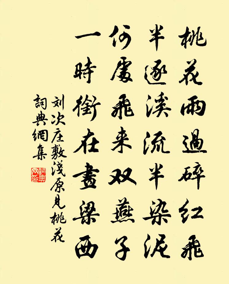 桃花雨過碎紅飛,半逐溪流半染泥。何處飛來雙燕子,一時銜在畫梁西。