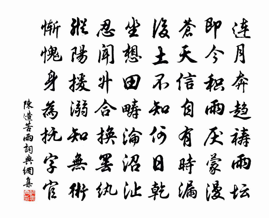 詩詞名句歷史字典書法欣賞書法字典國語詞典說文解字康熙字典古漢語字典標 題 作 者 詩 句 苦雨作者:陳造 朝代:宋代苦雨原文連月奔趨禱雨壇,即今積雨厭蒙漫。蒼天信自有時漏,后土不知何日乾。坐想田疇淪沼沚,忍聞升合換罷紈。縱陽援溺知無術,慚愧身為撫字官。詩詞問答問:苦雨的作者是誰?答:陳造問:苦雨寫於哪個朝代?答:宋代陳造苦雨書法欣賞苦雨書法作品詩詞推薦滿江紅佚名〔宋代〕指日中秋,便滿目、蟾光如洗。又還竹溪溪上,長庚瑞世。事業權與韓范輩,文章拍調蘇黃里。借北來雙鶴壽芳筵翁媼行洪咨夔〔宋代〕翁頭白如銀,媼頭黃如金。抵足搔瘡昏到明,羞殺敗布多年衾。晴窗嬉子懸瀰和荊公二首姜特立〔宋代〕老去生涯華子岡,年來得夫一繩床。是非堯桀何須較,身世於今更兩忘。聞杜宇宋祁〔宋代〕傳聞望帝冤,底處最堪憐。蜀月將殘夜,巴山欲曉天。周軍嘗化鶴,齊後亦為蟬。物變皆如此,非君是偶然。杜牧圖唐寅〔明代〕司空幕府逼晨開,平善街頭日夜來。肯信璚花舊遊處,至今猶唱紫雲回。次韻和吳侍郎和沖卿寄來詩二首宋庠〔宋代〕暫息塵機不為年,高風聊借九區傳。周聃漢朔誰能測,且作清時吏隱仙。寄台州使君五首舒坦〔宋代〕幾夜驪珠落蔀家,直疑光焰映朝霞。彩毫寫就千篇賦,紅燭才燒一寸花。卓犖高 * 飛動,淋浪醉墨半欹斜。陽春禪道同功修養訣晃逈〔宋代〕心息相依,息調心靜。靜調久久,可成勝定。神氣相合,氣和神清。清和久久,可致長生。送陳必強赴宜春理官掾三絕廖行之〔宋代〕萬頃煙光入客舟,不堪風雨擾離愁。殷勤小竚江頭話,試問垂楊可系不。訪人不遇留別館李商隱〔唐代〕卿卿不惜鎖窗春,去作長楸走馬身。閒倚繡簾吹柳絮,日高深院斷無人。生查子·元夕朱淑真〔宋代〕去年元夜時,花市燈如晝。月上柳梢頭,人約黃昏後。今年元夜時,月與燈依舊。不見去年人,淚濕春衫袖。紹興祀太社太稷十七首佚名〔宋代〕[函鍾為宮]功烈在民,誕受露雨。良耜既歌,乃揚帗舞。是奉是尊,厚禮斯舉。相其豈年,多府稌多黍。煉丹井陳岩〔宋代〕閒中惟有高低枕,老去寧無內外丹。千載稚川今往矣,誰言古井不生瀾。寄遠曲張籍〔唐代〕美人來去春江暖,江頭無人湘水滿。浣沙石上水禽棲,江南路長春日短。蘭舟桂楫常渡江,無因重寄雙瓊璫。厭氣台梁顥〔宋代〕天生王氣何能厭,嬴氏空勞築此台。今日我來台上看,殘春寂寞野花開。田家司馬光〔宋代〕未塞誼人奪,何言訟賦收。皇心雖惻隱,蓬戶或焦愁。為吏空多祿,無人能此憂,知君坐公府,他日富民侯。過叢桂堂太叔祖教授讀書之所吳儆〔宋代〕古瓦頹垣跡已陳,孤猿別鶴自哀吟。可憐叢桂煙蕪沒,惟有一池春水深。秀木千章新過雨,寒山一帶暮傷心。清風句溫益〔宋代〕潮回畫楫三千隻,春滿紅樓十萬家。滕王閣下賦樂雷發〔宋代〕越郍蜀艇亂相偎,風飽千帆帶雨開。閣上鳴鑾今已往,江頭飛鶩只堪哀。柳汀絮滿河豚賤,桃塢花殘石首來。應接西齋秋晚宋祁〔宋代〕霜華零暮節,日氣淡長穹。池減無留潦,林寒少罷風。蟲鳴星杼促,蟬起露緌空。隱几無紛慮,窺園嗜晚菘。名句推薦吾於天下,無去也,無就也,惟道之從。王通《中說·卷二·天地篇》 至人天隱,其次地隱,其次名隱。王通《中說·卷四·事君篇》 窮猿投林,豈暇擇木!房玄齡《晉書·列傳·第六十二章》 攀荷弄其珠,蕩漾不成圓。李白《折荷有贈》 烹羊宰牛且為樂,會須一飲三百杯。李白《將進酒》 樓前柳,憔悴幾秋風。賀鑄《小重山·花院深疑無路通》 觀棋不語真君子,把酒多言是小人。馮夢龍《醒世恆言·卷九》 南山與秋色,氣勢兩相高。杜牧《長安秋望》 中池所以綠,待我泛紅光。沈約《詠芙蓉》 從善如順流,去惡如探湯。房玄齡《晉書·列傳·第五十七章》