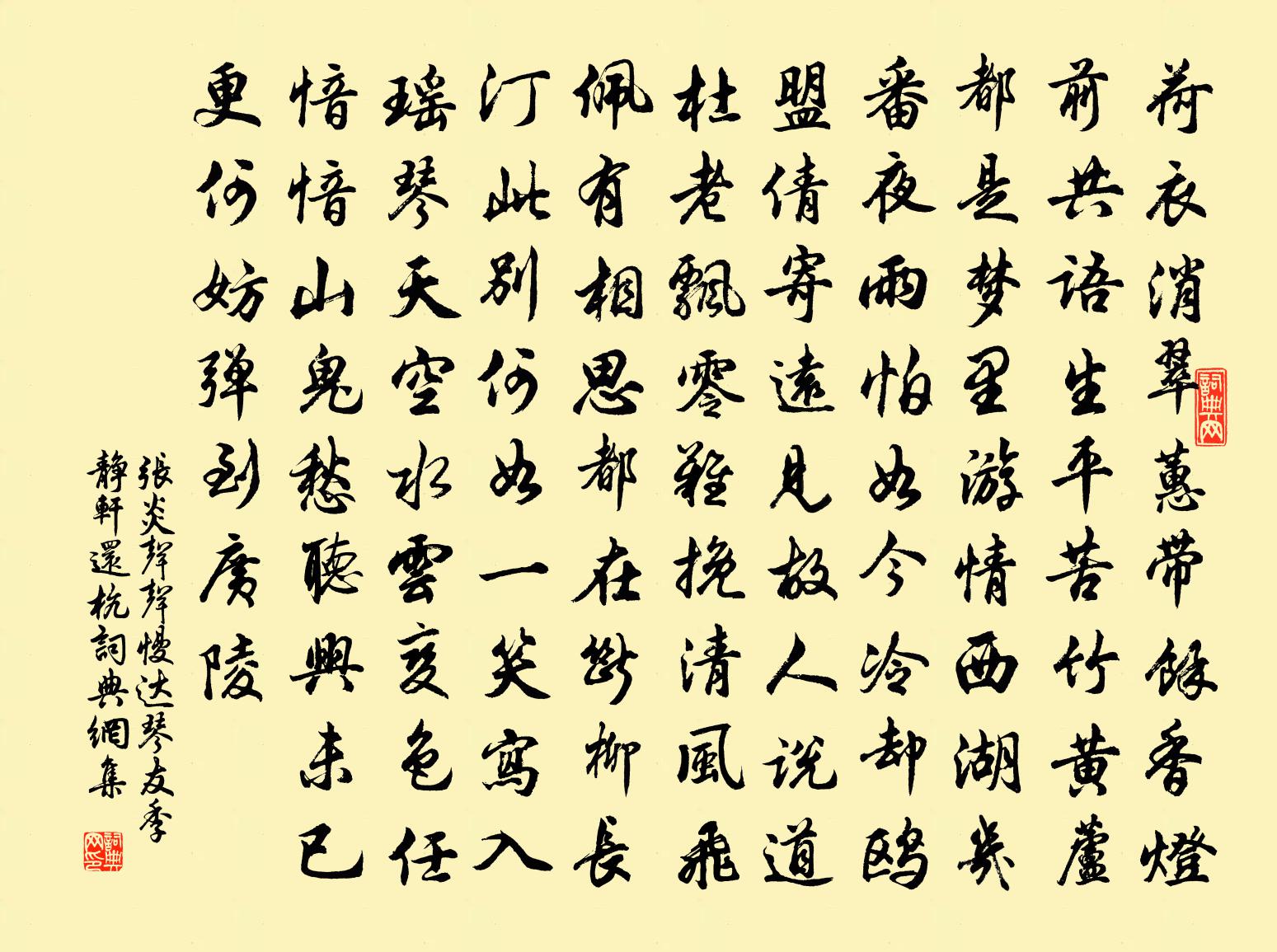 荷衣消翠,蕙帶餘香,燈前共語生平。苦竹黃蘆,都是夢裡游情。西湖幾番夜雨,怕如今、冷卻鷗盟。倩寄遠,見故人說道,杜老飄零。