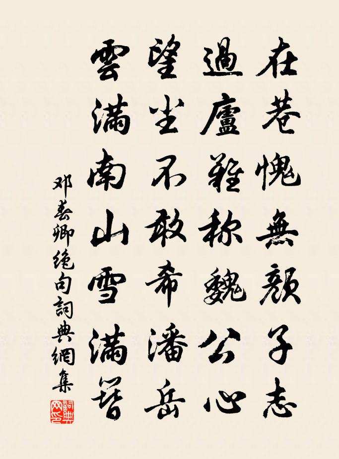 詩詞名句歷史字典書法欣賞書法字典國語詞典說文解字康熙字典古漢語字典標 題 作 者 詩 句 絕句作者:鄧春卿 朝代:宋代絕句原文在巷愧無顏子志,過廬難稱魏公心。望塵不敢希潘岳,雲滿南山雪滿簪。詩詞問答問:絕句的作者是誰?答:鄧春卿問:絕句寫於哪個朝代?答:宋代鄧春卿絕句書法欣賞絕句書法作品詩詞推薦釣渚詩李廌〔宋代〕釣渚平過水,筆溪清見底。寒煙曉冥冥,白石明齒齒。目送歸鴻飛,游心志鱣鮪。手應心不疑,物我相諾唯。黃雀晝臥口占三首張耒〔宋代〕甘風遠集聞朝嘒,怨月深棲有夜鳴。涼牖疏明稀老翠,雨畦幽獨立新清。暮春寄懷曹南通任寺丞林逋〔宋代〕跌盪情懷每事同,十年曹社 * 。彈弓園圃陰森下,棋子廳堂寂靜中。赤腳我猶無一婢,黑頭君合作三公。江湖建炎庚戌中秋夜與同官相期於月下既為頑雲障馮時行〔宋代〕散懷誰與儔,風月茲吾賞。好景會人心,宿約每不爽。蓐收濺明河,玉露洗穹壤。肅肅夜氣寂,皎皎素沆漭。飛出暮春遊卞氏園韓維〔宋代〕路出清陰下,殘花著馬蹄。過城春水靜,度墅野橋低。池廢青苹合,林深綠筍齊。流鶯知我恨,落日再三啼。漁父杜牧〔唐代〕白髮滄浪上,全忘是與非。秋潭垂釣去,夜月叩船歸。煙影侵蘆岸,潮痕在竹扉。終年狎鷗鳥,來去且無機。重九即席點韻趙必象〔宋代〕淵明我輩人,豈為口體累。歸歟三逕秋,清吟發幽寄。醒肯對黃花,陶然已心醉。世俗兒女情,飲菊萸系臂。長房正月十六日蘇轍〔宋代〕上元已過欲收燈,城郭遊人一倍增。陌上紅塵霏似霧,雲間明月冷如冰。誰言世上驅馳客,老作庵中寂定僧。漏水題三士軒詩郭印〔宋代〕獨立未為真,萬法皆吾侶。故於竹柏間,強名相爾汝。薊丘覽古贈盧居士藏用七首。郭隗陳子昂〔唐代〕逢時獨為貴,歷代非無才。隗君亦何幸,遂起黃金台。(末缺)滿江紅 廉野雲左揆求賦南園 慶雲都城善姚燧〔元代〕面勢林塘,緊橫睫、觚稜如削。還更比、城南韋杜,去天盈握。便有名園能甲乙,他山**先尊岳。甚一花一石,衲衣示眾釋印肅〔宋代〕一個閒身包萬有,不能自把著針縫。眾緣聚衲須微細,妙相莊嚴一大通。下下針鋒無不實,條條線貫不空空。連天仙山詩 一庾信〔南北朝〕金灶新和藥。銀台舊聚神。相看但莫怯。先師應識人。省試恩賜耆老布帛(一作崔宗詩)李絳〔唐代〕渙汗中天發,殊私海外存。衰顏逢新地,華發受皇恩。燭物明堯日,垂衣辟禹門。惜時悲落景,賜帛慰余魂。厚澤憶杭州西湖范仲淹〔宋代〕長憶西湖勝鑑湖,春波千頃綠如鋪。吾皇不讓明皇美,可賜疏狂賀老無。池鶴八絕句。烏贈鶴白居易〔唐代〕與君白黑大分明,縱不相親莫見輕。我每夜啼君怨別,玉徽琴里忝同聲。送僧歸護國志祖士衡〔宋代〕雪中問法傳宗印,日暮裁詩變楚騷。香積諸天修淨供,蒲茸三殿賜新袍。夜禪錫駐青鴛剎,曉渡杯陵白露濤。參罷宿青龍寺故曇上人院耿湋〔唐代〕年深宮院在,閒客自相逢。閉戶臨寒竹,無人有夜鍾。降龍今已去,巢鶴竟何從。坐見繁星曉,淒涼識舊峰。偈頌一百五十首釋心月〔宋代〕我有一言,徹根徹源。舉之不全,聽之不圓。擬問如何,蒼天蒼天。排悶陸游〔宋代〕丈夫結髮志功名,大事真當以死爭。我昔駐車籌筆驛,孔明千載尚如生。名句推薦歸來三徑重掃,松竹本吾家。葉夢得《水調歌頭·秋色漸將晚》 折戟沉沙鐵未銷,自將磨洗認前朝。杜牧《赤壁》 自是相思抽不盡,卻教風雨怨秋聲。鄭燮《詠芭蕉》 神龜雖壽,猶有竟時。曹操《龜雖壽》 聞說東風亦多情,被竹外、香留住。史達祖《留春令·詠梅花》 萬事一身傷老矣,戎葵凝笑牆東。陳與義《臨江仙·高詠楚詞酬午日》 明月照積雪,朔風勁且哀。謝靈運《歲暮》 接漢疑星落,依樓似月懸。盧照鄰《十五夜觀燈》 榮所眾羨,亦引眾怨。來俊臣《羅織經·固榮卷第六》 黃河水繞漢宮牆,河上秋風雁幾行。李夢陽《秋望》