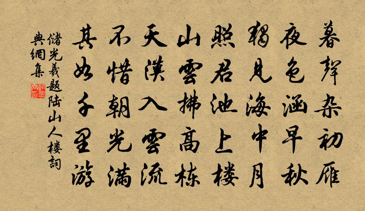 詩詞名句歷史字典書法欣賞書法字典國語詞典說文解字康熙字典古漢語字典標 題 作 者 詩 句 題陸山人樓作者:儲光羲 朝代:唐代題陸山人樓原文暮聲雜初雁,夜色涵早秋。獨見海中月,照君池上樓。山雲拂高棟,天漢入雲流。不惜朝光滿,其如千里游。詩詞問答問:題陸山人樓的作者是誰?答:儲光羲問:題陸山人樓寫於哪個朝代?答:唐代問:題陸山人樓是什麼體裁?答:五古儲光羲題陸山人樓書法欣賞題陸山人樓書法作品注釋全唐詩:卷136_22詩詞推薦句歐良〔宋代〕璧固君所寄,鏡亦妾所惜。乍可返君璧,妾鏡不可得。漁父詞一十八首沐浴呂岩〔唐代〕卯酉門中作用時,赤龍時蘸玉清池。雲薄薄,雨微微,看取妖容露雪肌。夏日集李司直縱溪齋皎然〔唐代〕修景屬良會,遠飆生煩襟。泄雲收淨綠,眾木積芳陰。疏滌府中務,迢遙湖上心。習閒得招我,賞夜宜泛琴。山近池州和同官詠梅花張道洽〔宋代〕古蘚獲疎枝,幽花發短籬。叭宜霜月照,莫遣雪風知。數點玲瓏玉,三生灑落姿。自從窗外見,風味至今思。偈頌一百零九首釋可湘〔宋代〕劄住智者頰舌,剖出達磨骨髓。長劍倚天,寒光焰焰。緋桃潘牥〔宋代〕一枝才破便精神,直是猩猩血染成。休逐東風貪結子,玉環上已妒傾城。玉堂感舊宋祁〔宋代〕七年辭玉署,再入佐黃扉。樹與青春換,人將素領歸。磚花仍可記,廈雀稍驚飛。爐蕙非無意,逢人尚襲衣。送簡賀州五首舒邦佐〔宋代〕朔風撼木落,莫驚客店霜。桂林雪片深,成都碧雞坊。西南幕中去,尚趣萬里裝。今乘刺史車,何嫌驛路長。開塗田道者求語釋亮〔宋代〕大海波濤涌,道人願力堅。當頭一截斷,萬頃看平田。依韻奉和司徒侍中仲春釋奠強至〔宋代〕先聖祠逾重,尊儒世適丁。上公儀最熟,太學祭頻經。曉月衣冠淨,春風俎豆馨。魏人休請頌,在泮已言形。歡喜口號黃彥平〔宋代〕侍臣祗道天顏喜,掩骼還俘更苦心。邊戍要教迎刃解,聖恩先作漏泉深。鷓鴣天(月夜諸院飲酒行令)趙長卿〔宋代〕寶篆煙消香已殘。嬋娟月色浸欄乾。歌喉不作尋常唱,酒令從他各自還。傳杯手,莫教閒。醉紅潮臉媚酡顏。相攜古斷腸曲三十首周端臣〔宋代〕裛裛羅巾淚粉光,綠琴哀怨調淒涼。芳容自覺隨風老,落盡桃花暗斷腸。南陵道中迫暮投茅店四圍率敗籬令僕夫環臥吳龍翰〔宋代〕故山三百里,歸路正羊腸。密樹標茅店,荒池界竹牆。仆眠如鹿伏,我倦背龜藏。素志非南阮,丈夫掃八荒。雜興十首劉克莊〔宋代〕典領天書使,修崇昭應祠。可憐有遺恨,殮不得髠緇。次韻元厚之少保留題朱伯原秘校園亭三首程師孟〔宋代〕碧瓦春城十萬家,可憐夫子獨堪嗟。園林猶有前朝木,冠蓋難尋故主花。亭瞰夕陽鄰古剎,池通野水見晴沙。天然贄林路教楊公遠〔宋代〕千載孤山處士星,只將閒孫聲最清。泮水工夫施教雨,梅花標格待和羹。不知野叟何緣分,邂逅城闉幸識荊。自哂陳藻〔宋代〕自小何曾識帝鄉,姓名卻掛武林廂。祝融今歲為災甚,亦費貲糧奔走忙。涵碧亭三首曹冠〔宋代〕杖藜乘興縱幽尋,野寺松篁藹翠陰。流水潺湲如有恨,白雲舒捲本無心。龍鍾誰識天津叟,高臥曾為梁甫吟。靜秦賦禮記李百藥〔唐代〕玉帛資王會,郊丘葉聖情。重廣開環堵,至道軼金籝。盤薄依厚地,遙裔騰太清。方悅升中禮,足以慰餘生。名句推薦河邊獨自看星宿,夜織天絲難接續。王建《七夕曲》 好水好山看不足,馬蹄催趁月明歸。岳飛《池州翠微亭》 桃花三十六陂,鮫宮睡起,嬌雷乍轉。吳文英《瑞龍吟·德清清明競渡》 君子之所貴者,遷善懼其不及,改惡恐其有餘。徐幹《中論·上卷·虛道》 曲終漏盡嚴具陳,月沒星稀天下旦。佚名《雞鳴歌》 終古閒情歸落照,一春幽夢逐遊絲。納蘭性德《浣溪沙·楊柳千條送馬蹄》 夢裡相思,故國王孫路。陳子龍《點絳唇·春日風雨有感》 牆角數枝梅,凌寒獨自開。王安石《梅花 / 梅》 又聞子規啼夜月,愁空山李白《蜀道難》 慷慨惟平生,俯仰獨悲傷。陸機《門有車馬客行》