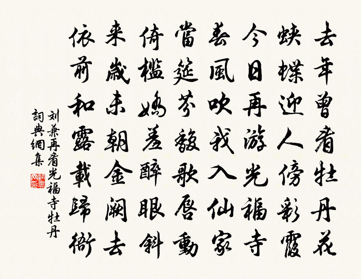 詩詞名句歷史字典書法欣賞書法字典國語詞典說文解字康熙字典古漢語字典標 題 作 者 詩 句 再看光福寺牡丹作者:劉兼 朝代:唐代再看光福寺牡丹原文去年曾看牡丹花,蛺蝶迎人傍彩霞。今日再游光福寺,春風吹我入仙家。當筵芬馥歌唇動,倚檻嬌羞醉眼斜。來歲未朝金闕去,依前和露載歸衙。詩詞問答問:再看光福寺牡丹的作者是誰?答:劉兼問:再看光福寺牡丹寫於哪個朝代?答:唐代問:再看光福寺牡丹是什麼體裁?答:七律劉兼再看光福寺牡丹書法欣賞再看光福寺牡丹書法作品注釋全唐詩:卷766-57詩詞推薦送陳幾叟南歸楊時〔宋代〕幾年夢想到親闈,身逐行雲萬里飛。苕水未殊沂上樂,春風無負舞雩歸。某敬采民言成六韻為安撫閣老尚書壽伏幸過目張栻〔宋代〕清坐鈴齋公事稀,春來風日更遲遲。胸中水鏡渠自避,卻笑缿筒徒徒爾為。題蘭陵稅官清輝亭李處權〔宋代〕不謂人間世,官居有此清。山橫猶倒影,鳥過忽遺聲。倦客方躭句,高人不治名。夜寒雲去書,對面月華生。留別山中溫古上人兄並示舍弟縉王維〔唐代〕解薜登天朝。去師偶時(一作將)哲。豈惟山中人。兼負松上月。宿昔同游止。致身雲霞末。開軒臨潁陽。臥視飛胡笳十八拍第十六拍劉商〔唐代〕去時只覺天蒼蒼,歸日始知胡地長。重陰白日落何處,秋雁所向應南方。平沙四顧自迷惑,遠近悠悠隨雁行。征途鵲橋仙(鄉守趙計院生日)劉克莊〔宋代〕蒲鞭漸弛,缿筒漸少,安用知他簾外。從今也莫察淵魚,做到不忍欺田地。四民香火,五營笳吹,來獻一杯壽水。李固渡范成大〔宋代〕洪河萬里界中州,倒卷銀潢聒地流。列弩燔梁那可渡?向來天數亦人謀!池上別友人釋文珦〔宋代〕今朝攜手處,高榭俯風漪。正爾俱衰暮,寧堪又別離。柳長深映馬,荷弱未勝龜。它日遙相憶,還應話此時。偈頌七十六首釋師觀〔宋代〕我有一轉語,歷劫常如此。迥絕無人和,聚頭相共舉。玉樓春歐陽修〔宋代〕常憶洛陽風景媚。煙暖風和添酒味。鶯啼宴席似留人,花出牆頭如有意。別來已隔千山翠。望斷危樓斜日墜。關心寄湯伯紀侍郎二首劉克莊〔宋代〕仗下鳴曾驚眾聽,省中語不願人傳。騷留屈子芳菲在,史視胡公糞土然。士到後凋方見節,世除勇退別無仙。遙知此夕劉筠〔宋代〕南州石黛有遺妍,目極危梯月上弦。一水相忘空脈脈,雙金何路致拳拳。仙源日永桃無援,客館春輕柳未眠。欲寫徐成之園亭三詠竹徑桃花孔武仲〔宋代〕闢地不盈畝,點綴成阻修。相招竹林逸,更作桃源游。綽約新飲露,琅玕曾倚秋。春風盪人意,此境獨清幽。湖南江西道中十首劉克莊〔宋代〕派里人人有集開,競師山谷友誠齋。只饒白下騎驢叟,不敢勾牽入社來。良佐留別詩頗悽惋次韻敘閒居之樂以釋之二首陶夢桂〔宋代〕困人天氣晝沉沉,飯罷茶甌盡放深。笑領故人游竹洞,因尋詩句到梅林。已教兒去將詩寫,又喚孫來把酒斟。行樂予以甲寅冬過弋陽石橋戊辰正月重過陳杰〔宋代〕周行淮漢萬山川,重此經過十五年。野老眉間新世事,蹇驢背上舊吟鞭。幾分春色梅花後,一片歸心杜宇前。深谷和帥座勸農三首趙善括〔宋代〕指日追鋒數驛亭,論恩便合對丹屏。行看功業欣天地,陳跡俱堪入汗青。李伯紀丞相輓詩趙令衿〔宋代〕鯨路心猶望,龍門跡已荒。樓成上霄漢,書擬奏明光。賤子無賢譽,先生獨薦揚。凜然生氣在,誰謂哲人亡。病中上錢尚父羅隱〔唐代〕左腳方行右臂攣,每慚名跡污賓筵。縱饒吳土容衰病,爭奈燕台費料錢。藜杖已乾難更把,竹輿雖在不堪懸。深恩中書遇雨錢起〔唐代〕濟旱惟宸慮,為霖即上台。雲銜七曜起,雨拂九門來。綸閣飛絲度,龍渠激霤回。色翻池上藻,香裛鼎前杯。湘燕名句推薦寢興目存形,遺音猶在耳。潘安《悼亡詩三首》 歲歲金河復玉關,朝朝馬策與刀環。柳中庸《征人怨 / 征怨》 腸斷月明紅豆蔻,月似當時,人似當時否?納蘭性德《鬢雲松令·枕函香》 最愛東山晴後雪,軟紅光里涌銀山。楊萬里《最愛東山晴後雪》 霖雨泥我塗,流潦浩縱橫。曹植《贈白馬王彪·並序》 向來吟秀句,不覺已鳴鴉。韓翃《酬程延秋夜即事見贈》 天秋木葉下,月冷莎雞悲。李白《秋思》 桑之未落,其葉沃若。佚名《氓》 世有無妄之福,又有無妄之禍。劉向《戰國策·楚四·楚考烈王無子》 唯天下至誠,為能盡其性;能盡其性,則能盡人之性。子思《中庸·第二十二章》