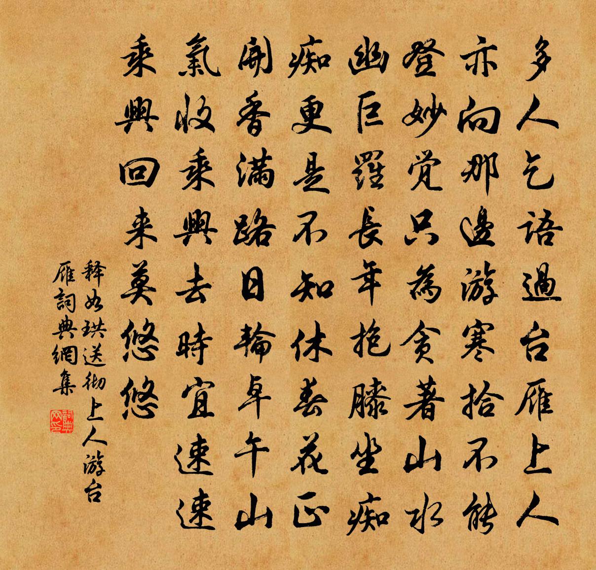 詩詞名句歷史字典書法欣賞書法字典國語詞典說文解字康熙字典古漢語字典標 題 作 者 詩 句 送徹上人游台雁作者:釋如珙 朝代:宋代送徹上人游台雁原文多人乞語過台雁,上人亦向那邊游。寒拾不能登妙覺,只為貪著山水幽。巨羅長年抱膝坐,痴痴更是不知休。春花正開香滿路,日輪卓午山氣收。乘興去時宜速速,乘興回來莫悠悠。詩詞問答問:送徹上人游台雁的作者是誰?答:釋如珙問:送徹上人游台雁寫於哪個朝代?答:宋代釋如珙送徹上人游台雁書法欣賞送徹上人游台雁書法作品詩詞推薦次韻張子野秋中久雨晚晴王安石〔宋代〕天沉四山黑,池漲百泉黃。苦濕欲千里,願晴非一鄉。埽除供晚色,洗刷放秋光。菊泣花猶重,粳肥穗稍長。積陰酬余判院鄭會〔宋代〕新篇如許好,欲和費沉思。相聚不為淺,能吟獨未知。柳含春細細,梅待雪遲遲。重碧沽官酒,今當與說詩。清波引(橫舟·是時以湖湘廉使歸)張炎〔宋代〕江濤如許。更一夜聽風聽雨。短篷容與。盤礴那堪數。弭節澄江樹。不為蓴鱸歸去。怕教冷落蘆花,誰招得舊鷗鷺送張參及第還家錢起〔唐代〕大學三年聞琢玉,東堂一舉早成名。借問還家何處好,玉人含笑下機迎。登制勝樓次韻閻蒼舒〔宋代〕百牢關下幾夔州,坐鎮休餘只倚樓。赤甲白鹽齊意氣,綸巾羽扇獨風流。夜間警柝拋金鎖,春樂熙台醉玉舟。化國武陵春 欲界王吉昌〔元代〕欲界穀神初剖判,情逸混沖融。太一靈興幣地風。岳頂雨ㄨㄨ。造化陰陽升降應,八脈醴泉通。琴韻琅琅聒耳聰。頌證道歌證道歌釋印肅〔宋代〕祗知犯重障菩提,彼者堪修我不宜。龍女化身來警世,畜生驢馬我同伊。玉樓春晏幾道〔宋代〕離鸞照罷塵生鏡,幾點吳霜侵綠鬢。琵琶弦上語無憑。芳蔻梢頭春有信。相思拚損朱顏盡,天若多情終欲問。雪窗後園野池詩仇遠〔宋代〕欲和滄浪孺子歌,東風吹皺轂紋波。幽禽哺子櫻桃少,浮草一苗蝌蚪多。天與一宮□□茅亭俯芰荷。五更韓偓〔唐代〕秋雨五更頭,桐竹鳴騷屑。卻似殘春間,斷送花時節。空樓雁一聲,遠屏燈半滅。繡被擁嬌寒,眉山正愁絕。宜城歌劉禹錫〔唐代〕野水繞空城,行塵起孤驛。荒台側生樹,石碣陽鐫額。靡靡度行人,溫風吹宿麥。懷古愚兄丘葵〔宋代〕紫帽之峰兮高且崷,白雲一片兮空悠悠。我有兄兮在海陬,三月不見兮使人心憂。磨崖碑周繕〔宋代〕賢才思述作,崖石尚磨礱。元才詞華麗,顏公筆跡雄。迎仙客 重陽全真集卷之五王哲〔元代〕這害風,心已破。咄了是非常持課。也無災,亦無禍。不求不覓,不肯做墨大。大仙唱,真人和。全真堂里無煙火題耕織圖二十四首奉懿旨撰趙孟頫〔元代〕池水何洋洋,漚麻水中央。數日庶可取,引過兩手長。織絹能幾時,織布已復忙。依依小兒女,歲晚嘆無裳。布襦自豫章還贛至萬安始得風曾豐〔宋代〕解纜將逾月,歸帆始遇風。只消三數日,能得幾何功。天意非相簡,詩人固自窮。江山清絕處,吾亨亦吾通。讀金剛經郭印〔宋代〕智慧比金剛,能碎諸煩惱。良哉須菩提,為眾非草草。再三立問端,一起復一倒。要以撼瞿曇,俾之攄懷抱。瞿曇重遊何氏五首杜甫〔唐代〕問訊東橋竹,將軍有報書。倒衣還命駕,高枕乃吾廬。花妥鶯捎蝶,溪喧獺趁魚。重來休沐地,真作野人居。山雨薄薄酒於石〔宋代〕薄薄酒,可盡歡。粗粗布,可禦寒。醜婦不與人爭妍。西園公卿百萬錢,何如江湖散人秋風一釣船。萬騎出塞銘燕太常引 傷逝倪瓚〔元代〕門前楊柳密藏鴉。春事到桐花。敲火試新茶。想月*、雲衣故家。苔生雨館,塵凝錦瑟,寂寞聽鳴蛙。芳草際天涯名句推薦青林翠竹,四時俱備。陶弘景《答謝中書書》 還將兩行淚,遙寄海西頭。孟浩然《宿桐廬江寄廣陵舊遊》 相尋夢裡路,飛雨落花中。晏幾道《臨江仙·鬥草階前初見》 出師未捷身先死,長使英雄淚滿襟。杜甫《蜀相》 馬穿山徑菊初黃,信馬悠悠野興長。王禹偁《村行·馬穿山徑菊初黃》 凡與敵戰,若便利之地,敵先結陣而據之,我後去趨戰,則我勞而為敵所勝。佚名《百戰奇略·第六卷·勞戰》 流水落花春去也,天上人間。李煜《浪淘沙令·簾外雨潺潺》 一點殘紅欲盡時。乍涼秋氣滿屏幃。周紫芝《鷓鴣天·一點殘紅欲盡時》 口言之,身必行之。墨子《墨子·48章 公孟》 小舟橫截春江,臥看翠壁紅樓起。蘇軾《水龍吟·閭丘大夫孝終公顯嘗守黃州》
