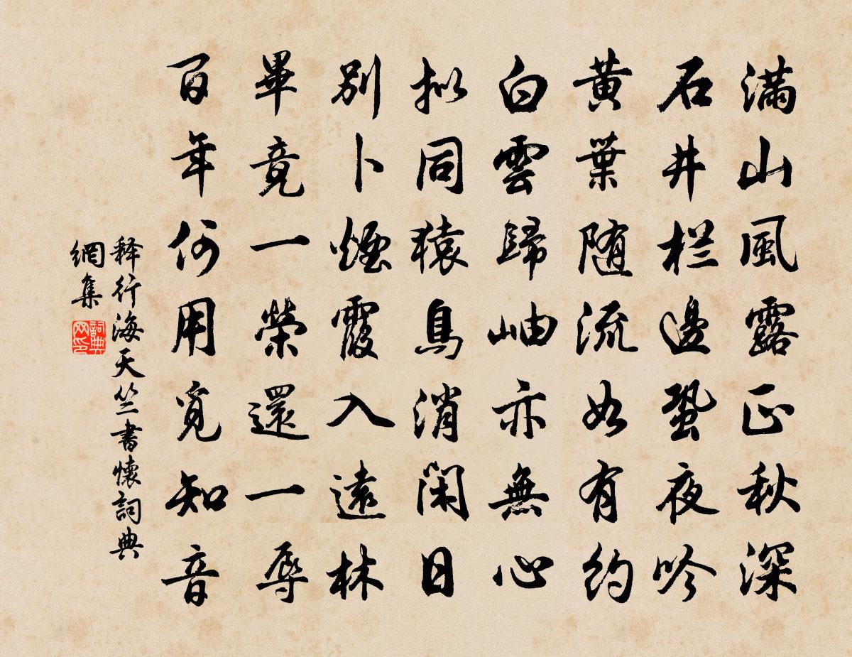 詩詞名句歷史字典書法欣賞書法字典國語詞典說文解字康熙字典古漢語字典標 題 作 者 詩 句 天竺書懷作者:釋行海 朝代:宋代天竺書懷原文滿山風露正秋深,石井欄邊蛩夜吟。黃葉隨流如有約,白雲歸岫亦無心。擬同猿鳥消閒日,別卜煙霞入遠林。畢竟一榮還一辱,百年何用覓知音。詩詞問答問:天竺書懷的作者是誰?答:釋行海問:天竺書懷寫於哪個朝代?答:宋代釋行海天竺書懷書法欣賞天竺書懷書法作品詩詞推薦黃山佚名〔宋代〕三十六峰高倚山,瑤台金闋貯神仙。嵩陽若興黃山比,獨少靈砂一道泉。送李中丞、楊判官李嘉祐〔唐代〕射策名先著,論兵氣自雄。能全季布諾,不道魯連功。流水蒹葭外,諸山睥睨中。別君秋日晚,回首夕陽空。蝸舍陸游〔宋代〕蝸舍茨生草,龜腸飽淖糜。麥因多雨損,蠶遇閏年遲。徙義憂無勇,求仁戒自欺。此生雖欲盡,吾志未應衰。頌古九首柏樹釋梵言〔宋代〕庭前柏樹子,不是祖師心。莫執一時見,便忘千古音。次韻劉貢甫學士畫松石圖歌蘇轍〔宋代〕長松大石生長見,朅游塵土嗟空羨。寒翠關心失舊交,榮華過眼驚流電。破繒買得古畫圖,遺墨參差隨斷線。蟉枝詠梅周南〔宋代〕詩在溪橋興在人,年來繞樹費追尋。何人煉得冰霜骨,調出孤山韶濩音。天申節詩朱翌〔宋代〕南來欣遇千秋節,北向空馳萬里心。永日清風吹古寺,一杯聊見祝堯深。送黔中裴中丞閣老赴任(回字)權德輿〔唐代〕五諫留中禁,雙旌輟上才。內臣持鳳詔,天廄錫龍媒。宴語暌蘭室,輝榮亞柏台。懷黃宜命服,舉白嘆離杯。景霽留題李侍御書齋許渾〔唐代〕昔話平生志,高齋曾見留。道孤心易感,恩重力難酬。獨立千峰曉,頻來一葉秋。雞鳴應有處,不覺淚空流。題伯時畫觀魚僧黃庭堅〔宋代〕橫波一網腥城市,日暮江空煙水寒。當時萬事心已死,猶恐魚作故時看。攤聲浣溪沙/浣溪沙毛滂〔宋代〕日轉堂陰一線添。使君和氣作春妍。祗有北山輕帶雪,見豐年。殘月夜來收不盡,行雲早起更留連。急翦垂楊迎秀呈希道兼寄不伐二首吳則禮〔宋代〕不見虎頭墨妙,聊尋燕頷將軍。興來未妨覓句,勝處端須策勛。和奇父竹齋小池及遊春五絕胡寅〔宋代〕不瞻犀柄動經旬,忽報巾車獨輾春。曾作天津歌酒伴,此間誰是識花人。喜雨上文相公黃庶〔宋代〕火神侵官弄胸臆,青帝欲滿勾芒慵。驕陽暴苗不得秀,風俗相顧無顏容。我公裨補造化手,乞許暫息平奸驄。西湖和原甫見送韓維〔宋代〕德義良所慕,風霜輕此行。放歌留客醉,高詠見公情。祖帳重開席,郊原少駐旌。還知別後意,寂寞對柴扃。寄和蔡州田郎中(一作寄和蔡州中丞題蔣亭)無可〔唐代〕遺蹟仍留蔡,幽人出漢朝。門深荒徑在,台迥數峰遙。岸石奇支相倚,窗松偃未凋。尋思方一去,豈待使君招。劉無言輞川詩帖贊岳珂〔宋代〕輞川之勝,新詩之詠,所以適性也。繭紙這瑩,筆力之勁,所以寫興也。維詩與筆,景物交映也。並於唐圖,於是岩雲舒岳祥〔宋代〕岩雲黏壁白,瀑雨點簾斑。詩句鴉初曉,鄉愁日半山。故人來沼上,好鳥韻窗間。樹近夜先到,村空春未還。醉桃源(桐江舟中)趙師俠〔宋代〕微雲掃盡碧虛寬。月華光影寒。山河表里鑒中看。沈沈清夜闌。風細細,露漙漙。神遊八極間。九宵回首望塵寰。慈竹樂史〔宋代〕蜀中何物靈,有竹慈為名。一叢闊婁處,森森數十莖。長莖復短莖,枝葉不崢嶸。去年筍已長,今年筍又生。高低名句推薦九日悲秋不到心。鳳城歌管有新音。晏幾道《鷓鴣天·九日悲秋不到心》 人生有酒須當醉,一滴何曾到九泉。高翥《清明日對酒》 日月之行,若出其中。曹操《觀滄海 / 碣石篇》 江帆幾片疾如箭,山泉千尺飛如電周德清《塞鴻秋·潯陽即景》 因依老宿發心初,半學修心半讀書。王建《寄舊山僧》 渭北春天樹,江東日暮雲。杜甫《春日憶李白》 垂柳覆金堤,蘼蕪葉復齊。薛道衡《昔昔鹽》 桃根桃葉終相守,伴殷勤、雙宿鴛鴦。納蘭性德《一叢花·詠並蒂蓮》 總是向人深處,當時枉道無情陸游《朝中措·代譚德稱作》 編草結庵,不違涼暑。蕭子顯《南齊書·列傳·卷四十》