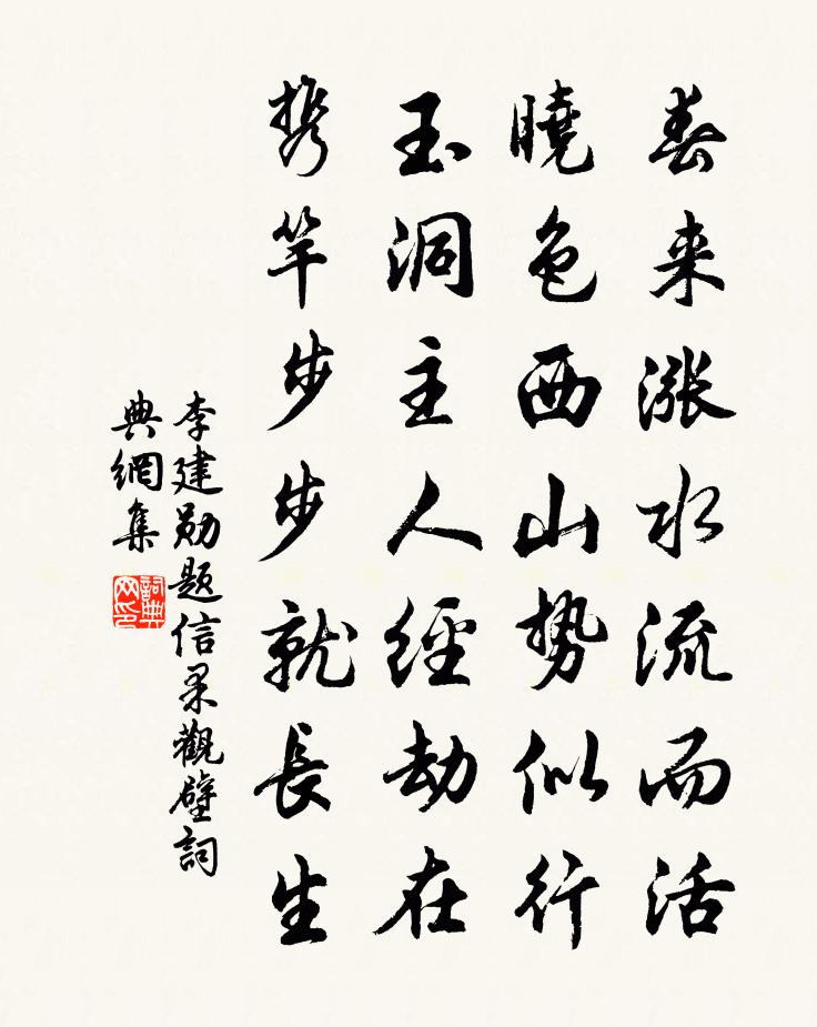 詩詞名句歷史字典書法欣賞書法字典國語詞典說文解字康熙字典古漢語字典標 題 作 者 詩 句 題信果觀壁作者:李建勛 朝代:唐代題信果觀壁原文春來漲水流而活,曉色西山勢似行。玉洞主人經劫在,攜竿步步就長生。詩詞問答問:題信果觀壁的作者是誰?答:李建勛問:題信果觀壁寫於哪個朝代?答:唐代問:題信果觀壁是什麼體裁?答:七絕李建勛題信果觀壁書法欣賞題信果觀壁書法作品注釋全唐詩:卷739-87詩詞推薦手種芙蓉入秋盛開方蒙仲〔宋代〕空山寂寂朋游少,為愛風姿手自栽。九十日秋猶暖熱,一枝謝又一枝開。飯昭果寺張耒〔宋代〕飄然乘興游,殽酒笑俗具。僧居致野飯,草草亦有趣。山僧慣迎客,煮茗新泉注。岩花得春遲,晚秀見紅素。蕭蕭芙蓉榭顧況〔唐代〕風擺蓮衣乾,月背鳥巢寒。文魚翻亂葉,翠羽上危欄。短歌行子蘭〔唐代〕日月何忙忙,出沒住不得。使我勇壯心,少年如頃刻。人生石火光,通時少於塞。四季倏往來,寒暑變為賊。偷人句潘閬〔宋代〕何須三叫絕,已恨一聲多。縣圃酴醾陳造〔宋代〕北園紅紫已蜚塵,始放幽亭爛熳春。疊翠影低珠幰重,洗妝人倦玉容真。薔薇清露疑分派,茉莉評香且外臣。領略贈樂間居士方鳳〔宋代〕市遠塵囂隔,神閒幽事並。埽花憐竹影,煮茗訝松聲。月與詩如約,琴將鶴互賡。冷香生碧落,秋夢不勝清。點絳唇(和翁子西)趙師俠〔宋代〕日暖風暄,殿春瓊蕊依台榭。雪堆花架。不用丹青寫。瑩徹精神,映月唯宜夜。幪香帕。倩風扶下。碎玉殘妝卸。寄殷協律(多敘江南舊遊)白居易〔唐代〕五歲優遊同過日,一朝消散似浮雲。琴詩酒伴皆拋我,雪月花時最憶君。幾度聽雞歌白日,亦曾騎馬詠紅裙。吳娘耕樂詩四首袁甫〔宋代〕一片靈明自有田,當仁那肯遜儒先。歸來不說溪山好,只說癯仙氣浩然。偈頌八十七首釋慧開〔宋代〕三月清明節禁菸,桃華帶雨倍鮮妍。皆言當日靈雲悟,笑破禪和口半邊。秋湖上晚景四首宋庠〔宋代〕小小江山國,輕輕縞紵衣。波光清作面,天勢碧成圍。岸蝶隨人舞,沙鷗掠坐飛。此心兼此境,安得不忘機。秋晚雜興陸游〔宋代〕洗耳高人恥見堯,看渠應不受弓招。精神徇物那能久,刀礪君看日日銷。省中直舍因敲新懷周元吉三首楊萬里〔宋代〕尚有周郎手種痕,懷人將竹當人看。寄言黃鶴樓前客,今歲新添十五竿。往年稠桑,曾喪白馬,題詩廳壁,今來尚存,白居易〔唐代〕路傍埋骨蒿草合,壁上題詩塵蘚生。馬死七年猶悵望,自知無乃太多情。句燕肅〔宋代〕鬢邊今日白,腰下幾時黃。自薊北歸高適〔唐代〕驅馬薊門北,北風邊馬哀。蒼茫遠山口,豁達胡天開。五將已深入,前軍止半回。誰憐不得意,長劍獨歸來。題蔡州壺仙觀祖無擇〔宋代〕鶯老花殘過禁菸,杖藜閒步到壺仙。仙家本是無塵地,別有風光一洞天。出塞 二薛道衡〔隋代〕邊庭烽火驚。插羽夜徵兵。少昊騰金氣。文昌動將星。長驅鞮汗北。直指夫人城。絕漠三秋暮。窮陰萬里生。寒夜送侯御赴黔中充判官劉長卿〔唐代〕不識黔中路,今看遣使臣。猿啼萬里客,鳥似五湖人。地遠官無法,山深俗豈淳。須令荒徼外,亦解懼埋輪。名句推薦雪中何以贈君別,惟有青青松樹枝。岑參《天山雪歌送蕭治歸京》 日長唯鳥雀,春遠獨柴荊。杜甫《春遠 / 春運》 白水明田外,碧峰出山後。王維《新晴野望》 腸斷月明紅豆蔻,月似當時,人似當時否?納蘭性德《鬢雲松令·枕函香》 惟有今宵,皓彩皆同普。郭應祥《醉落魄·丙寅中秋》 人生大病,只是一傲字。王陽明《傳習錄·卷下·門人黃以方錄》 道生一,一生二,二生三,三生萬物。老子《老子·德經·第四十二章》 要人知重勤學,怕人知事莫做。馮夢龍《警世通言·卷三十三》 知道自家是何等身份,則不敢虛驕矣王永彬《圍爐夜話·第三六則》 一曲高歌一樽酒,一人獨釣一江秋。王士禎《題秋江獨釣圖》