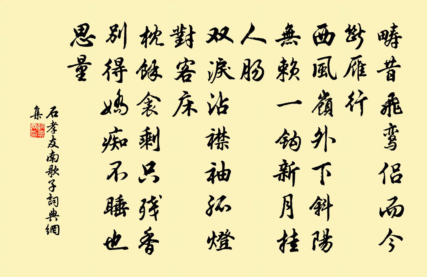 詩詞名句歷史字典書法欣賞書法字典國語詞典說文解字康熙字典古漢語字典標 題 作 者 詩 句 南歌子作者:石孝友 朝代:宋代南歌子原文疇昔飛鸞侶,而今斷雁行。西風嶺外下斜陽。無賴一鉤新月、掛人腸。雙淚沾襟袖,孤燈對客床。枕餘衾剩只殘香。別得嬌痴不睡、也思量。詩詞問答問:南歌子的作者是誰?答:石孝友問:南歌子寫於哪個朝代?答:宋代問:南歌子是什麼體裁?答:詞石孝友南歌子書法欣賞南歌子書法作品詩詞推薦西竺淨長老請贊釋心月〔宋代〕色見聲求,二俱不是。離聲色外,轉沒巴鼻。石火光中,掣電影裡。要見石豀,且莫瞌睡。題阮孚墓鞏豐〔宋代〕千古高風挽不回,故山花落又花開。莫欺亭畔蒼蒼鮮,曾印高人屐齒來。梅山弟家醉中陳著〔宋代〕得閒處處是春台,分付浮生水上杯。詩酒未為知瘦杜,簞瓢元不誤賢回。無情宇宙今猶古,有腳陰陽闔又開。世變壽陽罷郡日有詩十首與追懷…兼紀瑞物物。入淮至盱眙李紳〔唐代〕山凝翠黛孤峰迥,淮起銀花五兩高。天外綺霞迷海鶴,日邊紅樹艷仙桃。岸驚目眩同奔馬,浦溢心疑睹抃鰲。寄謝送僧之棣州謁王工部楊億〔宋代〕雪晴河水正流澌,風卷驚蓬滿眼飛。客路飄飄攜一錫,禪房寂寂掩雙扉。曹溪衣缽何年得,廬阜香燈幾日歸。賢守道彭澤張耒〔宋代〕姓陶令尹今何在,空補陳編歸去來。安得春江作春酒,百年長與子銜杯。金陵後觀棋絕句六首·選一錢謙益〔清代〕寂寞枯枰響泬寥,秦淮秋老咽寒潮。白頭燈影涼宵里,一局殘棋見六朝。送鄭居之賴鑄〔宋代〕窗前落葉正蕭蕭,夜雨寒燈共寂寥。君是居人余是客,明朝相候合江橋。枕上作晁說之〔宋代〕年華又已暮,客恨更難裁。寒雁背潮去,鐘聲隨雨來。離騷今我讀,時命昔人哀。但喜歸期近,寧論白髮催。唐明皇游月宮葛秋崖〔宋代〕秦漢求仙事已非,等間卻遇月中妃。如何不覓長生藥,只記霓裳一曲歸。題白苹亭王炎〔宋代〕得句柳刺史,築亭顏魯公。二賢雖異代,千古有遺風。苕水永不盡,苹洲今半空。老懷多感慨,訪古意無窮。送敬甫弟赴省試項安世〔宋代〕阿連明日去觀光,鶴髮今年喜倍常。船里萬端須過慮,客中無事不周防。三經訓詁勤繙閱,一紙平安數寄將。反覆三年銜恤絕不吟詩既奉詳祭獨緒摧裂偶得古詩程公許〔宋代〕秋風殷岩壑,萬木皆商謳。棘人有餘哀,攬衣良夜遒。三年輟清吟,寸腸堆百憂。淚眥日以眵,霜根一何稠。棣華蘇武慢蔡伸〔宋代〕雁落平沙,煙籠寒水,古壘鳴笳聲斷。青山隱隱,敗葉蕭蕭,天際暝鴉零亂。樓上黃昏,片帆千里歸程,年華將晚十四夜用立春韻趙蕃〔宋代〕舊雪猶連雪,新春未得春。燒燈當變節,圓月與俱新。邂逅成朋飲,飄流愴客身。還家重蕭索,山鬼闖廚人。次韻答趙尚書張繼先〔宋代〕炎蒸時節別家山,霜雪如今卻漸寒。恨我虛名徒涉世,憶君高語共憑欄。比因厭客連朝臥,長是援琴終夜彈。已得四明十題其八三層瀑釋曇穎〔宋代〕出頭出飛瀑,落落鳴寒玉。再落至山腰,三落至山足。欲引煮春山,僧房架刳竹。偈頌一百二十三首釋祖欽〔宋代〕呼六為五,破二作三。眼觀東北,意在西南。仰山門下卻不用遮般茶飯,佛法不怕爛。感皇恩 讀《莊子》,聞朱晦庵即世辛棄疾〔宋代〕案上數編書,非莊即老。會說忘言始知道。萬言千句,自不能忘堪笑。朝來梅雨霽,青青好。一壑一丘,輕衫短帽望郡城酬舟中諸丈陶夢桂〔宋代〕歸路寧迂三兩程,落霞孤鶩近鄉城。水連南浦天然碧。秋入西山雨後清。鹿夢已醒諳世事,鷗盟獨在見交情。近來名句推薦書不盡言,言不盡意。佚名《易傳·繫辭傳上·第十二章》 洛陽城裡見秋風,欲作家書意萬重。張籍《秋思》 樂民之樂者,民亦樂其樂。孟子《孟子·梁惠王章句下·第四節》 人之命在天,國之命在禮荀子《荀子·強國》 衝波突出人齊譀,躍浪爭先鳥退飛。盧肇《競渡詩 / 及第後江寧觀競渡寄袁州剌史成應元》 遙望洞庭山水色,白銀盤裡一青螺劉禹錫《望洞庭》 悲商叩林,白雲依山。陶淵明《閒情賦》 春到南樓雪盡。驚動燈期花信。万俟詠《昭君怨·春到南樓雪盡》 江流石不轉,遺恨失吞吳。杜甫《八陣圖》 燕子不知人去也,飛認闌乾。韓疁《浪淘沙·莫上玉樓看》