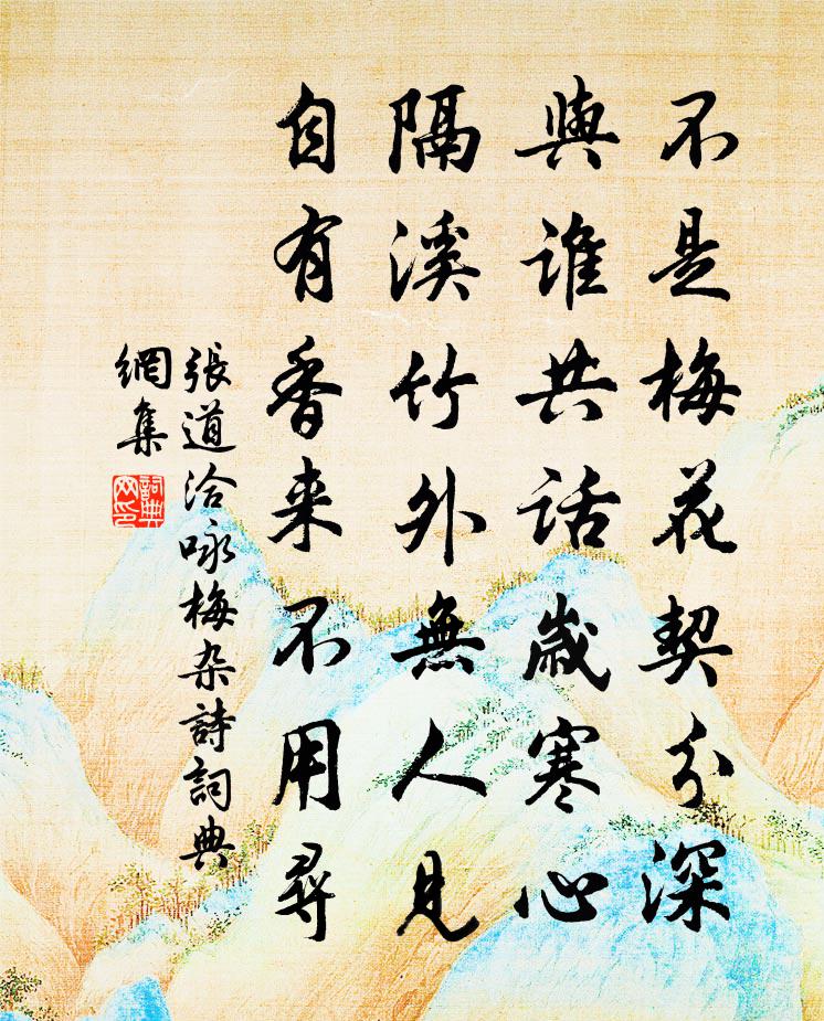 詩詞名句歷史字典書法欣賞書法字典國語詞典說文解字康熙字典古漢語字典標 題 作 者 詩 句 詠梅雜詩作者:張道洽 朝代:宋代詠梅雜詩原文不是梅花契分深,與誰共話歲寒心。隔溪竹外無人見,自有香來不用尋。詩詞問答問:詠梅雜詩的作者是誰?答:張道洽問:詠梅雜詩寫於哪個朝代?答:宋代張道洽詠梅雜詩書法欣賞詠梅雜詩書法作品詩詞推薦至齋詩為劉知錄作項安世〔宋代〕酒邊琴外蕣華明,栗里幽人遠念生。一寸光陰知有限,百年心事恐無成。追隨春服攀高駕,指點雩童問去程。簣土徐彥猷以仇池詩句為韻作詩十四章見示答之朱槔〔宋代〕徐侯筆下波濤寬,新詩示我清且閒。誰能辛苦學飯顆,格轍已到元和間。春寒十日不出戶,坐想江柳分煙鬟。東坡游天竺上寺呈東山仲靈沖晦楊蟠〔宋代〕入林已忻猿鳥樂,共傲浮生勝大還。身外是非雲不擊,社中留戀雨相關。籃輿寂寞愧彭澤,拄杖風流肖德山。寄語黃刑部之陝西轉運楊億〔宋代〕百二秦川四塞寬,甘泉烽火報平安。泥書雙筆遷郎署,粒食千金仰縣官。江海斗生拋別墅,關山何日解征鞍。定將蝶戀花·露下庭柯蟬響歇納蘭性德〔清代〕露下庭柯蟬響歇。紗碧如煙,煙里玲瓏月。並著香肩無可說,櫻桃暗解丁香結。笑卷輕衫魚子纈。試撲流螢,驚起題精舍寺(一作酬王季友秋夜宿露台寺見寄)郎士元〔唐代〕石林精舍武溪東,夜扣禪關謁遠公。月在上方諸品靜,僧持半偈萬緣空。秋山竟日聞猿嘯,落木寒泉聽不窮。惟有題漂母飯信圖黃庚〔宋代〕國士無雙未肯臣,漢皇眼力欠精神。築壇直待追亡後,不及溪邊一婦人。挽伯父二首洪咨夔〔宋代〕白髮兒隨母,蒼顏弟對兄。四休元易足,一笑更何營。論事絲弦直,存心鏡面平。德人今已矣,誰與嗣鄉評。【仙呂】一半兒 題情關漢卿〔元代〕多情多緒小冤家,迤逗的人來憔悴煞;說來的話先瞞過咱,怎知他,一半兒真實一半兒假。臨江仙(坐悟)劉辰翁〔宋代〕我去就他甚易,他來認我良難。悟時到處是壺天。古詩尋一句,危坐看香菸。金玉滿堂不守,菁華歲月空遷。從今和樞上人韻陳宓〔宋代〕禪心獨理燈無盡,曲論懷私物不齊。拱木已嚴千歲冢,狂瀾難決萬金堤。古今蔽顯神功相,天地韜藏裕眼迷。會看紹興以後蜡祭四十二首佚名〔宋代〕禮樂既成,神保聿歸。言歸何所,地紀天維。豈惟屢豈,嗣幾所祈。億萬斯年,神來燕娭。綠野亭鄭伯玉〔宋代〕雨過黃梅夏將半,園亭清灑如山家。白鳥窺魚立間暇,紅蜒弄水飛交加。垣衣重重長舊暈,萱草節節含新花。薤葉屏跡陸游〔宋代〕飯熟起開缽,困來徐倒床。無狂安取聖?有短始知長。養道褐懷玉,露才錐出囊。聊須喚兒稚,細細話耕桑。上鄧憲生辰楊簡〔宋代〕有孫維良,秉德正方。天子曰於,寘彼周行。與獻臣希深伯中源叔景純會飲城東小園宋祁〔宋代〕林間曉日靜暉暉,判共山公倒接?。不信佳人唱花落,試尋欄畔有空枝。述字迴文偈七首宋太宗〔宋代〕前憂依述最,亨知休以祐。然留希佛背,生推求比舊。過西塞山齊己〔唐代〕空江平野流,風島葦颼颼。殘日銜西塞,孤帆向北洲。邊鴻渡漢口,楚樹出吳頭。終入高雲里,身依片石休。贈賓貢裴說〔唐代〕惟君懷至業,萬里信悠悠。路向東溟出,枝來北闕求。家無一夜夢,帆掛隔年秋。鬢髮爭禁得,孤舟往復愁。偈湡禪師〔宋代〕優遊實際妙明家,轉步移身指落霞。無限白雲猶不見,夜乘明月出蘆花。名句推薦春風一夜吹鄉夢,又逐春風到洛城。武元衡《春興》 惟德動天,無遠弗屆。佚名《尚書·虞書·大禹謨》 芳草句,碧雲辭,低徊閒自思。佟世南《阮郎歸·杏花疏雨灑香堤》 待到黃昏月上時,依舊柔腸斷。程垓《卜運算元·獨自上層樓》 床空委清塵,室虛來悲風。潘安《悼亡詩三首》 三過平山堂下,半生彈指聲中。蘇軾《西江月·平山堂》 桃花潭水深千尺,不及汪倫送我情。李白《贈汪倫》 夫治身與治國,一理之術也。呂不韋《呂氏春秋·覽·審分覽》 來是春初,去是春將老。曾允元《點絳唇·一夜東風》 國者、天下之大器也,重任也荀子《荀子·王霸》