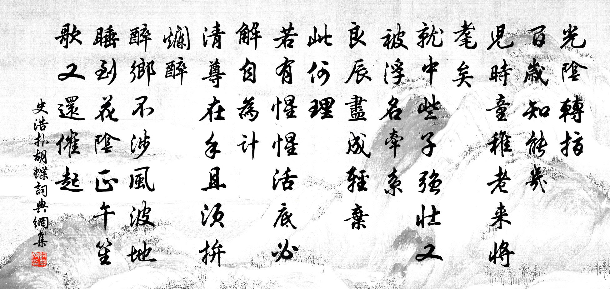 詩詞名句歷史字典書法欣賞書法字典國語詞典說文解字康熙字典古漢語字典標 題 作 者 詩 句 撲胡蝶/撲蝴蝶作者:史浩 朝代:宋代撲胡蝶/撲蝴蝶原文光陰轉指。百歲知能幾。兒時童稚,老來將耄矣。就中些子強壯,又被浮名牽繫。良辰盡成輕棄。此何理。若有惺惺活底,必解自為計。清尊在手,且須拚爛醉。醉鄉不涉風波地。睡到花陰正午,笙歌又還催起。詩詞問答問:撲胡蝶/撲蝴蝶的作者是誰?答:史浩問:撲胡蝶/撲蝴蝶寫於哪個朝代?答:宋代問:撲胡蝶/撲蝴蝶是什麼體裁?答:詞史浩撲胡蝶/撲蝴蝶書法欣賞撲胡蝶/撲蝴蝶書法作品詩詞推薦和徐判院見惠詩篇姜特立〔宋代〕新詩贈我繞朝鞭,敵手相逢一憮然。迦葉見花吾未解,靈均此秘子能傳。過嚴關曾豐〔宋代〕誓不南遊今復游,東西雖異等南州。妻兒累己何人免,行止關天不自由。伏櫪過都從野馬,乘流遇坎任虛舟。嚴關早朝紫宸殿賀雪呈尤延之二首楊萬里〔宋代〕雪花將瑞獻君王,晴早銷遲戀建章。不肯獨清須帶月,猶嫌未冷更吹霜。題泉州萬安橋陳偁〔宋代〕跨海為橋布石牢,那知直下壓靈鰲。基連島嶼規模壯,勢截淵潭氣象豪。鐵馬著行橫絕漠,玉鯨張鬣露寒濤。縑圖句楊林〔宋代〕舊遊如夢苦傷神。【雙調】賣花聲喬吉〔元代〕悟世肝腸百鍊爐間鐵,富貴三更枕上蝶,功名兩字酒中蛇。尖風薄雪,殘杯冷炙,掩清燈竹籬茅舍。太平吳氏樓會詠千葉緗梅張鎡〔宋代〕巧留芳艷待春回,不愛霜飈苦折摧。應對群葩羞冷淡,數花並作一花開。重酬樂天元稹〔唐代〕紅塵擾擾日西徂,我興雲心兩共孤。暫出已遭千騎擁,故交求見一人無。百篇書判從饒白,八米詩章未伏盧。最笑桂隱紀詠詠老軒張鎡〔宋代〕因看上下經,便無煩惱事,慈儉不為先,躬行五個字。偈五首釋道行〔宋代〕雲籠岳頂,百鳥無聲。月隱寒潭,龍珠自耀。直得石樑忽然大悟,石洞頓爾心休。虛空開口作證,溪北石僧點頭。和進士張曙聞雁見寄崔塗〔唐代〕斷行哀響遞相催,爭趁高秋作恨媒。雲外關山聞獨去,渡頭風雨見初來。也知榆塞寒須別,莫戀蘋汀暖不回。試向送綽侄住庵吳興山中陸游〔宋代〕一杯淡粥不烹蔬,自占雲根結草廬。非佛非心猶坐斷,定知不看夾山書。太息陸游〔宋代〕書生忠義與誰論?骨朽猶應此念存。砥柱河流僊掌日,死前恨不見中原。送朱休歸劍南賈島〔唐代〕劍南歸受賀,太學賦聲雄。山路長江岸,朝陽十月中。芽新抽雪茗,枝重集猿楓。卓氏琴台廢,深蕪想徑通。病癒看鏡陸游〔宋代〕鏡中稍復舊朱顏,一笑衰翁乃爾頑。三百瓮齏消未盡,不知更著幾年還?玉樓春晏幾道〔宋代〕一尊相遇春風裡,詩好似君人有幾。吳姬十五語如弦,能唱當時樓下水。良辰易去如彈指,金盞十分須盡意。明朝同潘丈游東平瀑陳宓〔宋代〕天公特地放初晴,許我聯鑣琬琰行。新著茅亭憑到晚,難將一字扁佳名。城東逆旅陸游〔宋代〕店家乞火燎征衣,濕竹生薪不受吹。更甚從戎戍邊日,正如隨計入關時。百年擾擾夢相似,萬事悠悠心自知。賴有冬眺宋祁〔宋代〕城外斜光角已催,城頭倦客首空回。星霜牢落凋年往,天地蒼茫暝色來。千尾昏鴉愁迥戍,幾蹄征馬思窮埃。使君過澶州感事李復〔宋代〕孫村黃河決北流,北使年年過澶州。澶州兩城戰格盡,七十餘年廢不修。昔歲契丹傾國起,欲投馬箠渡河水。烽火名句推薦冰炭不同器而久,寒暑不兼時而至韓非及後人《韓非子·顯學》 虎踞龍蟠何處是,只有興亡滿目。辛棄疾《念奴嬌·登建康賞心亭呈史致道留守》 余亦赴京國,何當獻凱還。孟浩然《送陳七赴西軍》 小男供餌婦搓絲,溢榼香醪倒接罹。李郢《南池》 拔一毛而利天下,不為也。孟子《孟子·盡心章句上·第二十六節》 世風之狡詐多端,到底忠厚人顛撲不破王永彬《圍爐夜話·第 * 則》 望處雨收雲斷,憑闌悄悄,目送秋光。柳永《玉蝴蝶·望處雨收雲斷》 勸君莫惜金縷衣,勸君惜取少年時。杜秋娘《金縷衣》 未老莫還鄉,還鄉須斷腸。韋莊《菩薩蠻·人人盡說江南好》 東籬把酒黃昏後,有暗香盈袖。李清照《醉花陰·薄霧濃雲愁永晝》