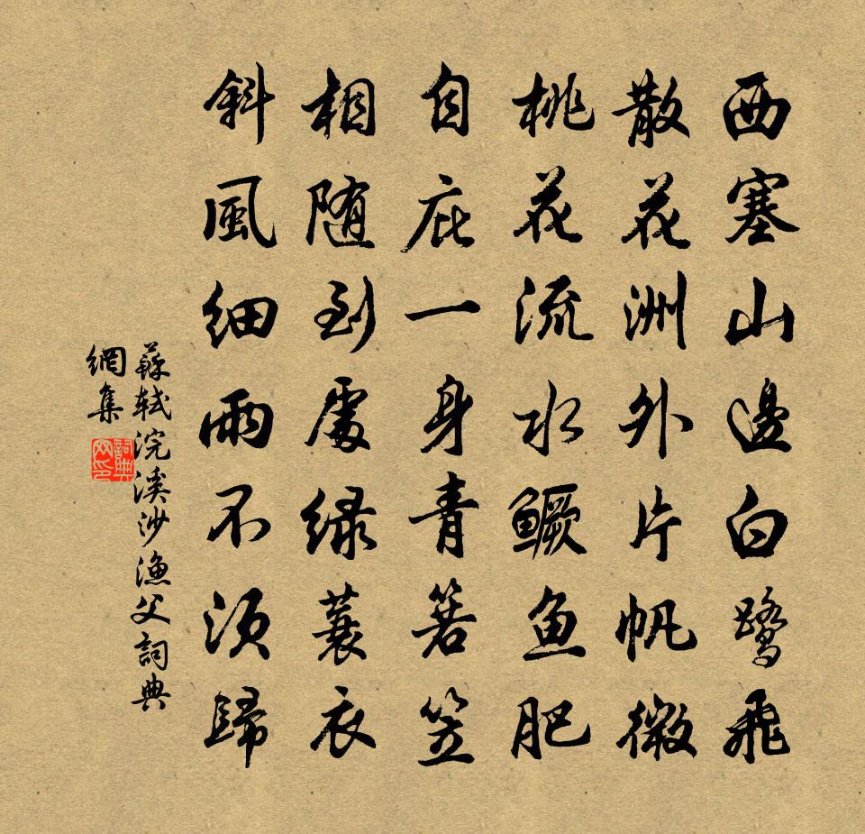 西塞山邊白鷺飛,散花洲外片帆微。桃花流水鱖魚肥。自庇一身青箬笠,相隨到處綠蓑衣。斜風細雨不須歸。