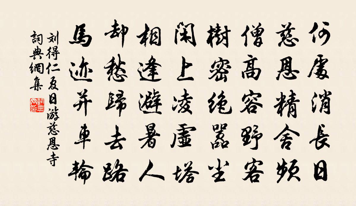 詩詞名句歷史字典書法欣賞書法字典國語詞典說文解字康熙字典古漢語字典標 題 作 者 詩 句 夏日游慈恩寺作者:劉得仁 朝代:唐代夏日游慈恩寺原文何處消長日,慈恩精舍頻。僧高容野客,樹密絕囂塵。閒上凌虛塔,相逢避暑人。卻愁歸去路,馬跡並車輪。詩詞問答問:夏日游慈恩寺的作者是誰?答:劉得仁問:夏日游慈恩寺寫於哪個朝代?答:唐代問:夏日游慈恩寺是什麼體裁?答:五律劉得仁夏日游慈恩寺書法欣賞夏日游慈恩寺書法作品注釋全唐詩:卷544-36詩詞推薦夏月頻雨楊萬里〔宋代〕一番暑雨一番涼,真箇令人愛日長。隔水風來知有意,為吹十里稻花香。郊廟歌辭。享文敬太子廟樂章。送文舞迎武舞佚名〔唐代〕乾旄羽籥相虧蔽,一進一退殊行綴。昔獻三雍盛禮容,今陳六佾崇儀制。雜曲歌辭。古別離孟雲卿〔唐代〕朝日上高台,離人怨秋草。但見萬里天,不見萬里道。君行本迢遠,苦樂良難保。宿昔夢同衾,憂心常傾倒。含酸嗣秀王生日楚辭釋寶曇〔宋代〕攝提之歲兮厥月惟寅,蓂誰商略兮六莢發春。揆王初度兮箕橫翼陳,紛吾先驅兮康護帝茵,謂太平本無象兮,何為滄浪閣為王憲使賦劉黻〔宋代〕獨得蕭台趣,心清不受塵。我多臨水屋,誰是濯纓人。波渺涵天闊,沙渟印月真。忘機有鷗鷺,渾不厭相親。月蝕詩盧仝〔唐代〕東海出明月,清明照毫髮。朱弦初罷彈,金兔正奇絕。三五與二八,此時光滿時。頗奈蝦蟆兒,吞我芳桂枝。我愛侍宴隆慶池應制張說〔唐代〕靈池月滿直城隈,黻帳天臨御路開。東沼初陽疑吐出,南山曉翠若浮來。魚龍百戲紛容與,鳧鷁雙舟較溯洄。願似惜分飛·寒夜吳綺〔清代〕昨晚西窗風料峭,又把黃梅瘦了。人被花香惱,起看天共青山老。鶴叫空庭霜月小,夜來凍雲如曉。誰信多情道,念奴嬌(坐上次王伯開韻)李彌遜〔宋代〕風簾弄影,正閒堂永晝,香銷人寂。軋軋鄰機芳思亂,愁入回文新織。燕蹴巢泥,鶯喧庭柳,好夢無蹤跡。那堪春金陵鳳凰台置酒李白〔唐代〕置酒延落景,金陵鳳凰台。長波寫萬古,心與雲俱開。借問往昔時,鳳凰為誰來。鳳凰去已久,正當今日回。明君賦女冠還俗孫惟信〔宋代〕疊卻霞綃上醮衣,女童髽髻綠楊垂。重調蛾黛為眉淺,再試弓鞋與步遲。紫府煙花鶯喚醒,仙房雲雨鶴通知。簾低贈元上人杜荀鶴〔唐代〕多少僧中僧行高,偈成流落遍僧抄。經窗月靜灘聲到,石徑人稀蘚色交。垂露竹粘蟬落殼,窣雲松載鶴棲巢。煮茶言懷陸游〔宋代〕莫笑生涯似斷蓬,向來諸俠避豪雄。報仇使氣風塵里,吹竹彈絲錦繡中。樂事眼看成昨夢,倦遊心伏作衰翁。論交齊天樂方岳〔宋代〕孤篷夜傍低叢宿,蕭蕭雨聲悲切。一岸霜痕,半江煙色,愁到沙頭枯葉。澹雲沒滅。黯西風吹老,滿汀新雪。天豈早飯乾溪蓋乾吉故居也陸游〔宋代〕劍外歸來席未溫,南征浩蕩信乾坤。峰迴內史曾游地,竹暗仙人舊隱村。白髮孤翁鉏麥壟,茜裙小婦闖籬門。行行禽聲曾幾〔宋代〕不如歸去東皋上,美酒提壺迎婦餉。何妨脫袴著新衣,百箔蠶絲繭如盎。春泥滑滑未沒腰,田間布穀初立苗。牧兒點絳唇應次蘧〔宋代〕雪意嬌春,臘前妝點春風面。粉痕冰片。一笑重相見。倚竹偎松,誰道羅浮遠。寒更轉。楚騷為伴。韻繞香篝暖。菊李嶠〔唐代〕玉律三秋暮,金精九日開。榮舒洛媛浦,香泛野人懷。靃靡寒潭側,丰茸曉岸隈。黃花今日晚,無復白衣來。江館會別戴叔倫〔唐代〕離亭一會宿,能有幾人同。莫以回車泣,前途不盡窮。春寒王鎡〔宋代〕玉屏煙冷鷓鴣斑,翡翠簾遮好夢殘。雨又未休人又懶,杏花無力不禁寒。名句推薦此夜星繁河正白,人傳織女牽牛客。沈佺期《七夕曝衣篇》 青青一樹傷心色,曾入幾人離恨中。白居易《青門柳》 記取江湖泊船處,臥聞新雁落寒汀。陸游《夜泊水村》 今夜月明人盡望,不知秋思落誰家。王建《十五夜望月寄杜郎中》 感時花濺淚,恨別鳥驚心。杜甫《春望》 秦時明月漢時關,萬里長征人未還。王昌齡《出塞二首·其一》 情往似贈,興來如答。劉勰《文心雕龍·物色》 柳葉隨歌皺,梨花與淚傾。黃庭堅《南歌子·槐綠低窗暗》 瘦雪一痕牆角,青子已妝殘萼。王庭筠《謁金門·雙喜鵲》 香非在蕊,香非在萼,骨中香徹。晁補之《鹽角兒·亳社觀梅》