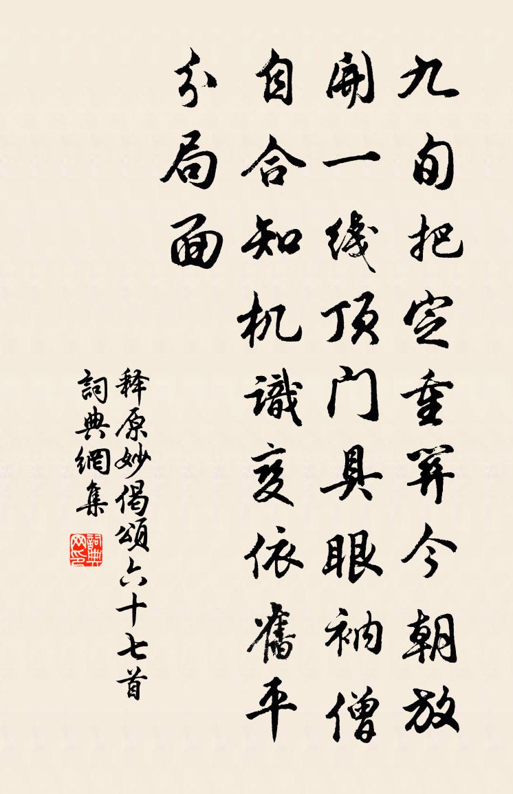 詩詞名句歷史字典書法欣賞書法字典國語詞典說文解字康熙字典古漢語字典標 題 作 者 詩 句 偈頌六十七首作者:釋原妙 朝代:宋代偈頌六十七首原文九旬把定重關,今朝放開一線。頂門具眼衲僧,自合知機識變。依舊平分局面。詩詞問答問:偈頌六十七首的作者是誰?答:釋原妙問:偈頌六十七首寫於哪個朝代?答:宋代釋原妙偈頌六十七首書法欣賞偈頌六十七首書法作品詩詞推薦浣溪沙張弘范〔元代〕新卜西山崦下莊。疏籬編竹草苫堂。門前流水柳成行。滿目煙嵐詩酒地,十年鞍馬是非場。虛名半紙幾多忙。送鄭二員外皇甫冉〔唐代〕置酒竟長宵,送君登遠道。羈心看旅雁,晚泊依秋草。秋草尚芊芊,離憂亦渺然。元戎辟才彥,行子犯風煙。風煙自嘆三首文天祥〔宋代〕北轍更寒暑,南冠幾晦冥。家山時入夢,妻子亦關情。惆悵心如失,崎嶇命復輕。遭時命如此,薄分笑三生。題僧庵陸游〔宋代〕細路穿雲塢,危橋渡野塘。人稀土花碧,屋老瓦松長。憂患雙蓬鬢,裝資一布囊。燒薪藉余暖,今夜有新霜。和戴禹功幕府歸來三首王之道〔宋代〕臨淮終日鑒修眉,水外遙山尺五低。我欲騎雲叫閶闔,請將捕寇付平西。猛虎行曹丕〔魏晉〕與君媾新歡。托配於二儀。充列於紫微。升降焉可知。梧桐攀鳳翼。雲雨散洪池。連日大雪獨坐有感虞儔〔宋代〕低唱誰家帳縷金,何如短棹泛山陰。天邊雁斷無留影,泓下龍寒亦懶吟。著柳便隨風作態,欺梅除有月知心。晴光寄答綿州楊齊伯左司陸游〔宋代〕磊落人為磊落州,滕王閣望越王樓。欲憑夢去直虛語,賴有詩來寬旅愁。我老一官書紙尾,君行千騎試遨頭。遙知小心坡余鴻〔清代〕魚背崎嶇無奈何,小心緩步度高坡。語兒山路休閒險,世路須知險更多。次楊元會白蓮二首姜特立〔宋代〕不御鉛華似洛妃,清虛全與道相宜。月明何處回仙駕,獨立沙頭爾許時。太清舞史浩〔宋代〕當時脫得長城苦。但熙熙朝暮。上帝錫長生,任跳丸烏兔。種桃千萬已成陰,望家鄉、杳然何處。從此與凡人,隔晚春客路曾豐〔宋代〕流水綠相沸,落花紅自紛。乾坤容盎盎,草木意芸芸。布穀聲通俗,提壺語帶文。杜鵑相告處,益有激而雲。賜劉輝及第宋仁宗〔宋代〕治世求才重,公朝校藝精。臨軒升造士,入彀得群英。並躡雲梯峻,聯登桂籍榮。庇民思善政,慈惠體予情。送宮人入道韋應物〔唐代〕舍寵求仙畏色衰,辭天素麵立天墀。金丹擬駐千年貌,寶鏡休勻八字眉。公主與收珠翠後,君王看戴角冠時。從來感山舊事釋紹嵩〔宋代〕愛此棲心靜,陶然度歲華。放慵真有味,化俗獨無涯。隔沼連香芰,疏籬帶晚花。細評清絕處,倚杖看蜂衙。春晴晁端禮〔宋代〕燕子來時,清明過了,桃花亂飄紅雨。倦客淒涼,千里雲山將暮。淚眸回望,人在玉樓深處。向此多應念遠,憑欄和趙南塘離支五絕劉克莊〔宋代〕風韻能令百果低,難將盧橘斗新奇。品題自合還詩祖,模寫何須覓畫師。地黃蘇軾〔宋代〕地黃餉老馬,可使光監人。吾聞樂天語,喻馬施之身。我衰正伏櫪,垂耳氣不振。移栽附沃壤,蕃茂爭新春。沉水句張釜〔宋代〕杉栽處處青。鸚鵡曲 別意 以上三十六首見太平樂府卷一,馮子振〔元代〕花驄嘶斷留儂住。滿酌酒勸據鞍父。柳青青萬里初程,點染陽關朝雨。怨春風雁不回頭,一個個背人飛去。望河橋名句推薦山頭堆白雪,風裡卷黃沙。楊守禮《三月巡邊曉發夏城》 晚雲都變露,新月初學扇,塞鴻一字來如線。周德清《塞鴻秋·潯陽即景》 己不自信,何以信於人?張廷玉《明史·列傳·卷四十九》 舉頭西北浮雲,倚天萬里須長劍。辛棄疾《水龍吟·過南劍雙溪樓》 中州遺恨,不知今夜幾人愁。辛棄疾《水調歌頭·和馬叔度游月波樓》 行宮見月傷心色,夜雨聞鈴腸斷聲。白居易《長恨歌》 舉大事,必慎其終始戴聖《禮記·文王世子》 入世冷挑紅雪去,離塵香割紫雲來。曹雪芹《訪妙玉乞紅梅》 有鳥鷙立,羽翼張。柳宗元《唐鐃歌鼓吹曲十二首·其四》 七國三邊未到憂,十三身襲富平侯李商隱《富平少侯》