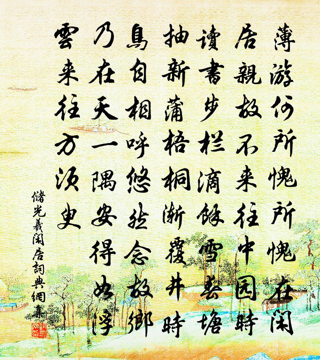 詩詞名句歷史字典書法欣賞書法字典國語詞典說文解字康熙字典古漢語字典標 題 作 者 詩 句 閒居作者:儲光羲 朝代:唐代閒居原文薄游何所愧,所愧在閒居。親故不來往,中園時讀書。步欄滴餘雪,春塘抽新蒲。梧桐漸覆井,時鳥自相呼。悠然念故鄉,乃在天一隅。安得如浮雲,來往方須臾。詩詞問答問:閒居的作者是誰?答:儲光羲問:閒居寫於哪個朝代?答:唐代問:閒居是什麼體裁?答:五古儲光羲閒居書法欣賞閒居書法作品注釋全唐詩:卷138_32全唐詩:卷138_32詩詞推薦和姚子敬秋懷趙孟頫〔元代〕搔首風塵雙短鬢,側身天地一儒冠。中原人物思王猛,江左功名愧謝安。苜蓿秋高戎馬健,江湖日短白鷗寒。金尊句晏殊〔宋代〕私書一紙離懷苦,望斷波中六六鱗。頌證道歌證道歌釋印肅〔宋代〕法身覺了無一物,入滅降生非出沒。觀身實相亦如然,究竟何曾離兜率。游安樂山魯交〔宋代〕苔逕傍岩斜,林間是道家。夜潭魚戲月,春地鹿眠花。詠怪石蘇軾〔宋代〕家有粗險石,植之疏竹軒。人皆喜尋玩,吾獨思棄捐。以其無所用,曉夕空嶄然。碪礎則甲斮,砥硯乃枯頑。於繳挽陳夫人卓氏二首黃公度〔宋代〕貴不改舊習,老猶遵幼儀。安貧偕隱者,急義勝男兒。餘澗河九里,寧馨桂一枝。秋毫有遺恨,石窌剖封遲。送睦州張參軍張喬〔唐代〕重祿輕身日,清資近故鄉。因知送君後,轉自惜年芳。遠水分林影,層峰起鳥行。扁舟此中去,溪月有餘光。詠淮陰侯王珪〔唐代〕秦王日凶慝,豪傑爭共亡。信亦胡為者,劍歌從項梁。項羽不能用,脫身歸漢王。道契君臣合,時來名位彰。北討雜興陸游〔宋代〕病養精神過服藥,貧知儉約勝營生。皋夔事業今何有,且與心君致太平。留山間即事王炎〔宋代〕暫留野次倦征行,差覺山林氣味清。日釀梅酸新雨過,山連空翠淡煙橫。東皋水滿起農事,南國草青回雁程。撥置詠槿李白〔唐代〕園花笑芳年,池草艷春色。猶不如槿花,嬋娟玉階側。芬榮何夭促,零落在瞬息。豈若瓊樹枝,終歲長翕赩。幽居吳潛〔宋代〕竹院秋逾靜,柴門晝不開。病先攜老去,懶漸逐衰來。莫遣新緣結,都將舊念灰。川魚與雲鳥,從此莫驚猜。春早郡樓書事寄呈府中群公許渾〔唐代〕兩鬢垂絲髮半霜,石城孤夢繞襄陽。鴛鴻幕里蓮披檻,虎豹營中柳拂牆。畫舸欲行春水急,翠簾初卷暮山長。峴亭盟雲陸游〔宋代〕謂雲本無心,企望乃爾奇;謂雲果有心,百變端為誰,豈憐此翁愁,一出怡悅之?橫截千嶂平,高擎一峰危,銀城採蓮曲乾隆〔清代〕薰風拂池塘,明霞映洲渚,蕩漾木蘭船,採蓮不知暑。蓮花如錦葉如蓋,芳香自送搖清籟,疑有天孫為弄梭,不然春草唐彥謙〔唐代〕天北天南繞路邊,托根無處不延綿。萋萋總是無情物,吹綠東風又一年。雲邊阻雨劉宰〔宋代〕薔薇籬落送春闌,筍葚園林早夏間。牛背牧兒酣午夢,不知風雨過前山。題寶塔釋印肅〔宋代〕塔本無縫,真如不動。說此經處,湧出虛空。釋迦多寶,聽說如夢。東西無二,見見不同。無剎不收,無色不融。宮詞章孝標〔唐代〕明日鑾輿欲向東,守宮金翠帶愁紅。九門佳氣已西去,千里花開一夜風。漁家傲晏殊〔宋代〕葉下眠未穩。風翻露颭香成陣。仙女出遊知遠近。羞借問。饒將綠扇遮紅粉。一掬蕊黃沾雨潤。天人乞與金英名句推薦牛群食草莫相觸,官家截爾頭上角。李涉《牧童詞》 如今但暮雨,蜂愁蝶恨,小窗閒對芭蕉展。呂渭老《薄倖·青樓春晚》 小人者其未得也,則憂不得;既已得之,又恐失之。是以有終身之憂,無一日之樂也。荀子《荀子·子道》 輕舟泛月尋溪轉,疑是山陰雪後來李白《東魯門泛舟二首》 傷情燕足留紅線,惱人鸞影閒團扇。張可久《塞鴻秋·春情》 幾硯昔年游,於今成十秋。司馬光《送龔章判官之衛州·新及第》 前年過代北,今歲往遼西薛道衡《昔昔鹽》 北風捲地白草折,胡天八月即飛雪。岑參《白雪歌送武判官歸京》 講性命之學者,不可無經濟之才。王永彬《圍爐夜話·第二六則》 紙灰飛作白蝴蝶,淚血染成紅杜鵑。高翥《清明日對酒》