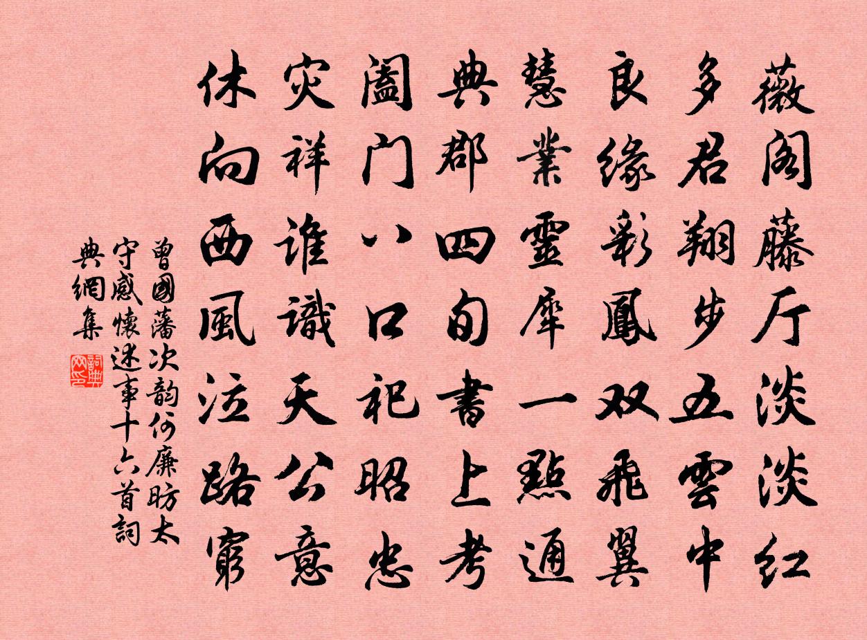 詩詞名句歷史字典書法欣賞書法字典國語詞典說文解字康熙字典古漢語字典標 題 作 者 詩 句 次韻何廉昉太守感懷述事十六首作者:曾國藩 朝代:清代原文薇閣藤廳淡淡紅,多君翔步五雲中。良緣彩鳳雙飛翼,慧業靈犀一點通。典郡四旬書上考,闔門八口祀昭忠。災祥誰識天公意,休向西風泣路窮。詩詞問答問:《次韻何廉昉太守感懷述事十六首》的作者是誰?答:曾國藩問:該詩寫於哪個朝代?答:清代問:該詩是什麼體裁?答:七律書法欣賞次韻何廉昉太守感懷述事十六首書法作品詩詞推薦禪人並化主寫真求贊釋正覺〔宋代〕靜而無像,動而無功。湛兮秋下水,應也樹頭風。到處隨緣成佛事,超情只個是神通。九月十五日夜宿鄭尚書絪東亭,望月寄杜給事廣宣〔唐代〕霜天晴夜宿東齋,松竹交陰愜素懷。迥出風塵心得地,可憐三五月當階。清光滿院恩情見,寒色臨門笑語諧。霄漢寄中書李舍人紓戴叔倫〔唐代〕萍翻蓬自卷,不共本心期。復入重城裡,頻看百草滋。水流歸思遠,花髮長年悲。盡日春風起,無人見此時。次韻子瞻游徑山蘇轍〔宋代〕去年渡江愛吳山,忽忘蜀道輕秦川。錢塘後到山最勝,下枕湖水相縈旋。坐疑吳會無復有,扁舟屢出凌濤淵。今秋句王隨〔宋代〕松檜陰中閒覆局,芰荷香里靜垂鉤。上雲樂李白〔唐代〕金天之西,白日所沒。康老胡雛,生彼月窟。巉岩容儀,戍削風骨。碧玉炅炅雙目瞳,黃金拳拳兩鬢紅。華蓋垂下過西侖莊一宿王炎〔宋代〕南首巴陵道,籃輿小作程。欲隨王事去,頗戀佛廬清。一雨暑欲退,四山秋有聲。流年欺鬢髮,搖落又關情。閒興釋文珦〔宋代〕分得此生閒,於今老更頑。心終如白水,身不離青山。拙性從人誚,前詩或自刪。衡門深草色,壞衲上苔斑。雖有沙苑南渡頭王昌齡〔唐代〕秋霧連雲白,歸心浦漵懸。津人空守纜,村館復臨川。篷隔蒼茫雨,波連演漾田。孤舟未得濟,入夢在何年?行營送馬侍御戴叔倫〔唐代〕萬里羽書來未絕,五關烽火晝仍傳。故人多病盡歸去,唯有劉禎不得眠。思歸寄張仲達崔進之仇遠〔宋代〕不為鱸魚也合歸,山中雞黍正秋肥。東籬菊在家來好,莫學淵明較是非。沁園春(題羅浮山)葛長庚〔宋代〕且說羅浮,自從石洞,水簾以還。是向時景泰,初來卓錫,舊家勾漏,曾此修丹。藥院空存,鐵橋如故,上更有朱送陸書還吳武元衡〔唐代〕君住包山下,何年入帝鄉。成名歸舊業,嘆別見秋光。橘柚吳洲遠,蘆花楚水長。我行經此路,京口向雲陽。又和八首劉克莊〔宋代〕參透黃陳向上關,肯將風月乞楊蟠。君才不忝圖書府,吾老安能筆硯間。有鄙拙歌叩牛角,無清平調動龍顏。暮年滿庭芳(九日)吳則禮〔宋代〕玉壘尊罍,清秋關塞,正宜催喚香醪。涼風吹帽,橫槊試登高。相見征西舊事,龍山會、賓主俱豪。來群雁,涼生南望合皂山楊萬里〔宋代〕慚愧多情合皂山,去年迎我上西船。今來送我還東去,四日相隨到進賢。銘詩一首劉克莊〔宋代〕眼如電,十年讀。腹如櫛,三冬足。昔池上,賡黃鵠。今田間,叱黃犢。耕谷口,廬汾曲。潔去就,免殆辱。余先征婦怨釋文珦〔宋代〕寧為呼傍草,莫作戰士妻。初嫁席未溫,夫今戍遼西。憶與夫別時,山川正飛雪。腰間弓箭重,冰凍馬蹄裂。夫君贈畫梅吳雪塢謝枋得〔宋代〕冷凝寒極雪漫漫,天下無人知袁安。起來門前問梅竹,吾友可以話歲寒。歲寒心腸似鐵石,不與萬木同摧殘。有時久雨閒悶對酒偶吟白居易〔唐代〕淒悽苦雨暗銅駝,裊裊涼風起漕河。自夏及秋晴日少,從朝至暮悶時多。鷺臨池立窺魚笱,隼傍林飛拂雀羅。賴有名句推薦殷勤昨夜三更雨,又得浮生一日涼。蘇軾《鷓鴣天·林斷山明竹隱牆》 中年親友難別,絲竹緩離愁。蘇軾《水調歌頭·安石在東海》 闌乾風冷雪漫漫,惆悵無人把釣竿。姜夔《釣雪亭》 牆倒眾人推。曹雪芹《紅樓夢·第五十五回》 取之非易,守之尤艱;智不足弗得,謀有失竟患,死生事也。來俊臣《羅織經·控權卷第四》 月黑見漁燈,孤光一點螢。查慎行《舟夜書所見》 回鞭指長安,西日落秦關。李白《登敬亭北二小山余時送客逢崔侍御並登此地》 知我者,謂我心憂;不知我者,謂我何求。佚名《黍離》 末俗以繁華相尚,終覺冷淡處趣味彌長。王永彬《圍爐夜話·第 * 則》 非鬼亦非仙,一曲桃花水辛棄疾《生查子·獨游雨岩》