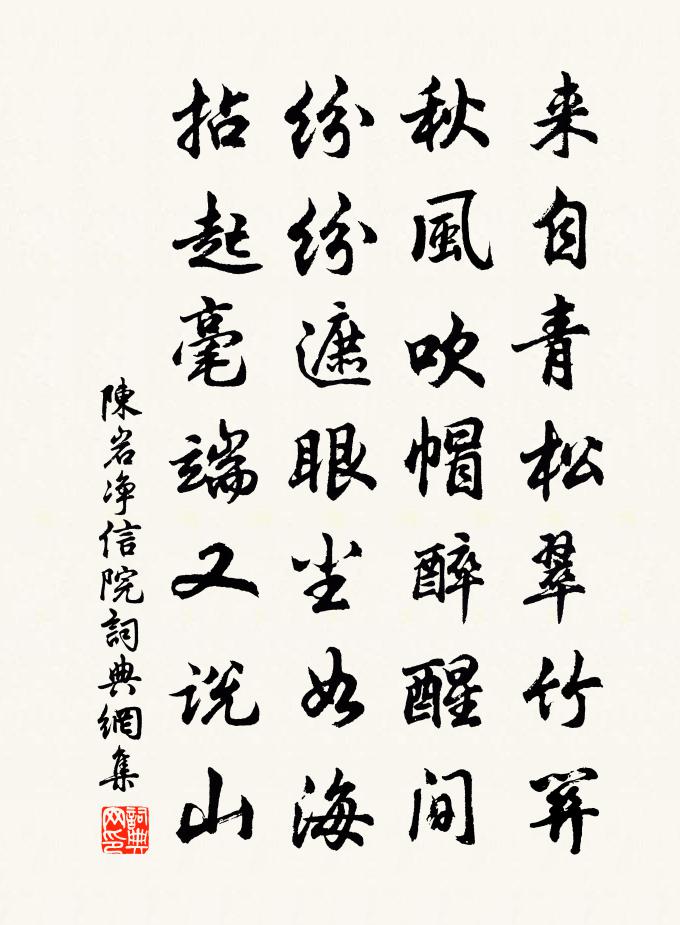 詩詞名句歷史字典書法欣賞書法字典國語詞典說文解字康熙字典古漢語字典標 題 作 者 詩 句 淨信院作者:陳岩 朝代:宋代淨信院原文來自青松翠竹關,秋風吹帽醉醒間。紛紛遮眼塵如海,拈起毫端又說山。詩詞問答問:淨信院的作者是誰?答:陳岩問:淨信院寫於哪個朝代?答:宋代陳岩淨信院書法欣賞淨信院書法作品詩詞推薦梅碑易士達〔宋代〕冷蕊誰回筆底春,不教花落更芬芬。自從揭在吟窗里,常帶催詩一片雲。奔牛閘遇使者議和一首王阮〔宋代〕浩浩水千里,層層堤幾重。誰為此過顙,曲障爾朝宗。浪散忽成雪,潭昏那見龍。浮山何足論,聖德務含容。冬日同仲巽及府寮游萬壽寺鄭獬〔宋代〕峻阜如蟠虹,蓄泄氣象靈。紺宇隱紅樹,繚若畫在屏。聯騎轉城角,沙步俯回汀。野寺對寒水,白壁敞雲扃。嶛深滕學士九華山書堂梅堯臣〔宋代〕處山方畏遠,雖慕結深廬。要與雲峰近,寧將野客疏。澗苗未入俎,林鳥或窺書。何事輕茲樂,而從出塞車。三高祠甫里先生孫銳〔宋代〕數頃荒田負郭耕,筆床茶灶看鋤雲。一琖清泉薦秋菊,不知何處吊參軍。上法智大師釋遇昌〔宋代〕雨霽遙空木落時,危亭南望倍依依。白蓮舊社人離久,丹闕經年信去稀。入觀夜堂江月滿,揮松秋殿晝燈微。林中偈頌一百零九首釋可湘〔宋代〕語是謗,默是誑。語默向上一機,佛祖聞而膽喪。曾郎輥三個木撲,德山揮一條白棒。儘是弄精魂,呈影像。何似對月六首白玉蟾〔宋代〕深秋荷敗柳枯時,霜蟹香棖副所思。月要人窺嬌不上,風知我醉放多吹。鷓鴣天(壽熊尚友)熊可量〔宋代〕清曉南窗笑語喧。今朝生日勝從前。鶴吞沆瀣神逾爽,松飽風霜節更堅。調氣馬,殖心田。幾曾佞佛與夸仙。戲衫題戴洪甫愛竹軒趙汝鐩〔宋代〕竹癖難憑俗眼看,琴書靜對翠光寒。秋聲鳴屋風初度,夜影翻床月半殘。天乞幽人供嗜好,日呼稚子報平安。窗前蘇幕遮 荷葉杯 此詞疑有誤王哲〔元代〕認得之,時休送。碧宕深洞。瑪瑙耀光希。龍蟠虎繞玫花垂。西江水上,來往見鳥飛。直待青童交位。恁時休去,統分稻晚歸陸游〔宋代〕出裹一簞飯,歸收百把禾。勤勞解堪忍,餘暇更吟喔。歲惡增吾困,家貧賴汝多。村醪莫辭醉,羹芋學岷峨。漳州白蓮僧宗要見遺紙扇每扇各書一首蔡襄〔宋代〕徑尺規圓比雪霜,昔人何事恨秋涼。珍藏篋笥未為失,更有明年夏日長。菩薩蠻郭應祥〔宋代〕未觀岩桂先觀菊。世間底事真遲速。節物苦相催。重陽便到來。白衣何處覓。沽酒邀佳客。一笑有餘歡。官居終日再次韻張簿陳造〔宋代〕生世詩作癖,頗坐艱局病。當前成風手,每來難塞請。後身羽鑿齒,名儷乃公盛。新詩再出奇,後出尤雅正。高吟閬州東園十詠四照亭文同〔宋代〕畫箔褰何礙,珍叢發已圓。願公皆遍賞,莫為一隅偏。菩薩蠻(去歲壽李嗣立)郭應祥〔宋代〕誕辰遲似秋三日。草堂已有新涼入。鬢綠未全霜。欣然把一觴。吟松新納祿。共享清閒福。兩個老人星。君家難弟秋日歸舊山許棠〔唐代〕山雲蟬滿樹,欲住更何安。上國回將晚,孤峰別自難。磧遙鴻未到,江近夜先寒。泉石雖堪戀,行人不願看。西湖柴望〔宋代〕年年柳眼青歸處,門外遊人可自閒。天氣又晴晴又雨,樓台依寺寺依山。酒邊歌拍穿花外,船上簫聲落水間。光景蟬姜特立〔宋代〕自下高升木杪問,風為呼吸露為餐。雖雲強聒人憎惡,也勝低頭推糞丸。名句推薦客愁全為減,舍此復何之?杜甫《後游》 非知之難也,處知則難也。韓非及後人《韓非子·說難》 覆巢之下,復有完卵劉義慶《世說新語·言語》 徙倚霜風裡,落日伴人愁。袁去華《水調歌頭·定王台》 我家洗硯池邊樹,朵朵花開淡墨痕。王冕《墨梅》 湖闊兼雲霧,樓孤屬晚晴。杜甫《陪裴使君登岳陽樓》 戰必覆人之軍,攻必凌人之城。商鞅《商君書·賞刑》 兒孫自有兒孫福,莫為兒孫做馬牛。佚名《增廣賢文·上集》 矜偽不長,蓋虛不久。韓非及後人《韓非子·難一》 正雁水夜清,臥虹平帖。吳文英《暗香·送魏句濱宰吳縣解組分韻得闔字》
