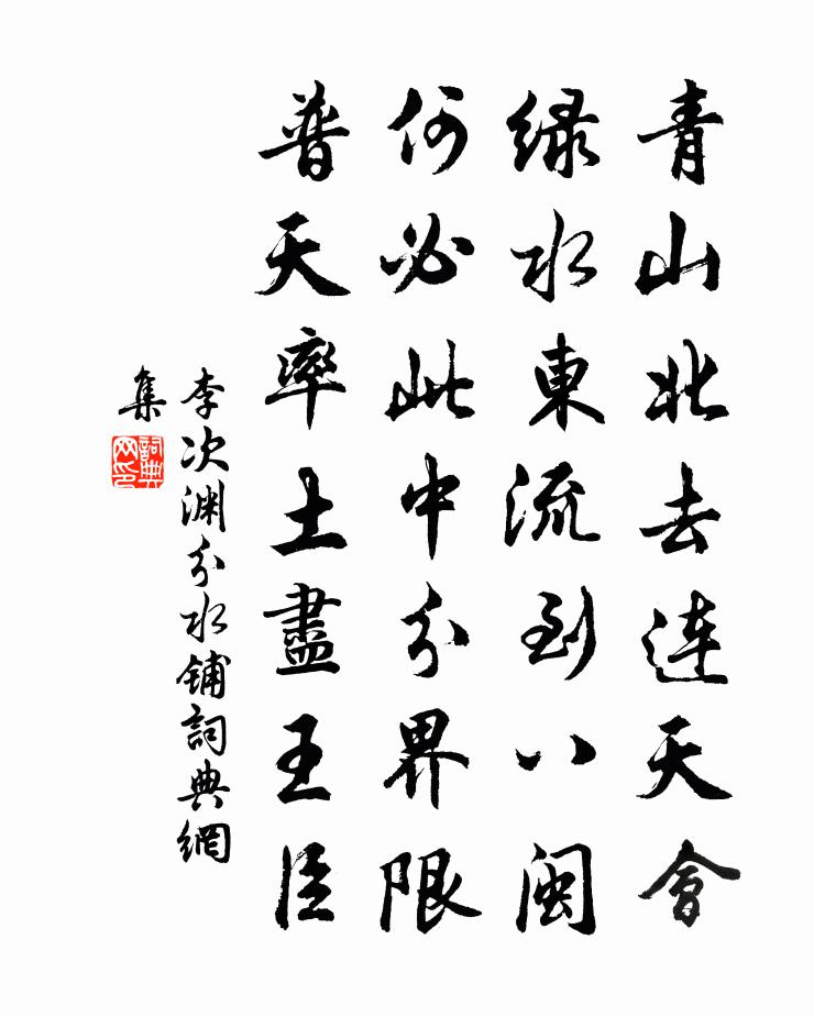 詩詞名句歷史字典書法欣賞書法字典國語詞典說文解字康熙字典古漢語字典標 題 作 者 詩 句 分水鋪作者:李次淵 朝代:宋代分水鋪原文青山北去連天會,綠水東流到八閩。何必此中分界限,普天率土盡王臣。詩詞問答問:分水鋪的作者是誰?答:李次淵問:分水鋪寫於哪個朝代?答:宋代李次淵分水鋪書法欣賞分水鋪書法作品詩詞推薦禪人並化主寫真求贊釋正覺〔宋代〕白髮半山雪,青瞳兩眼秋,的的環中意,綿綿方外游。虛空說法何須口,萬像森羅自點頭。偈頌六十首釋曇華〔宋代〕簸箕有唇,米跳不出,天下衲僧赤{左骨右乞}{左骨右歷}。更須撥轉上頭關,十方世界黑似漆。偈頌一百五十首釋心月〔宋代〕元正啟祚,萬物鹹新。山形拄丈子,只麽黑鱗皴,時來也解笑翻身。倒腹傾腸為君說,唱歌須是帝鄉人。減字木蘭花佚名〔宋代〕向來梅發。雪袂仙裳回絳闕。今又梅開。已領熊罷好夢來。試將梅比。才著陽和爭結子。梅子生成。早晚須調鼎鼐思歸天台曹勛〔宋代〕山中小築枕溪流,卻踏紅塵笑拙謀。鬢點吳霜今已才,兒皆楚語只堪愁。猿驚鶴怨事偶爾,燕語鶯啼春罷休。每與和洪秀才八首胡寅〔宋代〕栽花為事業,種秫是謀猷。不羨兩蝸角,從教雙鬢秋。登樓山抹黛,垂釣水澄眸。此樂應誰侶,雩風昔從游。減字木蘭花王觀〔宋代〕角聲三品。銀漏更殘將欲盡。盞盞華筵。玉粒瓊甌散又圓。知君洪量。不用推辭須一上。滿勸殷勤。祝壽如同福祿張家渡買魚徐僑〔宋代〕北堂老人性嗜魚,有魚一飯空無餘。行水登舟喜動色,幾月乃得三四食。溪涸舟膠挽不去,舍舟行行溪上路。路入游鹿門不果曾鞏〔宋代〕方舟下秋瀨,已遠漢南城。念昔在郡日,苦為塵網嬰。低心就薄祿,實負山水情。鹿門最秀髮,十里行松檉。宿幌淳熙三年發皇后冊寶十三首佚名〔宋代〕天監在周,是生太任。亦有太姒,嗣其徽音。孰如兩宮,慈愛相承。思齊之盛,復見於今。送張升甫三十韻強至〔宋代〕歲餘客秦雍,處俗失大方。眼前紛朋游,外同異中腸。最得張子晚,一見合柔剛。拜我十年兄,本非以其長。直緣賀新郎辛棄疾〔宋代〕瑞氣籠清曉。卷珠簾、次第笙歌,一時齊奏。無限神仙離蓬島。鳳駕鸞車初到。見擁個、仙娥窈窕。玉佩玎襠風縹嬾趣陸游〔宋代〕謝病掩柴荊,年來嬾趣成。舌根茶味永,鼻觀酒香清。已矣馳驅息,悠然磊磈平。高眠得三昧,夢斷已窗明。初發道州答崔三連州題海陽亭見寄絕句呂溫〔唐代〕吏中習隱好躋攀,不擾疲人便自閒。聞說殷勤海陽事,令人轉憶舜祠山。長樂少年行(一作古意)崔國輔〔唐代〕遺卻珊瑚鞭,白馬驕不行。章台折楊柳,春日路傍情。題梅山趙蕃〔宋代〕望覺林巒合,行知隴畝分。轉亭橋跨壑,入寺閣連雲。薪水僮奴事,經禪長少勤。令人生愛敬,何止息塵氛。送林雲岫歸省林尚仁〔宋代〕西風吹客衣,束擔出王畿。千里莫嫌遠,幾人猶未歸。山空秋鶴瘦,天闊暮雲飛。料得還家日,將詩壽彩闈。醜奴兒·書博山道中壁辛棄疾〔宋代〕少年不識愁滋味,愛上層樓,愛上層樓,為賦新詞強說愁。而今識得愁滋味,欲說還休,欲說還休,卻道天涼好個資聖庵欲過圓通釋正覺〔宋代〕我初浮舟濟九江,幽尋蘭若山蒼龍。王摩詰畫倚欄檻,謝靈運詩開綺窗。艾禪高談肖琢玉,法身雅論非枯樁。夢回送周縣尉滿秩歸姚勉〔宋代〕自古高安欠學宮,新庠贊立竟誰功。青青子佩爭弦誦,總在先生化育中。名句推薦蓮渚收香,蘭皋浮爽,涼思頓欺班扇。王月山《齊天樂·夜來疏雨鳴金井》 白頭燈影涼宵里,一局殘棋見六朝。錢謙益《金陵後觀棋絕句六首·選一》 不近人情,舉世皆畏途;不察物情,一生俱夢境。陳繼儒《小窗幽記·集醒篇》 紅葉滿寒溪,一路空山萬木齊。納蘭性德《南鄉子·秋暮村居》 燕歸花謝,早因循、又過清明。納蘭性德《紅窗月·燕歸花謝》 積善之家,必有餘慶;積不善之家,必有餘殃。王永彬《圍爐夜話·第十五則》 貞女貴徇夫,捨生亦如此。孟郊《列女操 / 烈女操》 白毛浮綠水,紅掌撥清波駱賓王《詠鵝》 天意眷我中興,吾皇神武,踵曾孫周發。黃中輔《念奴嬌·炎精中否》 才過清明,漸覺傷春暮。李冠《蝶戀花·春暮》