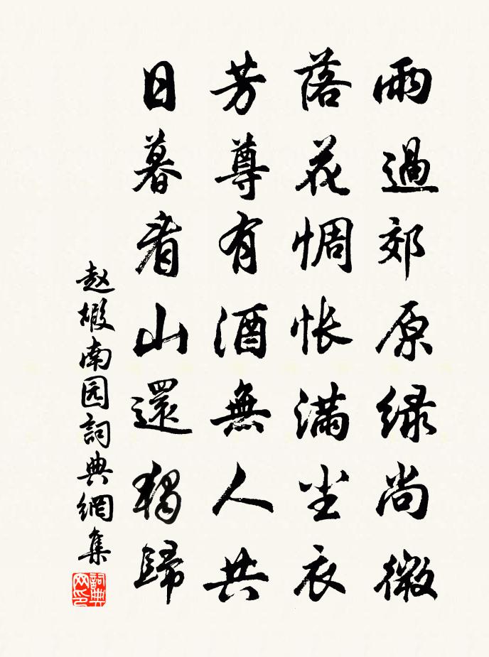 詩詞名句歷史字典書法欣賞書法字典國語詞典說文解字康熙字典古漢語字典標 題 作 者 詩 句 南園作者:趙嘏 朝代:唐代南園原文雨過郊原綠尚微,落花惆悵滿塵衣。芳尊有酒無人共,日暮看山還獨歸。詩詞問答問:南園的作者是誰?答:趙嘏問:南園寫於哪個朝代?答:唐代問:南園是什麼體裁?答:七絕問:趙嘏的名句有哪些?答:趙嘏名句大全趙嘏南園書法欣賞南園書法作品詩詞推薦句姚孝錫〔宋代〕久客交情諳冷暖,衰年病骨識陰晴。句余湜〔宋代〕西母已回金殿冷,綠珠一墜玉樓空。都下竹枝詞方文〔清代〕有客慈仁古寺中,蒼龍鱗畔泣春風。布衣自有布衣語,不與簪紳朝士同。飯後以水噀蟻時予有華嚴日課鄭剛中〔宋代〕蟻子尋香滿地旋,豈知鍋斧久無膻。贈渠一滴華嚴水,好去生他忉利天。久欲乞歸未得一日蒙恩放歸不勝欣喜塗中得十吳芾〔宋代〕淡煙斜日媚郊原,中有人家似輞川。地側忽驚車馬過,三三兩兩竹籬邊。送高勝重謁曹王司空曙〔唐代〕江上青楓岸,陰陰萬里春。朝辭郢城酒,暮見洞庭人。興比乘舟訪,恩懷倒屣親。想君登舊榭,重喜掃芳塵。椒菊枕洪咨夔〔宋代〕矮檠矻初年,細字窘晚節。天憐蠹書障,神授鴻寶訣。金葩涼而嚴,丹寶溫以烈。兩囊貯風露,半簪藉霜雪。芬透梅花石吟舒岳祥〔宋代〕梅花樹下梅花石,花作玉玉妝石鐵色。黃筌粉本花光枝,風吹數片尤奇特。何年處士橫斜句,影落寒溪印苔磧。又夜讀傳燈雜書六言八首劉克莊〔宋代〕曾為魔女攝入,亦被罔明喚回。錦覆陷阱可畏,鐵鑄門關勿開。九月初四日大風雨近重陽無酒夜成二首方回〔宋代〕秋霖欲洗庾公塵,不管樓頭客恨新。塞雁又為江左客,菊花曾識晉時人。百年虛谷先生老,一紀嚴州太守貧。幾向偈釋方會〔宋代〕釋迦老子著跌,偷笑雲蓋亂說。雖然世界坦平,也是將勤補拙。吳山寺汛吳則禮〔宋代〕空山無人境,汛掃寺兩廊。每荷佛下榻,更蒙天與涼。沉瓜冷出井,澆汗暖注湯。落日下山去,好風如許長。點絳唇程垓〔宋代〕梅雨收黃,暑風依舊閒庭院。露荷輕顫。只有香浮面。掛起西窗,月澹無人見。幽情遠。隨釵低扇。好個涼方便。再用前韻贈子勉四首黃庭堅〔宋代〕行要爭光日月,詩須皆可紘歌。著鞭莫落人後,百年風轉蓬科。招山乃詩人劉叔擬故居朱清之得其地清之赴南戴復古〔宋代〕半路袖回攀佳手,一生才遂買山心。要知此老風流處,來向劉郎吟處吟。寓居張嵲〔宋代〕是處為家得,斯居亦漫成。西齋便靜密,小閣更深明。送老一床足,遺形百慮輕。傍人訝幽僻,端可寄餘生。圓壇午龕行事王俊刈〔宋代〕平日郊邱事口談,今朝相祀列星參。大裘袞冕升南陛,小次龍床近午龕。韋社去天真尺五,嵩神祀聖似呼三。清都出郊偶成呈府判知縣三丈二首曹彥約〔宋代〕奉行三盡令,問訊十分春。雞犬柴門曉,牛羊草徑新。遠投雙嶺寺,頻見耦耕人。我亦江南客,為農頗識真。偈頌二百零五首釋正覺〔宋代〕不落階級,卓卓超出三際。曷用安排,十方自然畐塞。五色線不我羈縻,七寶冠是誰嚴飾。題蟬蝶畫扇項安世〔宋代〕曉日兮花飛,晚風兮柳嘶。異趣兮同樂,之二蟲兮何如。名句推薦野戰格鬥死,敗馬號鳴向天悲。李白《戰城南》 回首暮雲遠,飛絮攪青冥。蘇軾《水調歌頭·昵昵兒女語》 時光只解催人老,不信多情,長恨離亭,淚滴春衫酒易醒。晏殊《採桑子·時光只解催人老》 燕燕輕盈,鶯鶯嬌軟,分明又向華胥見。姜夔《踏莎行·自沔東來丁未元日至金陵江上感夢而作》 得饒人處且饒人。曹雪芹《紅樓夢·第五十九回》 新園鎖卻愁陰,露黃漫委,寒香半畝。吳文英《瑞龍吟·送梅津》 草木行列,煙消日出。蘇轍《黃州快哉亭記》 嘆年光過盡,功名未立,書生老去,機會方來。劉克莊《沁園春·夢孚若》 白水滿春塘,旅雁每迥翔。沈約《詠湖中雁》 經一失長一智馮夢龍《警世通言·卷三》