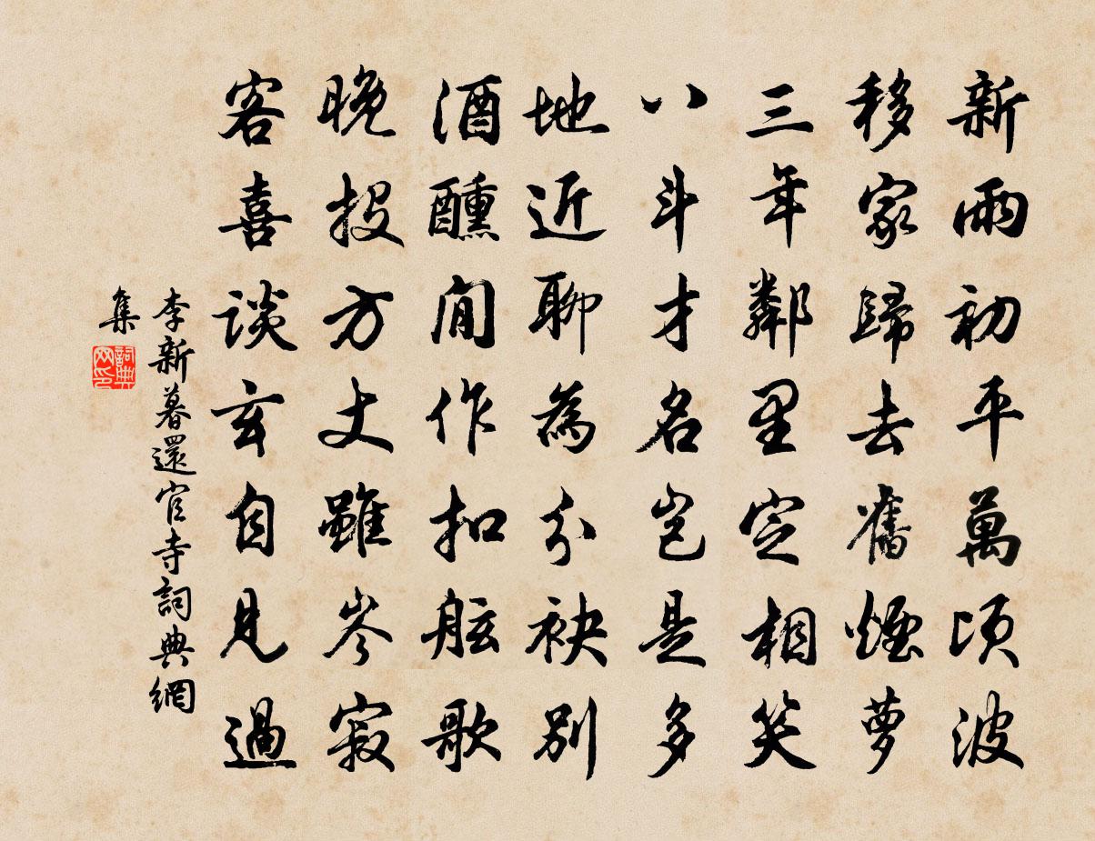 詩詞名句歷史字典書法欣賞書法字典國語詞典說文解字康熙字典古漢語字典標 題 作 者 詩 句 暮還官寺作者:李新 朝代:宋代暮還官寺原文新雨初平萬頃波,移家歸去舊煙蘿。三年鄰里定相笑,八斗才名豈是多。地近聊為分袂別,酒醺閒作扣舷歌。晚投方丈雖岑寂,客喜談玄自見過。詩詞問答問:暮還官寺的作者是誰?答:李新問:暮還官寺寫於哪個朝代?答:宋代李新暮還官寺書法欣賞暮還官寺書法作品詩詞推薦荷氣釋寶曇〔宋代〕一池芳日上簾鉤,荷氣蒸人醉不收。藕欲作舟花作屋,更和風露管清秋。甘露寺僧房張喬〔唐代〕臨水登山路,重尋旅思勞。竹陰行處密,僧臘別來高。遠岫明寒火,危樓響夜濤。悲秋不成寐,明月上千舠。寓居六詠蘇轍〔宋代〕手植天隨菊,晨添苜蓿盤。叢長憐夏苦,花晚怯秋寒。素食舊所愧,長齋今未闌。殷勤拾落蕊,眼暗讀書難。光化踏青有感司空圖〔唐代〕引得車回莫認恩,卻成寂寞與誰論。到頭不是君王意,羞插垂楊更傍門。送青神宰樊允南解官次杜應求韻史堯弼〔宋代〕簿領侵尋地,淹留寄此鄉。相逢譚笑共,不覺歲年長。物色重陽近,秋高萬象藏。賦歸三徑里,籬菊有餘香。友人元敏示以三題乃賡而和之釋智圓〔宋代〕試金石真偽立可辨,貞姿號試金。雖無褒貶口,似有是非心。採取山溪遠,緘藏篋笥深。礦人如未決,終日自相尋鶴林寺陸秀夫〔宋代〕歲月未可盡,朝昏屢不眠。窗前多古木,床上半殘編。放犢飲溪水,助僧耕種田。寺門外斷掃,分食愧農賢。端居感懷韋應物〔唐代〕沈沈積素抱,婉婉屬之子。永日獨無言,忽驚振衣起。方如在幃室,復悟永終已。稚子傷恩絕,盛時若流水。暄涼宜興山房十首李曾伯〔宋代〕俄頃鐘聲到枕邊,朦朧曉色試霜天。披衣欲起渾無事,贏得平明一覺眠。偶成曹彥約〔宋代〕雪月風花總不知,雕奇鏤巧學支離。四時多少閒光景,無個閒人領略伊。淳熙四年二月既望靜江守臣張某奉詔勸農於郊張栻〔宋代〕祁祁甘雨,膏我下土。羽羽谷風,和澤乃音。滿庭芳佚名〔宋代〕身是庵兒,性為庵主,耳目便是門窗。壁中為舍,腹是廚房。心是當廚博士,運水火、煉就元陽。心寧守,依時飯南潭上亭宴集以疾後至因而抒情李商隱〔唐代〕馬卿聊 * ,謝傅已登山。歌發百花外,樂調深竹間。鷁舟縈遠岸,魚鑰啟重關。鶯蝶如相引,煙蘿不暇攀。佳人連雲樓林景熙〔宋代〕我心適無事,看雲起南山。層檐接空影,而不礙往還。昔年凡鱗化,乘此青冥間。膚寸未膏物,黃埃滿人寰。剛風兵火孫銳〔宋代〕胡馬倏南侵,膻塵夜犯心。喪魚索枯肆,倒屣問焦琴。狼煙乘慘勢,鬼燐帶愁吟。廬舍人無幾,還家何處尋。又和前韻十首廖行之〔宋代〕痴絕兒童不耐窮,搓酥綴蠟競銷鎔。如何見得真風度,須索天工歲一逢。自蘇州至望亭驛有作(一作李嘉祐詩)郭良驥〔唐代〕南浦菰蒲繞白蘋,東吳黎庶逐黃巾。野棠自發空流水,江燕初歸不見人。遠岫依依如送客,平田渺渺獨傷春。那堪過燕渡望大峨,有白氣如層樓,拔起叢雲中范成大〔宋代〕圍野千山暑氣昏,大峨煙靄亦繽紛。玉峰忽起三千丈,應是兜羅世界雲。偈頌一百一十七首釋紹曇〔宋代〕雨後豀聲寒弄玉,風前木葉碎飄金。風聯隊互用非聲色,花劈威音古佛心。見成家樂,管宴佳賓。莫謂瑞岩岑寂甚書李秀才壁齊己〔唐代〕干戈阻上日,南國寄貧居。舊里荒應盡,新年病未除。窗風連島樹,門徑接鄰蔬。我有閒來約,相看雪滿株。名句推薦採桑秦氏女,織錦竇家妻。薛道衡《昔昔鹽》 鳥雀呼晴,侵曉窺檐語。周邦彥《蘇幕遮·燎沉香》 有不忍言之心,必有不忍言之禍。王永彬《圍爐夜話·第一三O則》 狡兔死,走狗烹;飛鳥盡,良弓藏;敵國破,謀臣亡。司馬光《資治通鑑·漢紀三》 不誘於譽,不恐於誹,率道而行,端然正己。荀子《荀子·非十二子》 春風舉國裁宮錦,半作障泥半作帆。李商隱《隋宮 / 隋堤》 獨自立瑤階,透寒金縷鞋。納蘭性德《菩薩蠻·隔花才歇廉纖雨》 酒極則亂,樂極則悲。司馬遷《史記·滑稽列傳》 落日熔金,暮雲合璧,人在何處。李清照《永遇樂·落日熔金》 黑雲翻墨未遮山,白雨跳珠亂入船。蘇軾《六月二十七日望湖樓醉書》