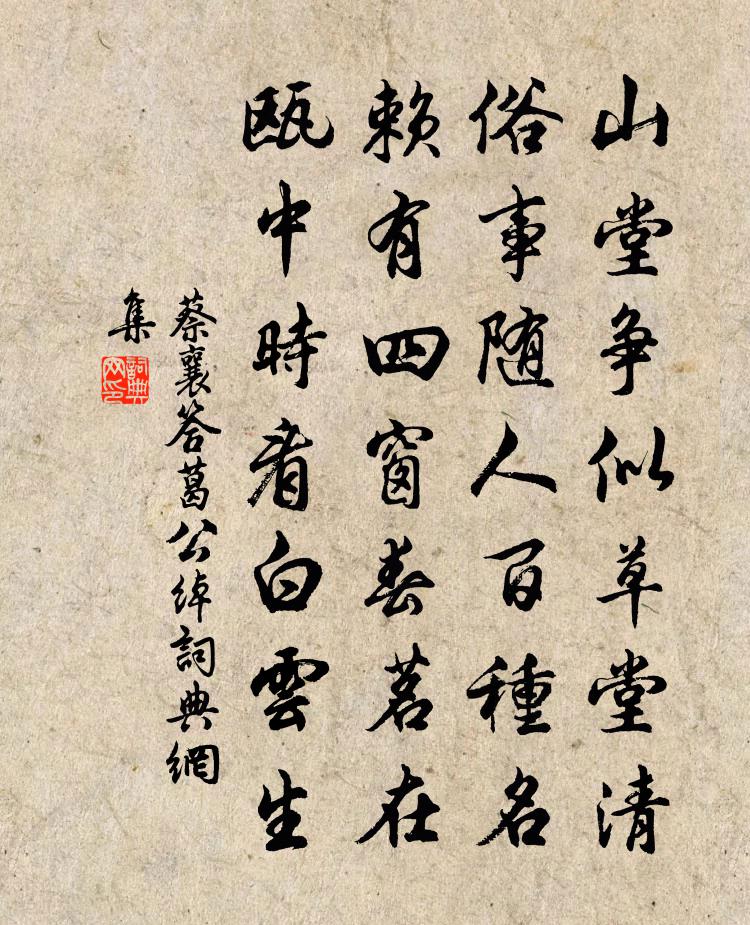 詩詞名句歷史字典書法欣賞書法字典國語詞典說文解字康熙字典古漢語字典標 題 作 者 詩 句 答葛公綽作者:蔡襄 朝代:宋代答葛公綽原文山堂爭似草堂清,俗事隨人百種名。賴有四窗春茗在,甌中時看白雲生。詩詞問答問:答葛公綽的作者是誰?答:蔡襄問:答葛公綽寫於哪個朝代?答:宋代蔡襄答葛公綽書法欣賞答葛公綽書法作品詩詞推薦贈明侍者釋道璨〔宋代〕好詩無音律,至文難言說。學之無他術,先要心路絕。兀坐送清晝,萬事付一拙。如是三十年,大巧自發越。萬象寄童梅岩顧逢〔宋代〕數盡寒更六十點,鐘聲聽了又雞催。枕間展轉不得睡,底事故人猶未來。贈刑部馬侍郎(馬總,時副晉公東征)韓愈〔唐代〕紅旗照海壓南荒,征入中台作侍郎。暫從相公平小寇,便歸天闕致時康。叔父給事輓詞十首黃庭堅〔宋代〕隴上千山漢節回,掃除民蜮不為災。蜀茶總入諸蕃市,胡馬常從萬里來。石樓張耒〔宋代〕清溪若奔虬,八鎖束其頸。奔騰去莫脫,擺掣姿驍猛。嘈嘈戰風霆,萬鼓助其勁。聲驅石崖動,氣抱晴日冷。我來臨江仙(鄭鹽生日)洪适〔宋代〕向日鵷行瞻鳳彩,共期直上金鑾。卻來持節海雲邊。身兼三使者,名是一仙官。漢室中興高密冠,千年苗裔蟬聯。金明池楊簡〔宋代〕燕語鶯啼,杏壇春色。為甚無人領略,又添個山青水綠。是多多少少明明白白,對面不識。方且蕩然放逸,不亦文望雪李世民〔唐代〕凍雲宵遍嶺,素雪曉凝華。入牖千重碎,迎風一半斜。不妝空散粉,無樹獨飄花。縈空慚夕照,破彩謝晨霞。乍晴劉克莊〔宋代〕天更商量雨,人都領略晴。晚山青妥帖,野水白縱橫。鷺立沙頭影,蜂喧樹底聲。筍輿扶病出,邂逅亦詩成。用劉子默韻題瘼亭李新〔宋代〕醉頭兀兀接?斜,客宦歸來賦白華。小洞方池初著意,坐看梅雨數殘花。感皇恩 洛西為劉景玄賦秋蓮曲元好問〔金代〕金粉拂霓裳,凌波微步。瘦玉亭亭倚秋渚。澹香高韻,費盡一天清露。惱人容易被、西風誤。微雨岸花,斜陽汀樹題池州貴池亭杜牧〔唐代〕勢比凌歊宋武台,分明百里遠帆開。蜀江雪浪西江滿,強半春寒去卻來。塔山和徐道暉壁間韻薛師石〔宋代〕寺在一山頂,江分兩岸田。憑何發詩興,題字古廊邊。近地今埋骨,閒人亦助錢。昨宵留宿意,不忍上歸船。贈俞碧岩體仁刊圖書方回〔宋代〕上古包羲卦初畫,五行之金刀為革。兩儀四象生□□,□初一圈為太極。八卦之上六十四,右乾左坤名曰易。因重夜吟呈趙東岩戴復古〔宋代〕汲井漱殘酒,行吟到夜分。一軒清似洗,萬籟寂無聞。風送迎秋雨,天收翳月雲。雞鳴庭戶白,人事又紛紛。賀進士駱用錫登第鄭谷〔唐代〕苦辛垂二紀,擢第卻沾裳。春榜到春晚,一家榮一鄉。題名登塔喜,醵宴為花忙。好是東歸日,高槐蕊半黃。平時兄弟間十三章四句送定叟弟之官桂林張栻〔宋代〕聞之元城公,南州宜止酒。止酒縱未能,少飲還得不。夜坐聞雨寄嚴十少府武元衡〔唐代〕多負雲霄志,生涯歲序侵。風翻涼葉亂,雨滴洞房深。迢遞三秋夢,殷勤獨夜心。懷賢不覺寐,清磬發東林。嘉陵江過合州漢初縣下范成大〔宋代〕井徑東川縣,山河古合州。木根拏斷岸,急雨沸中流。關下嘉陵水,沙頭杜老舟。江花應好在,無計會江樓。曉將別元稹〔唐代〕風露曉淒淒,月下西牆西。行人帳中起,思婦枕前啼。屑屑命僮御,晨裝儼已齊。將去復攜手,日高方解攜。名句推薦庭院深深深幾許,楊柳堆煙,簾幕無重數。歐陽修《蝶戀花·庭院深深深幾許》 若言琴上有琴聲,放在匣中何不鳴?蘇軾《琴詩》 吏呼一何怒,婦啼一何苦。杜甫《石壕吏》 鷹擊長空,魚翔淺底,萬類霜天競自由。 * 《沁園春·長沙》 不知近水花先發,疑是經冬雪未銷。張謂《早梅》 深秋寒夜銀河靜,月明深院中庭。尹鶚《臨江仙·深秋寒夜銀河靜》 丹灶初開火,仙桃正落花。孟浩然《清明日宴梅道士房 / 宴梅道士山房》 聽風聽雨過清明。愁草瘞花銘。吳文英《風入松·聽風聽雨過清明》 雲山萬重兮歸路遐,疾風千里兮揚塵沙。蔡文姬《胡笳十八拍》 春江暖漲桃花水。畫舫珠簾,載酒東風裡。顧德輝《蝶戀花·春江暖漲桃花水》