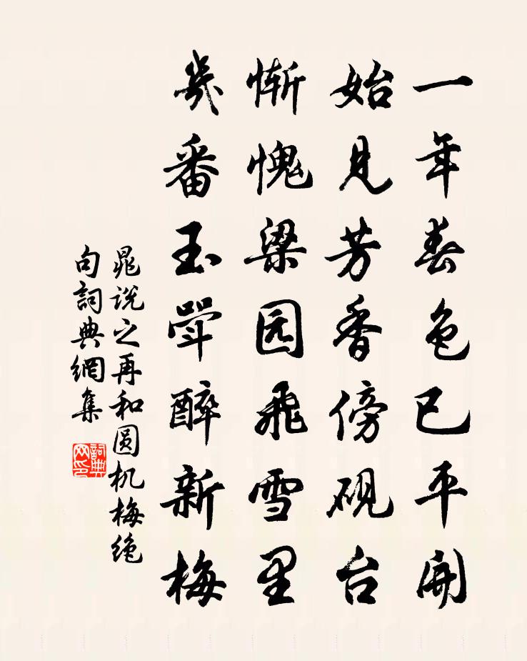 詩詞名句歷史字典書法欣賞書法字典國語詞典說文解字康熙字典古漢語字典標 題 作 者 詩 句 再和圓機梅絕句作者:晁說之 朝代:宋代再和圓機梅絕句原文一年春色已平開,始見芳香傍硯台。慚愧梁園飛雪裡,幾番玉斝醉新梅。詩詞問答問:再和圓機梅絕句的作者是誰?答:晁說之問:再和圓機梅絕句寫於哪個朝代?答:宋代晁說之再和圓機梅絕句書法欣賞再和圓機梅絕句書法作品詩詞推薦扶病春亭劉言史〔唐代〕強梳稀發著綸巾,舍杖空行試病身。花間自欲裴回立,稚子牽衣不許人。送趙寬堂二首杜范〔宋代〕兩片兩山雲,偶爾連空飛。一去向空谷,一留伴殘暉。招招浙江渡,激激風吹衣。仰頭有鴻鵠,孰使主事違。何時和姜總管喜民間種麥虞儔〔宋代〕腰鐮刈晚禾,荷鋤種新麥。田家競作苦,羔豚勞歲夕。翠浪愜初懷,黃雲期後穫。晴暖得天時,肥瘠隨地力。賸欲丁亥歲作(中元甲子)羅隱〔唐代〕病想醫門渴望梅,十年心地僅成灰。早知世事長如此,自是孤寒不合來。谷畔氣濃高蔽日,蟄邊聲暖乍聞雷。滿城沁園春(中秋約僚佐觀擊圓,登懷遠,用前韻)李曾伯〔宋代〕喚麴生來,與常娥約,從太守游。把玉簫聲寄,蕭關短笛,霓裳曲換,清塞重裘。桂影飄搖,桐陰立盡,多少征人僦舍西齋小圃竹樹森植秋日搖落對之翛然因作宋祁〔宋代〕避事長卿志,閒居郎將流。無心嬰外物,有興為高秋。僦舍餘三畝,畸人代一邱。園空樹色至,日淡暝煙浮。紺葉同誼夫國才餞季然於普門院取壁間五字詩各探王灼〔宋代〕滿酌青慈杯,醉臥白石枕。借予驪駒曲,侑我河朔飲。次韻石七三六言七首黃庭堅〔宋代〕為君試講古學,此事可牋天公。君看花梢朝露,何如松上霜風。浙東元相公書嘆梅雨鬱蒸之候,因寄七言劉禹錫〔唐代〕稽山自與岐山別,何事連年鸑鷟飛。百辟商量舊相入,九天祗候老臣歸。平湖晚泛窺清鏡,高閣晨開掃翠微。今日春日題李中丞樊川別墅項斯〔唐代〕心知受恩地,到此亦裴回。上路移時立,中軒隔宿來。川光通沼沚,寺影帶樓台。無限成蹊樹,花多向客開。上制置侍郎度正〔宋代〕龍虎西頭象更雄,巍然坐覺馬群空。三千威已行方外,百萬兵元貯腹中。蜀國歡聲連上國,秋風和氣似春風。只今魯望憫承吉之孤為詩序邀予屬和欲用予道振其孤…良友皮日休〔唐代〕先生清骨葬煙霞,業破孤存孰為嗟。幾篋詩編分貴位,一林石筍散豪家。兒過舊宅啼楓影,姬繞荒田泣稗花。唯我晚投大雲峰二首李彌遜〔宋代〕高樹風生晚徑秋,平沙無日下鳧鷗。野航邀月渡溪北,古寺僧歸鍾殷樓。酹江月/念奴嬌佚名〔宋代〕陽春歌闕,正玉梅翻雪,江濤如海。秀孕東陽山水,果誕黑頭元宰。早蹋天扉,洪鈞獨運,嘉會符千戴。銜杯樂聖郡齋水閣閒書亭館文同〔宋代〕亭館翛翛度日,園林寂寂經春。且遮新筍夸客,莫掃殘花悶人。浣溪沙仇遠〔宋代〕豆蔻枝頭冷蝶飛。荼縻花里老鶯啼。懶留春住聽春歸。北海芳尊誰共醉,東山游屐近應稀。小窗寒草送春時。覽鏡見白髮數莖光鮮特異權德輿〔唐代〕秋來皎潔白須光,試脫朝簪學酒狂。一曲酣歌還自樂,兒孫嬉笑挽衣裳。道中觀戽水戲書張蘊〔宋代〕秧馬泥深繭犢閒,燭龍顧影桔槔間。尋常六月江南雨,不比君王帑藏慳。緣識宋太宗〔宋代〕造化等齊,不分高低。神筆才智,海岳淒淒。稀代為寶,舉意東西。毫端萬象,沃盪狂迷。次韻叔孝郎中送游黃山見一老之作二首李彌遜〔宋代〕路斷人稀山正深,隔林鐘鼓報新音。已窮渡水沿崖力,更盡眠雲坐石心。名句推薦人生一世,草長一春。佚名《增廣賢文·上集》 不知細葉誰裁出,二月春風似剪刀。賀知章《詠柳 / 柳枝詞》 半死梧桐老病身,重泉一念一傷神。白居易《為薛台悼亡》 玉漏銀壺且莫催,鐵關金鎖徹明開。崔液《上元夜六首·其一》 歲月匆匆留不住,鬢已星星堪鑷。吳淵《念奴嬌·我來牛渚》 有三秋桂子,十里荷花。柳永《望海潮·東南形勝》 山氣日夕佳,飛鳥相與還。陶淵明《飲酒·其五》 見善如不及,見不善如探湯孔子弟子《論語·季氏篇》 故人何不返,春華復應晚。柳惲《江南曲》 鷙鳥將擊,卑飛斂翼;猛獸將搏,弭耳俯伏;聖人將動,必有愚色。姜子牙《六韜·武韜·發啟》