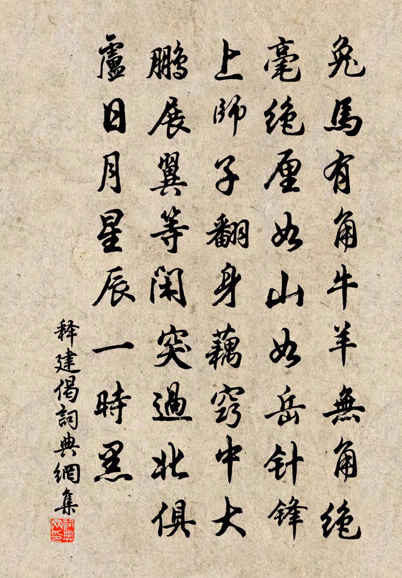 詩詞名句歷史字典書法欣賞書法字典國語詞典說文解字康熙字典古漢語字典標 題 作 者 詩 句 偈作者:釋建 朝代:宋代偈原文兔馬有角,牛羊無角。絕毫絕厘,如山如岳。針鋒上師子翻身,藕竅中大鵬展翼。等閒突過北俱盧,日月星辰一時黑。詩詞問答問:偈的作者是誰?答:釋建問:偈寫於哪個朝代?答:宋代釋建偈書法欣賞偈書法作品詩詞推薦酬黃帝錫見和張埴〔宋代〕龍髯初一振,人盡息其機。池靜朱華出,山涼白鳥歸。灑能無已已,詩豈去非非。仰面楚天過,浮雲似白衣。挽鄭永福劉克莊〔宋代〕竹間梧畔故應佳,非但才高詩亦葩。世胄蚤通樞相譜,里人知是大魁家。誰言陶令才為米,不遣潘郎再種花。□□題畫扁王偘〔宋代〕野橋人跡少,林靜谷風閒。誰識孤峰頂,悠然宇宙寬。句釋曉瑩〔宋代〕誰知老子懶成癖。偈傾一百六十九首釋智朋〔宋代〕頭頂天,腳踏地。聞鼓聲上來,減多少意氣。他殺不如 * ,參他不如參已。森羅萬像,是汝諸人知識。森羅萬像次單君范袖來汪西皋所譔詠秋十章以示因和之陳著〔宋代〕飛飛鴻雁舊山川,有淚沾衣感昔賢。猛拍闌乾因猛省,從來滄海變桑田。送別一西堂釋紹嵩〔宋代〕一老說淡話,志懷絕險艱。別離從闕下,遊戲且人間。落羽羞言命,臨岐強破顏。住山須鈯斧,此句急追還。晚步門外書觸目陸游〔宋代〕數椽茆屋鏡湖傍,喬木蒼煙一徑長。酒賤過門多醉叟,天寒棲畝有餘糧。歌呼草市知人樂,簫鼓叢祠喜歲穰。只道江西再逢周璉貫休〔唐代〕六七年不見,相逢鬢已蒼。交情終淡薄,詩語更清狂。未得丹霄便,依前四壁荒。但令吾道在,晚達亦何妨。邯鄲道楊維楨〔元代〕忽見邯鄲道,千秋萬歲哀。君王金不惜,應築望鄉台。金縷曲(奇番總管周耐軒生日)劉辰翁〔宋代〕春入番江雨。滿湖山、鶯啼燕語,前歌后舞。聞道行驄行且止,卻聽譙樓更鼓。正未卜、陰晴同否。老子胸中高小次韻梁教章宰喜雪陳造〔宋代〕窮臘缺膏潤,何異客病渴。龍伯供雪事,落勢不受遏。繽紛一再余,旋報焦卷活。去年痛無年,回首氣尚奪。流亡挽竹薌龔侍郎王義山〔宋代〕猶記烏台第一章,當年物論忒雌黃。人心自有公非是,天理豈能終晦亡。奸魄雖生名已死,彈文尚濕墨猶香。偷生段九秀才處見亡友呂衡州書跡柳宗元〔唐代〕交侶平生意最親,衡陽往事似分身。袖中忽見三行字,拭淚相看是故人。九日初四日分韻得然字徐璣〔宋代〕去載羈旅身,千里望群賢。今夕良燕會,況乃佳節前。涼風日已多,歲序日已遷。春時種藂菊,秋花滿籬邊。采之和孔司封題蓬萊閣吳可幾〔宋代〕皇唐舊相元才子,曾作蕃宣式燕遨。郛郭上當星紀分,軒甍全壓聞風高。賓僚會集簪裾盛,衙隊周環鼓吹豪。不出甲辰八月辭故里 \ 將入武林張煌言〔明代〕國亡家破欲何之?西子湖頭有我師。日月雙懸于氏墓,乾坤半壁岳家祠。慚將赤手分三席,敢為丹心借一枝。他日依韻和酬閬州劉侍禁季孫見寄強至〔宋代〕別來雙鬢一衰翁,近喜劉郎信息通。劍氣未閒頻犯斗,賦聲無用尚摩空。傳聞蜀道逾天上,見說城南冠閬中。山水歌南昌老翁〔宋代〕藍采禾,藍采禾,塵世紛紛事更多。爭如賣藥沽酒飲,歸去深崖拍手歌。信士畫真請贊釋印肅〔宋代〕蒼天蒼天。悟無生法,談不說禪。開兩片皮,括地該天。如何是佛,十萬八千。名句推薦田家幾日閒,耕種從此起。韋應物《觀田家》 不責人小過,不發人陰私,不念人舊惡洪應明《菜根譚·概論》 文章憎命達,魑魅喜人過。杜甫《天末懷李白》 經一失長一智馮夢龍《警世通言·卷三》 樓外垂楊千萬縷。欲系青春,少住春還去。朱淑真《蝶戀花·送春》 雙燕飛來,陌上相逢否?撩亂春愁如柳絮。馮延巳《鵲踏枝·幾日行云何處去》 野店桃花紅粉姿,陌頭楊柳綠菸絲。趙孟頫《東城》 回樂烽前沙似雪,受降城外月如霜。李益《夜上受降城聞笛》 忠臣不借人以力,貞女不假人以色。劉向《列女傳·貞順傳·楚白貞姬》 我愛山中春,蒼崖鳥一聲。元鵬《山中四詠》