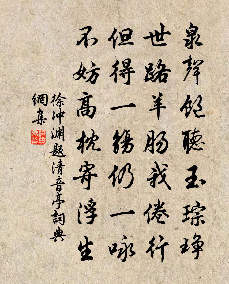 詩詞名句歷史字典書法欣賞書法字典國語詞典說文解字康熙字典古漢語字典標 題 作 者 詩 句 題清音亭作者:徐沖淵 朝代:宋代題清音亭原文泉聲飽聽玉琮琤,世路羊腸我倦行。但得一觴仍一詠,不妨高枕寄浮生。詩詞問答問:題清音亭的作者是誰?答:徐沖淵問:題清音亭寫於哪個朝代?答:宋代徐沖淵題清音亭書法欣賞題清音亭書法作品詩詞推薦獻金陵牧薛大夫白馬詩王曾〔宋代〕白馬披絲練一團,今朝被絆欲行難。雪中放去唯留跡,月下牽來祇見鞍。賂北長鳴天外遠,臨風斜墜耳邊寒。自知題譚君詩集姚勉〔宋代〕建州衣缽傳武功,山谷濠梁窺謝公。譚君之詩何自工,君家詩有冰清翁。野塘千頃涵秋風,資奩盡在奚囊中。蘇仙折刑部海棠戲贈聖俞二首歐陽修〔宋代〕搖搖牆頭花,艷艷爭青娥。朝見開尚少,暮看繁已多。不惜花開繁,所惜時節過。昨日枝上紅,今日隨流波。物理和鮑昌朝湖上二首吳芾〔宋代〕一片湖光淨見沙,晚來閒上釣鯿槎。山橫平野堆寒玉,水繞孤城綰臥蛇。遙認茶煙知禁苑,忽聞機杼得人家。夕陽春歸二絕和高希遠韻蕭炎〔宋代〕廚供櫻筍上春盤,把酒留春少住難。只是檐花前夜雨,明朝便作釀梅看。九侯山神詩蔡如松〔宋代〕誰言少康真禹子,子孫九人流到此。誰言鬼侯遭紂虐,冤魄至今靈故壘。誕哉二說太荒唐,未識根原有初始。我曾送仲彌性赴蘄水李洪〔宋代〕中興岳牧任詞人,分虎初班楚澤春。四紀才名文價重,一麾江海璽書新。眷深丹扆虛前席,祖意黃梅試問津。報政和顏長官百詠客路朱繼芳〔宋代〕哀猿啼斷暮雲深,摸索床頭未盡金。莫道他鄉千萬里,去家三日幾般心。雲棲釋文珦〔宋代〕我頗愛雲散,雲不嫌我頑。兩心既莫逆,每事常相關。靜室雲守護,空門雲往還。雲棲良自嘉,雲與身俱閒。許村傅夢得〔宋代〕信步水之濱,閒中著此身,蕭條僧寺近,來往客舟頻。村酒難成醉,山花亦有春。人生要行樂,何苦戀京塵。余有足疾因感柳子厚跂烏篇姜特立〔宋代〕跂烏肖翹叢薄間,低頭塌翅人所憐。既無三足相疑妒,恐可夤緣到日邊。嘉泰三年皇后冊寶十三首佚名〔宋代〕虹輝璨爛,雲篆綢繆。絳節前導,瑞光上浮。瑤階玉扉,既集長秋。欽承天寵,永荷帝休。寄題安福朱景源景雲所居二首周必大〔宋代〕友悌人知天亦知,風雷會變籜龍兒。從今直節亭前後,枝茂宗生竹也慈。寒食相將諸子游翟得園十詩楊萬里〔宋代〕荊溪老守底風流,喔就千詩一笑休。天欲做春無去處,只堆濃綠柳梢頭。四望梅方蒙仲〔宋代〕摽梅其實七,此特損其三。風賦久不作,有詩誰共談。九日送酒與朱元晦韓元吉〔宋代〕平生膛酒陶元亮,曾繞東籬望白衣。底事秋來猶止酒,重陽須插菊花歸。送友人赴省試劉宰〔宋代〕月滿千門夜未央,憶陪多士湊文場。露將寒透銀袍冷,興與秋來筆力剛。十載轉頭成昨夢,一身為客尚他鄉。為言和張寺丞功父八絕句楊萬里〔宋代〕約齋太瘦古僊真,寄我詩篇字字新。受業陳三能幾日,無端參換謪仙人。游龍門分題十五首石樓歐陽修〔宋代〕高灘復下灘,風急刺舟難。不及樓中客,徘徊川上山。夕陽洲渚遠,唯見白鷗翻。枕上得句寄潛君升胡仲參〔宋代〕無奈蓬窗雪打聲,夢魂才穩又還驚。枕食如許猶嫌冷,多少閻閭睡不成。名句推薦見一葉落,而知歲之將暮劉安及其門客《淮南子·說山訓》 蕭蕭梧葉送寒聲,江上秋風動客情。葉紹翁《夜書所見》 秋娘渡與泰娘橋,風又飄飄,雨又蕭蕭。蔣捷《一剪梅·舟過吳江》 春風疑不到天涯,二月山城未見花。歐陽修《戲答元珍》 深山畢竟藏猛虎,大海終須納細流。佚名《增廣賢文·上集》 應是夜寒凝。惱得梅花睡不成。黃升《南鄉子·冬夜》 去年戰桑乾源,今年戰蔥河道。李白《戰城南》 福輕乎羽,莫之知載;禍重乎地,莫之知避。莊子《莊子·內篇·人間世》 八月寒葦花,秋江浪頭白。李頎《送劉昱》 年年歲歲望中秋,歲歲年年霧雨愁。曾幾《癸未八月十四日至十六夜月色皆佳》