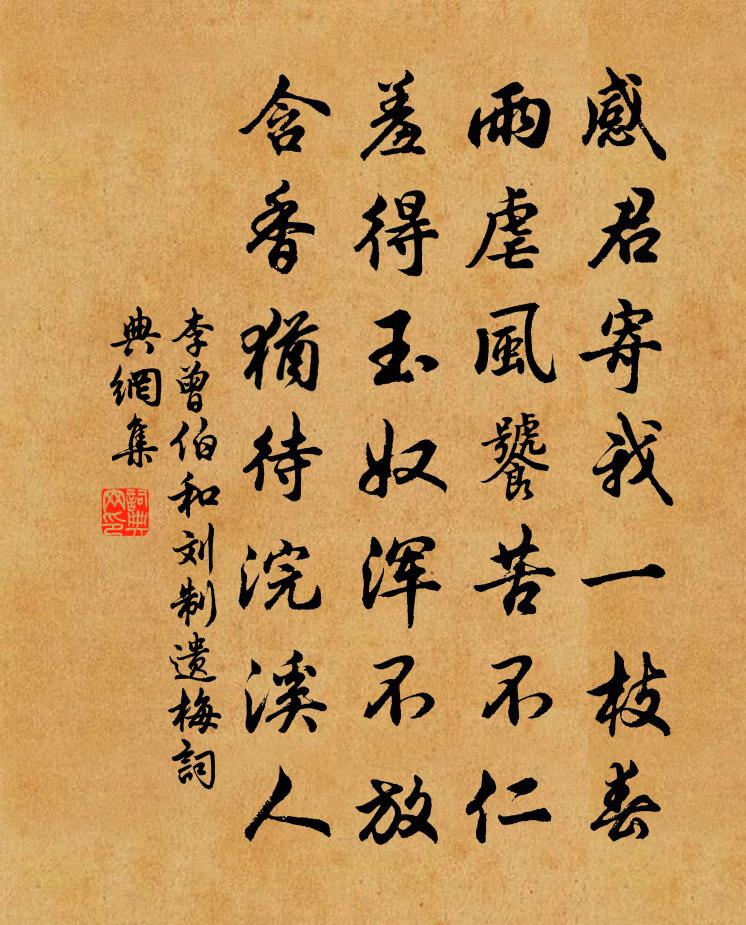 詩詞名句歷史字典書法欣賞書法字典國語詞典說文解字康熙字典古漢語字典標 題 作 者 詩 句 和劉制遺梅作者:李曾伯 朝代:宋代和劉制遺梅原文感君寄我一枝春,雨虐風饕苦不仁。羞得玉奴渾不放,含香猶待浣溪人。詩詞問答問:和劉制遺梅的作者是誰?答:李曾伯問:和劉制遺梅寫於哪個朝代?答:宋代李曾伯和劉制遺梅書法欣賞和劉制遺梅書法作品詩詞推薦重到毓村宅有感白居易〔唐代〕欲入中門淚滿巾,庭花無主兩回春。軒窗簾幕皆依舊,只是堂前欠一人。酬仲微以舍弟忝直螭階余近塵鳳署見慶之作宋庠〔宋代〕世隱東畿賦遂功,荊枝相樂本田廬。偶隨幽鳥同還俗,何意驚鼷並載車。浴殿封芝慚視草,史階簪筆玷成書。猶欣雜述林泳〔宋代〕關令著黃帝曰,柱史稱聖人云。俗學謾夸臆說,仙書猶述舊聞。書懷鄧林〔宋代〕西風吹羽扇,吾道竟淒涼。上坂勞騏驥,低巢窘鳳凰。可求非富貴,無用是文章。冉冉深林底,幽蘭正自香。樵童自入園來獻海棠因賦二章1舒岳祥〔宋代〕深蔓迷歸路,荒蹊未有家。誰知寒雨里,也作小春花。菌紫松間茁,菘黃澗底芽。道人新破戒,窗外種紅茶。水龍吟(次利漕范右司韻)京鏜〔宋代〕四年留蜀無補,好是求歸得去。風帆百尺,煙波萬里,寧辭掀舞。楚尾吳頭,我家何在,西山南浦。想珠簾畫棟,水調歌頭(壽長兄)廖行之〔宋代〕天下偉人物,荊楚號名流。幅員千里,英氣磅礴岳南州。雁嶠高參翼軫,石鼓下盤朱府,袞袞應公侯。常記生申旦送魏郡李太守赴任王維〔唐代〕與君伯氏(一作兄)別。又欲與君離。君行無幾日。當復隔山陂。蒼茫秦川盡。日落桃林塞。獨樹臨關門。黃河向舟泊宜都張嵲〔宋代〕二年峽內厭羈束,此日江湖欣渺茫。炯炯晴鷗明晚色,悠悠殘日動波光。遠眸盡處即他境,疊嶂痕邊仍舊鄉。自是寄致仁歐陽少師曾鞏〔宋代〕四海文章伯,三朝社稷臣。功名垂竹帛,風義動簪紳。此道推先覺,諸儒出後塵。忘機心皎皎,樂善意循循。大略元方用韻見寄次韻奉謝兼呈元東二首陳與義〔宋代〕一歡玄發水東流,兩腳黃塵閱幾州。王湛時須看周易,虞卿未敢著春秋。不辭彭澤腰常折,卻得邯鄲夢少留。有句以虎臂杖送李任道二首黃庭堅〔宋代〕走送書堂倚絳紗,瘦藤七尺走驚蛇。晴沙每要交頭拄,尋偏漁翁野老家。海棠盛開而雨方岳〔宋代〕醉紅睡去不勝扶,遮盡丹荑蓋綠蕪。四立壁成花世界,一年春在錦屠蘇。山中富貴遽如許,詩外豪奢有是夫。已與和彥立兄贈信上人王之道〔宋代〕鼎社年來得志閒,一杯聊復效逃禪。新詩莫漫驚流俗,恐被旁人喚皎然。中{左山右尋}春祀二首劉克莊〔宋代〕少者遊方老守閭,獨攜魚菽薦幽墟。何時汝輩無行役,歲歲為翁策蹇驢。清華堂戴表元〔宋代〕人生隨分有清華,萬竹岡頭第一家。甃塹水溫初荇葉,粉牆風細欲梨花。衣冠蒼皓迎如畫,湘素朱黃積滿車。從此寄西弟六首劉黻〔宋代〕寂寂書堂秋夜涼,一編心畫一爐香。弟兄動是經年別,羞見天邊有雁行。昭信淮上梅堯臣〔宋代〕清淮渺然去,白浪勢如奔。同發已先遠,獨行將向昏。洲長寧辨路,夜泊偶依村。燈火稍覺亂,應聞人語喧。樊運使輓詞樓鑰〔宋代〕科目公餘事,南宮第一人。七閩新使節,三署舊儒臣。倦拜方辭饋,哀良莫贖身。家聲知有繼,仙桂兩枝春。寄相教授二首岳珂〔宋代〕潯陽江上無氈客,別後音書杳未通。蕉鹿定應鄰左講,蓴鱸端是待西風。謾懷離思人猶遠,欲寓吟情句未工。朝列名句推薦念佳人、音塵別後,對此應解相思。晁端禮《綠頭鴨·詠月》 它山之石,可以攻玉。佚名《鶴鳴》 蛇無頭而不行,鳥無翅而不飛。施耐庵《水滸傳·第六十回》 北窗高臥,莫教啼鳥驚著。辛棄疾《念奴嬌·賦雨岩》 機中錦字論長恨,樓上花枝笑獨眠。皇甫冉《春思》 愁無限,消瘦盡,有誰知?閒教玉籠鸚鵡念郎詩。納蘭性德《相見歡·落花如夢淒迷》 江南幾度梅花發,人在天涯鬢已斑。劉著《鷓鴣天·雪照山城玉指寒》 何處望神州?滿眼風光北固樓。辛棄疾《南鄉子·登京口北固亭有懷》 人生不滿百,常懷千歲憂。佚名《增廣賢文·上集》 蕭蕭遠樹疏林外,一半秋山帶夕陽。寇準《書河上亭壁》
