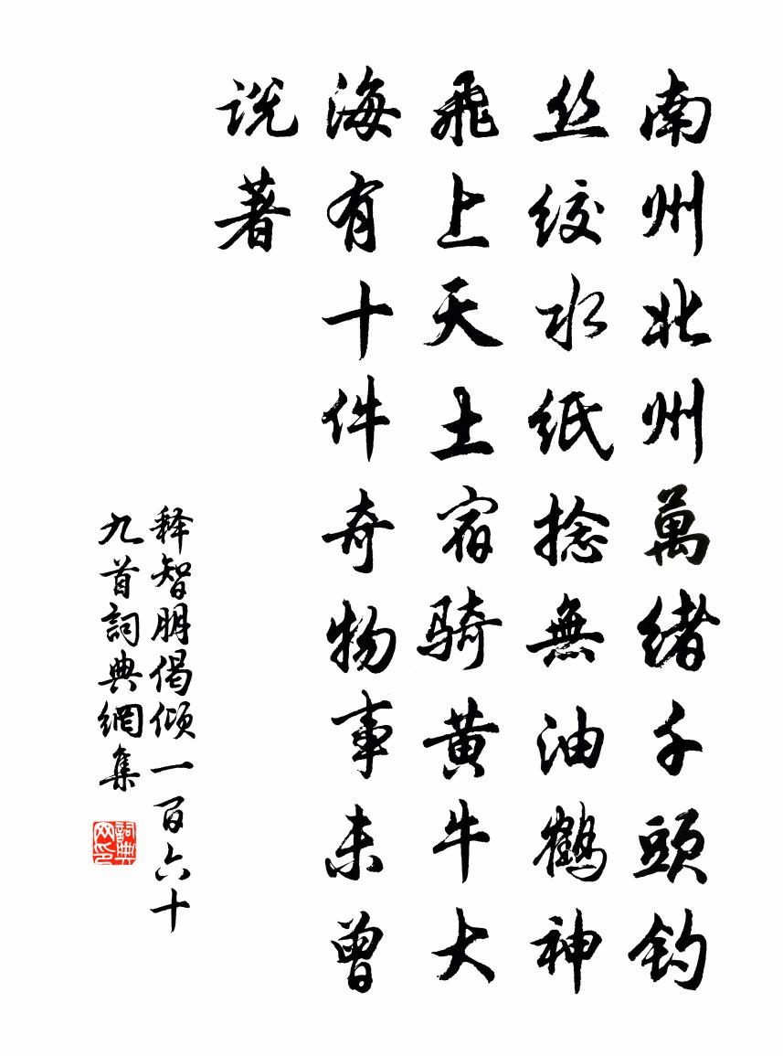詩詞名句歷史字典書法欣賞書法字典國語詞典說文解字康熙字典古漢語字典標 題 作 者 詩 句 偈傾一百六十九首作者:釋智朋 朝代:宋代偈傾一百六十九首原文南州北州,萬緒千頭。釣絲絞水,紙捻無油。鶴神飛上天,土宿騎黃牛。大海有十件奇物事,未曾說著。詩詞問答問:偈傾一百六十九首的作者是誰?答:釋智朋問:偈傾一百六十九首寫於哪個朝代?答:宋代釋智朋偈傾一百六十九首書法欣賞偈傾一百六十九首書法作品詩詞推薦偈頌七十八首釋正覺〔宋代〕一塵具無量剎土,一念超無量劫數。一身現無量眾生,一體合無量諸佛。憶羅浮寄曾元功二首張宋卿〔宋代〕春樹江雲我所思,平生臭味不差池,如何驛使行千里,不把梅花寄一枝。頌十六首釋慧暉〔宋代〕上正之器根密密而信言,中當之器要了了而幽玄,下偏之器見明明而滿天。學人分上事紛紛而玄,主家活計事寂寂偈頌一百零一首釋慧性〔宋代〕爽氣生襟袂,清飈襲四維。白雲抱幽石,冷淡更清奇。玲瓏八面自回合,峭峻一方誰敢窺。蛻龍洞鍾宿〔宋代〕蒼岩磊落任龍蟠,綿亘千年露未乾。一自為霖破壁去,至今風雨逼山寒。水龍吟朱敦儒〔宋代〕曉來極目同雲,曖空降雪花零亂。平生塵想,老來俗狀,都齊驚散。玉鳳凌霄,素虬橫海,一杯相勸。任霓裳學舞徐夫人挽章度正〔宋代〕芬芳蘭蕙畹,籩豆有司存。抱燭丹心苦,深居德性尊。庭前桑有附,戶外竹生孫。遺範章章古,新詩詔後昆。許道寧寒林文同〔宋代〕許生雖學李營丘,墨路縱橫多自出。交柯揮霍裴旻劍,亂蔓淋漓張曉筆。宿南一上人山房施肩吾〔唐代〕窗牖月色多,坐臥禪心靜。青鬼來試人,夜深弄燈影。送陳擇之張栻〔宋代〕君能千里來,乃作觸熱去。涼秋幸非遙,歸計無已遽。向來文字間,講論有平素。及茲共王事,益得君佳處。幾微長相思(紹興戊辰閏中秋)向子諲〔宋代〕年重月,月重光。萬瓦千林白似霜。扁舟入醉鄉。山蒼蒼。水茫茫。嚴瀨當時不是狂。高風引興長。偈頌二十九首釋雲〔宋代〕是非只為多開口,煩惱皆因強出頭。致使韶陽要打殺,思量著甚底來由。嘉陵驛見賈島舊題薛能〔唐代〕賈子命堪悲,唐人獨解詩。左遷今已矣,清絕更無之。畢竟吾猶許,商量眾莫疑。嘉陵四十字,一一是天資。洞仙歌(和何逢原見壽)何夢桂〔宋代〕青衫白髮,獨倚江樓小。待欲題詩壓崔顥。慨鳳台今在否,白鷺沙洲,芳草外、剩得閒身江表。醉來疑夢裡,夢入浣溪沙(雨中荷花)沈瀛〔宋代〕雨點真珠水上鳴。更將青蓋一時傾。總是江妃來墜珥,訪娉婷。不為含愁啼粉淚,只因貪愛濕行雲。惟有游魚偏得吳興道中秦觀〔宋代〕僶俛蓽門下,十年守一方。胡為御舟者,挽我置此傍。青山不肯盡,流水故意長。雖雲道理遠,瓦樽有酒漿。次韻蔡瞻明秋園五絕句洪适〔宋代〕芥毛金爪勇難乾,肯作霜花對乍寒。若說乘軒有痴鶴,司晨如此合峨冠。翔仞當年覽德輝,傳芳花品未思歸。晚來偈頌一百四十一首釋師範〔宋代〕鶴唳於天,魚躍於淵。涵波泳月兮悠悠,乘雲馭風兮翩翩。時哉時哉,不可得而明焉,令人長憶老南泉。餈韻楊公濟奉議梅花十首蘇軾〔宋代〕鮫綃剪碎玉簪輕,檀暈妝成雪月明。肯伴老人春一醉,懸知欲落更多情。洞庭湖君山頌呂岩〔唐代〕午夜君山玩月回,西鄰小圃碧蓮開。天香風露蒼華冷,雲在青霄鶴未來。名句推薦波光水鳥驚猶宿, 露冷流螢濕不飛。湯顯祖《江宿》 曉迎秋露一枝新,不占園中最上春。杜牧《紫薇花》 荷葉出地尋丈,因列坐其下,上不見日。姜夔《念奴嬌·鬧紅一舸》 一向年光有限身,等閒離別易銷魂,酒筵歌席莫辭頻。晏殊《浣溪沙·一向年光有限身》 柳庭風靜人眠晝,晝眠人靜風庭柳。蘇軾《菩薩蠻·回文夏閨怨》 小姑織白紵,未解將人語。李白《湖邊採蓮婦》 寒笛對京口,故人在襄陽。劉昚虛《暮秋揚子江寄孟浩然》 情知已被山遮斷,頻倚闌乾不自由。辛棄疾《鷓鴣天·晚日寒鴉一片愁》 非意相干,可以理遣。房玄齡《晉書·列傳·第六章》 默而識之,學而不厭,誨人不倦,何有於我哉!孔子弟子《論語·述而篇》