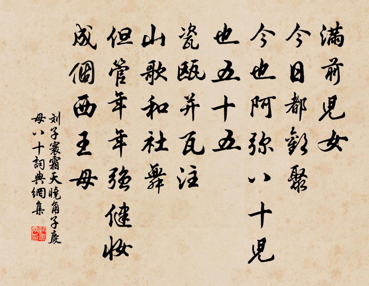 詩詞名句歷史字典書法欣賞書法字典國語詞典說文解字康熙字典古漢語字典標 題 作 者 詩 句 霜天曉角(子慶母八十)作者:劉子寰 朝代:宋代霜天曉角(子慶母八十)原文滿前兒女。今日都歡聚。今也阿彌八十,兒也五十五。瓷甌並瓦注。山歌和社舞。但管年年強健,妝成個、西王母。詩詞問答問:霜天曉角(子慶母八十)的作者是誰?答:劉子寰問:霜天曉角(子慶母八十)寫於哪個朝代?答:宋代問:霜天曉角(子慶母八十)是什麼體裁?答:詞劉子寰霜天曉角(子慶母八十)書法欣賞霜天曉角(子慶母八十)書法作品詩詞推薦次韻答沈明遠韓元吉〔宋代〕如君絕足向風塵,顧我宜為途路人。阿買八分時自笑,阮瞻三語詎能新。狂談尚欲嘲風伯,妙筆真堪賦洛神。得酒友人許惠酒以詩征之皮日休〔唐代〕野客蕭然訪我家,霜威白菊兩三花。子山病起無餘事,只望蒲台酒一車。懷子兼弟時在寧江赴試晁公溯〔宋代〕霸國山河在,秋風草樹疏。羈游今幾日,旅食定何如。夢想池塘句。愁消鴻雁書。細思治安策,勉力獻公車。茶灶劉邊〔宋代〕仙人足戲劇,盤石留渦房。紫陽此來游,與客煮茗嘗。青煙久消歇,白雲時飛揚。至今潭中水,猶作笑語香。蒙茸菩薩蠻(定空賞梅)毛滂〔宋代〕含章檐下眉如月。融酥和粉描疏雪。桃杏莫爭春。凌風台畔人。如今千萬樹。零亂孤村雨。和雨滴瑤觴。歸來肌骨頌古三十九首釋道樞〔宋代〕花萼樓前春正濃,蒙蒙柳絮舞晴空。金錢擲罷嬌無力,笑倚闌乾屈曲中。追和東坡梅花十絕王之道〔宋代〕真香暗逐微風遠,疏影低隨淡日斜。好在黃昏清淺意,一時收拾付詩家。時升見惠芍藥三朵作詩謝之二首郭印〔宋代〕婢妾紛紛只謾爭,美人後出更傾城。東君可是多情思,留取妖容作餞行。西江月佚名〔宋代〕積玉堆金閒事,驚天動地虛名。算來二足是人生,有子方為吉慶。莫道一夔足矣,也須學著徐卿。我翁休笑又添丁唱和盈軸而燕集未期小詩請廣文兄為遨頭黃公度〔宋代〕煩君管領東君手,收拾風光尊俎中。與作遨頭共春燕,何須擁鼻學秋蟲。誰憐老子興不淺,自笑窮人詩轉工。趁取謝賜臘藥感遇之什范成大〔宋代〕鴻寶刀圭下九關,十年長奉璽封看。扶持蒲柳身猶健,收拾桑榆歲又寒。天地恩深雙鬢雪,山川途遠一心丹。疲甿鄰月堂求頌釋正覺〔宋代〕畦衣我是出塵人,卜築高堂與月鄰。床上金刀香剪佳,篋中玉斧冷修輪。寒癯破夢無嫌病,清白傳家不愧貧。門外答永新宗令寄石耳黃庭堅〔宋代〕飢欲食首山薇,渴欲飲潁川水。嘉禾令尹清如冰,寄我南山石上耳。筠籠動浮煙雨姿,瀹湯磨沙光陸離。竹萌粉餌嘲道旁楓松相倚楊萬里〔宋代〕雙楓一松相後前,可憐老翁依少年。少年翡翠新衫子,老翁深衣青布被。更看秋風清露時,少年再換輕紅衣。莫教復雨方回〔宋代〕鬱蒸終不解,白晝忽昏迷。樹暗全如暮,禽驚誤欲棲。銀絲斜翠壁,雪練墮青梯。壯觀何須數,茫茫后土泥。送趙信州二首劉克莊〔宋代〕君於朝列號名流,信在江東亦望州。保抱彼民思父母,齎咨吾輩惜交遊。香凝應物吟詩榻,虹貫元章載畫舟。澗上和裴僕射移官言志(一作和裴僕射寄韓侍郎)張籍〔唐代〕身在勤勞地,常思放曠時。功成歸聖主,位重委群司。看壘台邊石,閒吟篋里詩。蒼生正瞻望,難與故山期。樂天劉克莊〔宋代〕眾評白傅謚,誰得樂天心。小太宗英主,臨朝謚醉吟。法雲寺和湯立賢留題王之道〔宋代〕寺占湖邊數畝山,杖藜偷得一朝閒。昨朝恰別居巢長,又喜新詩在壁間。送楊辟秀才歐陽修〔宋代〕吾奇曾生者,始得之太學。初謂獨軒然,百鳥而一鶚。既又得楊生,群獸出麟角。乃知天下下,所識慚未博。楊生名句推薦君子進德修業。忠信所以進德也。修辭立其誠,所以居業也。佚名《易傳·文言傳·乾文言》 傷高懷遠幾時窮。無物似情濃。張先《一叢花令·傷高懷遠幾時窮》 無求到處人情好,不飲任他酒價高。佚名《增廣賢文·上集》 惟有今宵,皓彩皆同普。郭應祥《醉落魄·丙寅中秋》 金玉其外,敗絮其中劉基《賣柑者言》 征人去日殷勤囑,歸雁來時數附書。王維《伊州歌》 帶長劍兮挾秦弓,首身離兮心不懲。屈原《國殤》 幽徑無人獨自芳,此恨憑誰訴。曹組《卜運算元·蘭》 招魂楚些何嗟及,山鬼暗啼風雨。元好問《摸魚兒·雁丘詞 / 邁陂塘》 喧啾百鳥群,忽見孤鳳凰。韓愈《聽穎師彈琴》