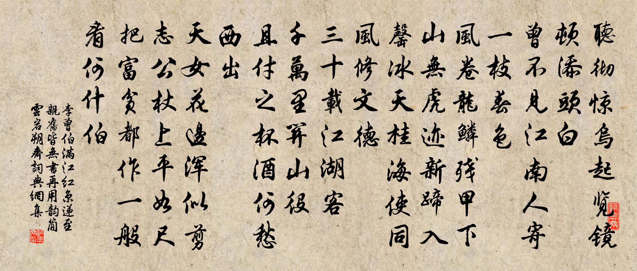 詩詞名句歷史字典書法欣賞書法字典國語詞典說文解字康熙字典古漢語字典標 題 作 者 詩 句 滿江紅(京遞至,親舊皆無書,再用韻簡雲岩、朔齋)作者:李曾伯 朝代:宋代原文聽徹驚烏,起覽鏡、頓添頭白。曾不見、江南人寄,一枝春色。風卷龍鱗殘甲下,山無虎跡新蹄入。罄冰天、桂海使同風,修文德。三十載,江湖客。千萬里,關山役。且付之杯酒,何愁西出。天女花邊渾似剪,志公杖上平如尺。把富貧、都作一般看,何什伯。詩詞問答問:《滿江紅(京遞至,親舊皆無書,再用韻簡雲岩、朔齋)》的作者是誰?答:李曾伯問:該詩寫於哪個朝代?答:宋代問:該詩是什麼體裁?答:詞書法欣賞滿江紅(京遞至,親舊皆無書,再用韻簡雲岩、朔齋)書法作品詩詞推薦贈范曄陸凱〔南北朝〕折花逢驛使,寄與隴頭人。江南無所有,聊寄一枝春。用晦翁十梅詩韻酬張伯修孫子直吳泳〔宋代〕為花能工詩,不如賦拙賦。珍重舂陵翁,能尋所樂處。永州萬石亭歐陽修〔宋代〕天於文章生子厚,文章稟予獨艱文章哉。超凌文章驟拔擢,過盛輒傷摧。苦其危慮心,常使鳴聲哀。投以空曠地,愁倚闌令晏幾道〔宋代〕憑江閣,看煙鴻,恨春濃。還有當年聞笛淚,灑東風。時候草綠花紅,斜陽外、遠水溶溶。渾似阿蓮雙枕畔,畫屏梧桐樹佚名〔宋代〕一更里,調神氣。意馬心猿盡拘系。莫放閒遊戲。昏昏默默煉胎息。開卻天門地戶閉。果然通玄理。威惠廟呂璹〔宋代〕當年平賊立殊勳,時不旌賢事忍聞。唐史無人修列傳,漳江有廟祀將軍。遠別離張耒〔宋代〕遠別離,明當入蜀去。酒酣日落客心驚,起與僕夫先議路。引車在庭牛在槽,桐枝裊裊秋風豪。別情惆悵氣不下,湖南江西道中十首劉克莊〔宋代〕去年冬至投僧寺,今歲陽生宿店家。獨夜無人堪晤語,青燈相對結寒花。景仁書雲去冬因酒病耳病牙遂不入洛以詩寄呈司馬光〔宋代〕許昌攜手盡時英,況復新開甲第成。醉里都將春作達,老來不向酒藏情。齒疏無廢銜杯趣,耳病猶分度曲聲。舊友題李德邵櫱庵仲並〔宋代〕綺繻不復尚驕奢,經始菟裘謝物華。戶外韋衣真隱者,屏間孔雀尚豪家。幾年汗簡編檮杌,晚歲薰爐負辟邪。誰謂御閣春帖子夏竦〔宋代〕青逵布序韶暉盛,紫禁乘春樂事多。海域晏清無夕慮,齋居宣室順天和。詠史詩七里灘胡曾〔唐代〕七里青灘映碧層,九天星象感嚴陵。 * 上無絲竹,不是高人誰解登?格卑韓偓〔唐代〕格卑嘗恨足牽仍,欲學忘情似不能。入意雲山輸畫匠,動人風月羨琴僧。南朝峻潔推弘景,東晉清狂數季鷹。惆悵長相思王之道〔宋代〕吳江楓。吳江風。索索秋聲飛亂紅。晚來歸興濃。淮山西,淮山東。明月今宵何處同。相尋魂夢中。題航子王安石〔宋代〕愛此江邊好,留連至日斜。眠分黃犢草,坐占白鷗沙。夏日閒書墨君堂壁二首文同〔宋代〕先人有敝廬,涪水之東邊。我罷漢中守,歸此聊息焉。是時五六月,赤日烘遙天。山川盡糝燥,草木皆焦燃。塵襟賢者之孝二百四十首韋溫林同〔宋代〕常恐愧屋漏,追懷在室詩。可憐忍死誦,不負乃今知。滿江紅 授覺庵李道純〔元代〕道本自然,但有為、頭頭是錯。若一味談空,如何摸索。無有雙忘終不了,兩邊兼用遭纏縛。都不如、默默守其中題都昌清隱禪院蘇轍〔宋代〕北風江上落潮痕,恨不乘舟便到門。樓觀飛翔山斷際,松筠陰翳水來源。升堂猿鳥晨窺坐,乞食帆檣莫繞村。誰道同賦梅花十二題欲謝王銍〔宋代〕零落斜枝雪未乾,且垂薄暮護微寒。大都榮悴人情別,我為殘英特倚欄。名句推薦正單衣試酒,恨客里、光陰虛擲。周邦彥《六醜·落花》 良醫之門多病人。荀子《荀子·法行》 高山安可仰,徒此揖清芬李白《贈孟浩然》 巧詐不如拙誠。韓非及後人《韓非子·說林上》 臥聞兒女夸翁健,詩句年光一樣新劉克莊《戊午元日二首》 葉潤林塘密,衣乾枕席清。杜甫《水檻遣心二首》 紅樹青山日欲斜,長郊草色綠無涯。歐陽修《豐樂亭遊春·其三》 素富貴,行乎富貴;素貧賤,行乎貧賤子思《中庸·第十四章》 仙佛茫茫兩未成,只知獨夜不平鳴。黃景仁《雜感》 輕舟泛月尋溪轉,疑是山陰雪後來李白《東魯門泛舟二首》
