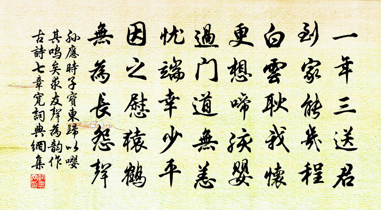 詩詞名句歷史字典書法欣賞書法字典國語詞典說文解字康熙字典古漢語字典標 題 作 者 詩 句 子寶東歸以嚶其鳴矣求友聲為韻作古詩七章寬作者:孫應時 朝代:宋代原文一年三送君,到家能幾程。白雲耿我懷,更想啼孩嬰。過門道無恙,憂端幸少平。因之慰猿鶴,無為長怨聲。詩詞問答問:《子寶東歸以嚶其鳴矣求友聲為韻作古詩七章寬》的作者是誰?答:孫應時問:該詩寫於哪個朝代?答:宋代書法欣賞子寶東歸以嚶其鳴矣求友聲為韻作古詩七章寬書法作品詩文賞析【原題】:子寶東歸以嚶其鳴矣求友聲為韻作古詩七章寬予旅懷次其韻詩詞推薦次韻參寥三首秦觀〔宋代〕且折花枝醉復醒,人間時節易崢嶸。屠龍肯自羞無用,畫虎從人笑不成。轆轤歌蘇軾〔宋代〕新系青絲百尺繩,心在君家轆轤上。我心皎潔君不知,轆轤一轉一惆悵。何處春風吹曉幕,江南綠水通珠閣。美人擬古六首曾協〔宋代〕迢迢千尺松,下有綠髮龜。流膏穿厚地,配此凌雲姿。隱見雖若殊,雪霜俱不移。置身苟身地,共保千歲期。壽安雜詩十首游神林谷寄邵堯夫司馬光〔宋代〕山人有山未嘗游,俗客遠來仍久留。白雲滿眼望不見,可惜宜陽一片秋。重修府西水亭院白居易〔唐代〕因下疏為沼,隨高築作台。龍門分水入,金谷取花栽。繞岸行初匝,憑軒立未回。園西有池位,留與後人開。睡起書事陸游〔宋代〕京華豪飲酹千鍾,濯錦江邊怯酒濃。烈士壯心雖未減,狂奴故態有誰容?折梅著句聊排悶,閉戶焚香剩放慵。午枕減字木蘭花姚述堯〔宋代〕琴堂無事。滿酌金罍承帝祉。樂奏簫韶。更與封人共祝堯。君王萬歲。歲歲今朝歌既醉。主聖臣賢。從此鴻圖萬萬贈許左丞從駕萬年宮盧照鄰〔唐代〕聞道上之徊,招躁下蓬菜。中樞移北斗,左轄去南台。黃山渾鳳笛,清曄侍龍媒。曳日朱旗卷,參雲金障開。朝參讀守道詩張耒〔宋代〕仁宗之初公有聲,一世懦者聞之驚。日行古義不顧俗,師事孫子傳其經。掃堂捧杖供賤役,侍師之坐隨師行。質疑江城子(再游武夷,至晞真館,與道士泛月而歸)李綱〔宋代〕武夷山里一溪橫。晚風清。斷霞明。行至晞真、館下月華生。仙跡靈蹤知幾許,雲縹緲,石崢嶸。羽人同載小舟輕經徐侍郎墓作顧況〔唐代〕不知山吏部,墓作石橋東。宅兆鄉關異,平生翰墨空。夜泉無曉日,枯樹足悲風。更想幽冥事,唯應有夢同。和慮可庵悲秋十首何夢桂〔宋代〕秋風來庭際,奄忽老蓐收。夜寒耿無寐,起坐焚膏油。孤燈照我影,對坐自倡酬。偈參意未竟,參橫轉西樓。寄友人山居黃滔〔唐代〕斷嶠滄江上,相思恨阻尋。高齋秋不掩,幾夜月當吟。落石有泉滴,盈庭無樹陰。茫茫名利內,何以拂塵襟。送艮侍者隨本師歸瀘南釋心月〔宋代〕依師參扣到無參,只麽呼三應亦三。話到不相辜負處,瀘南元是舊瀘南。題汝州從事廳鄭谷〔唐代〕詩人公署如山舍,只向階前便採薇。驚燕拂簾閒睡覺,落花沾硯會餐歸。壁看舊記官多達,榜掛明文吏莫違。自說闕下言懷上執政王禹偁〔宋代〕誥詞黜責子孫羞,欲雪前冤事已休。浴殿失恩成一夢,鼎湖攀駕即千秋。道邊任死心終直,澤畔長吟淚暗流。虞舜奉和文潛贈無咎篇末多見及以既見君子云胡不黃庭堅〔宋代〕張侯窘炊玉,僦屋得空壚。但見索酒郎,不見酒家胡。雖肥如瓠壺,胸中殊不麤。何用知如此,文彩似於菟。入峭峽安居溪伐木溪源幽邃林嶺相映有奇致焉陳子昂〔唐代〕肅徒歌伐木,騖楫漾輕舟。靡迤隨回水,潺湲溯淺流。煙沙分兩岸,露島夾雙洲。古樹連雲密,交峰入浪浮。岩潭減字木蘭花(臘望初晴,月佳甚,有上元花柳意,不能忘情)劉辰翁〔宋代〕臘銷三五。月向雪山雲外吐。煙水黃昏。梅柳依稀笛斷魂。今宵豫賞。便作香塵隨步想。莫待元宵。燈火零星雨寂清心鏡 本名紅窗迥馬鈺〔元代〕我當初,為庵主。勤勤接待,雲朋霞侶。時時地、疏遠塵緣,漸漸成覺悟。悟心開,便得遇。本師遣我,專來化度名句推薦不茶不飯,不言不語,一味供他憔悴。蜀妓《鵲橋仙·說盟說誓》 無情最是台城柳,依舊煙籠十里堤。韋莊《台城》 竭澤而漁,豈不獲得?而明年無魚;焚藪而田,豈不獲得?而明年無獸。呂不韋《呂氏春秋·覽·孝行覽》 松雪飄寒,嶺雲吹凍,紅破數椒春淺。周密《獻仙音·吊雪香亭梅》 遙想公瑾當年,小喬初嫁了,雄姿英發。蘇軾《念奴嬌·赤壁懷古》 未老莫還鄉,還鄉須斷腸。韋莊《菩薩蠻·人人盡說江南好》 弟子入則孝,出則弟,謹而信,泛愛眾,而親仁,行有餘力,則以學文。孔子弟子《論語·學而篇》 想得此時情切,淚沾紅袖黦。韋莊《應天長·別來半歲音書絕》 桑柘外鞦韆女兒,髻雙鴉斜插花枝。盧摯《蟾宮曲·寒食新野道中》 迴廊遠砌生秋草,夢魂千里青門道。馮延巳《菩薩蠻·迴廊遠砌生秋草》