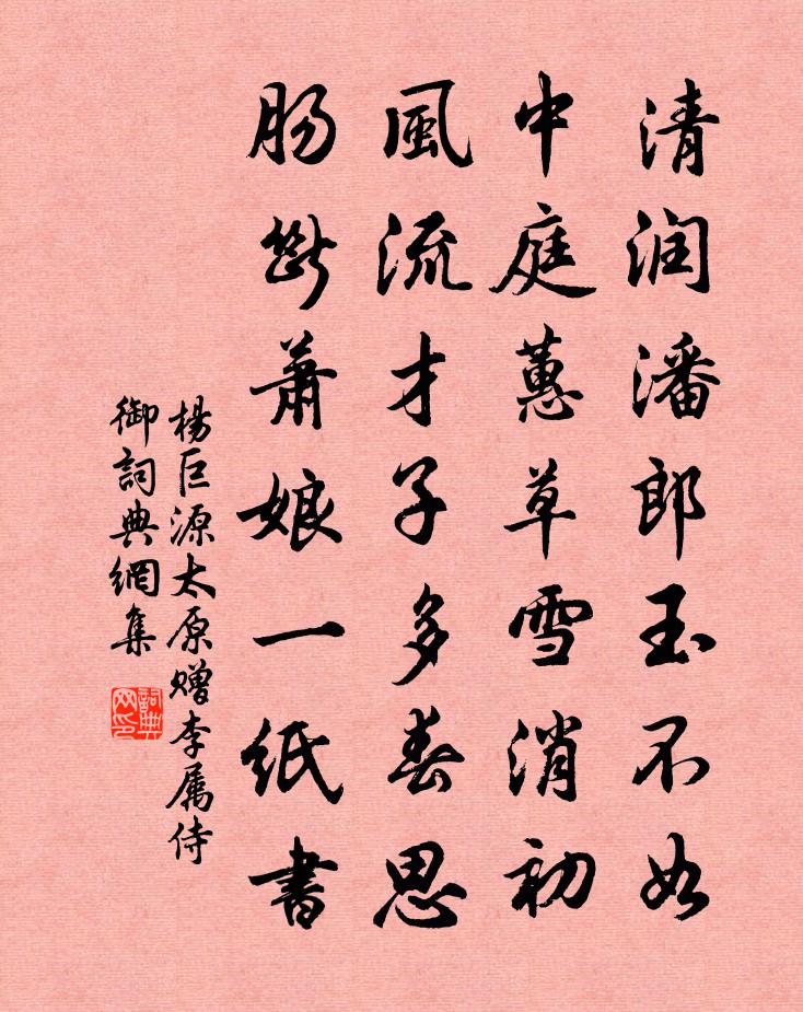 詩詞名句歷史字典書法欣賞書法字典國語詞典說文解字康熙字典古漢語字典標 題 作 者 詩 句 太原贈李屬侍御作者:楊巨源 朝代:唐代太原贈李屬侍御原文清潤潘郎玉不如,中庭蕙草雪消初。風流才子多春思,腸斷蕭娘一紙書。詩詞問答問:太原贈李屬侍御的作者是誰?答:楊巨源問:太原贈李屬侍御寫於哪個朝代?答:唐代問:太原贈李屬侍御是什麼體裁?答:七絕楊巨源太原贈李屬侍御書法欣賞太原贈李屬侍御書法作品注釋全唐詩:卷333-109詩詞推薦次韻朱通判嚴上舍陳造〔宋代〕蜀莊漂泊闔閭城,獨向陶朱意氣傾。詩寫閒情易為好,雨鏖炎暑欲爭清。居同蟻穴晴猶閉,歸笑鳩巢老未營。久擬對月贊釋子益〔宋代〕黑豆忙忙數,教休不肯休。幸然明似鏡,何用曲如鉤。卜運算元(督戰淝水,再用前韻第三首示青草堂)向子諲〔宋代〕膠膠擾擾中,本體元來靜。一段澄明絕點埃,世事如泡影。歇即是菩提,此語須三省。古道無人著腳行,禾黍秋風金蓮出玉花 案調名即減字木蘭花 得遇行化丘處機〔元代〕重陽師父。昔日甘河曾得遇。大道心開。設教東遊海上來。天涯回首。挈得吾鄉三四友。魏國升遐。驚動秦川百萬織女圖薩都剌〔元代〕蘭閨織錦秦川女,大姬啞啞弄機杼。小姬織倦何所思?簾幕無人燕雙語。成都花發江水春,門前馬嘶車轔轔。髻鬟昆明池(次韻尚書兄春晚)李彌遜〔宋代〕帳錦籠庭,囊香飄榭,過了芳時強半。覓殘紅、蜂須趁日,占新綠、鶯喉咤暖。數花期、望得春來,春去也、把酒苦熱二首蘇籀〔宋代〕越吟吳詠兩參商,我那皋原儂水鄉。赤地千倉待舂簸,炎飈九夏劇晴陽。雲霓不族訟風伯,雷電慚勞驅畢方。獨臥峽內三絕句項安世〔宋代〕千崖無樹作炊煙,峽內為生也可憐。探水得柴如寶藏,賣茆成俗滿村船。懷錢唐羅隱、章魯封貫休〔唐代〕二子依公子,雞鳴狗盜徒。青雲十上苦,白髮一莖無。風澀潮聲惡,天寒角韻孤。別離千萬里,何以慰榮枯。句鄒惇禮〔宋代〕疏直拙依附,清高無匹儔。劉員外寄移菊李山甫〔唐代〕秋來緣樹復緣牆,怕共平蕪一例荒。顏色不能隨地變,風流唯解逐人香。煙含細葉交加碧,露拆寒英次第黃。深謝梅雨潭李介山〔宋代〕靈源分左界,千仞落飛泉。散作一空雨,長如四月天。掛崖寒練直,濺席水珠圓。湫石龍應在,岩扉浮翠煙。送汪莊仲赴江東倉幕強仲荊門簽判樓鑰〔宋代〕之子游何許,平州更玉州。山川稱勝絕,幕府信風流。翠巘寒逾秀,金蓮夜不收。天涯念鄉國,少上仲宣樓。河傳(二之一)賀鑄〔宋代〕華堂張燕。向尊前妙選,舞裙歌扇。彼美個人,的的風流心眼。恨尋芳來晚。曲街燈火香塵散。猶約晨妝,一覘春梁潔夫幽居林宇靚深畫幽邃不類貴第宛然山林曹勛〔宋代〕平生端亮履清修,公退蘧然得少休。栩栩尚忘飛蝶想,黑甜一枕更優遊。秋蘭香陳亮〔宋代〕未老金莖,些子正氣,東籬淡佇齊芳。分頭添樣白,同菊幾般黃。向閒處、須一一排行。淺深饒間新妝。那陶令,鷓鴣天鄒應博〔宋代〕天遣豐年祝母齡。人人安業即安親。探支十日新陽福,來獻千秋古佛身。兒捧盞,婦傾瓶。更欣筵上有嘉賓。紫駝從駕東幸呈諸公徐鉉〔唐代〕吳公台下舊京城,曾掩衡門過十春。別後不知新景象,信來空問故交親。宦遊京口無高興,習隱鐘山限俗塵。今日和寄趙及父趙希逢〔宋代〕德裕南征基奉冊,淮陰晚節北登壇。何如流落長沙後,猶自拳拳策治安。送閏師之長安謝紫衣魏野〔宋代〕送閏師之長安謝紫衣。名句推薦樓前綠暗分攜路,一絲柳、一寸柔情。吳文英《風入松·聽風聽雨過清明》 霜威出塞早,雲色渡河秋。李白《太原早秋》 佇立傷神。無奈輕寒著摸人。朱淑真《減字木蘭花·春怨》 日暖泥融雪半消,行人芳草馬聲驕。杜牧《宣州送裴坦判官往舒州時牧欲赴官歸京》 十二樓中盡曉妝,望仙樓上望君王。薛逢《宮詞》 如來所得法此法無實無虛。鳩摩羅什譯《金剛經·離相寂滅》 壚邊人似月,皓腕凝霜雪。韋莊《菩薩蠻·人人盡說江南好》 社下燒錢鼓似雷,日斜扶得醉翁回。范成大《春日田園雜興》 煙塵犯雪嶺,鼓角動江城。杜甫《歲暮》 握手一長嘆,淚為生別滋蘇武《留別妻》