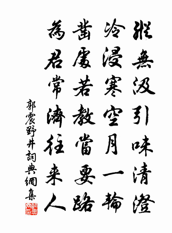 詩詞名句歷史字典書法欣賞書法字典國語詞典說文解字康熙字典古漢語字典標 題 作 者 詩 句 野井作者:郭震 朝代:唐代野井原文縱無汲引味清澄,冷浸寒空月一輪。鑿處若教當要路,為君常濟往來人。詩詞問答問:野井的作者是誰?答:郭震問:野井寫於哪個朝代?答:唐代問:野井是什麼體裁?答:七絕郭震野井書法欣賞野井書法作品注釋全唐詩:卷66_15詩詞推薦徐秀才園亭王安石〔宋代〕茂松修竹翠紛紛,正得山阿與水濆。笑傲一生雖自樂,有司還欲選方聞。臨江仙張掄〔宋代〕玉宇涼生清禁曉,丹葩色照晴空。珊瑚敲碎小玲瓏。人間無此種,來自廣寒宮。雕玉闌乾深院靜,嫣然凝笑西風。送人西上劉克莊〔宋代〕華胄惟莆冠七閩,陳岩所產必聞人。穆陵鳳閣曾分席,朝道麟台有後身。上覽四書方唱嘆,子行三策好條陳。明時客中作牟融〔唐代〕異鄉歲晚悵離懷,遊子驅馳愧不才。夜夜砧聲催客去,年年雁影帶寒來。半林殘葉迎霜落,三徑黃花近節開。幾度和康伯可重陽吳芾〔宋代〕過了重陽又一陽,梅開亦擬共壺觴。病中無復成狂飲,且作前賢醒里狂。醉臥道傍陸游〔宋代〕爛醉今朝臥道傍,鄉閭共為護牛羊。高懷那遣群兒覺,至理真能萬事忘。喚起瘦軀猶嵬峨,扶歸困睫更芒洋。凍齏將過單于許棠〔唐代〕荒磧連天堡戍稀,日憂蕃寇卻忘機。江山不到處皆到,隴雁已歸時未歸。行李亦須攜戰器,趨迎當便著戎衣。并州送李深卿赴省試喻良能〔宋代〕曲江深院題名處,應有春風得意詩。為想杏花三十里,卻思三五少年時。次韻胡邦衡二首周必大〔宋代〕馮翊當年助匪頒,殊方此日奉賓歡。淺基想對銷金帳,生意重尋白玉槃。蟻泛似緣膻足慕,海凝如得毳逃寒。十羊樂通神明范祖禹〔宋代〕世治興和樂,陽來符正聲。純能格天地,幽可逮神明。協氣流無外,靈心識太平。九歌人鬼享,八變地祗迎。翕縱謁蔣帝祠過鐘山下二首張耒〔宋代〕野塘春水綠迢迢,上有東風弄柳條。曉日已穿東嶺出,輕寒猶欲戰駝毛。祝英台(席間詠繩球)劉辰翁〔宋代〕看師師、成蝶蝶。蹙盡不成疊。欲試搔頭,花重怎堪捻。是誰拋過東牆,今無赤鳳,夢得似、那人身捷。年時臘。紫極觀二首韓元吉〔宋代〕楊柳花飛杏子新,園林無地可留春。卻尋風雨江邊路,慚愧煙霞物外人。織婦曲楊維楨〔元代〕盈盈白面娥,新絲織扇羅。當機不應客,擲地碎金梭。訪蒼山曾子實戴復古〔宋代〕故人子曾子,居處近金精。福地佳山水,詩家老弟兄。十年重會面,一笑最關情。萬象亭前月,今宵為我明。以羔裘如濡洵美且侯韻為八詩送夾穀子括赴明戴表元〔宋代〕水耕當用牛,陸行當用馬。詩書無近功。平世安可舍。吾州兵荒來,冠蓋多苟且。雨後寄侃直翁新行古釋文珦〔宋代〕相去亦不遠,相尋殊覺難。一旬長苦雨,五月尚清寒。石屋深浮靄,山溪易作瀾。今朝喜新霽,始得問平安。送張知錄葉適〔宋代〕門閥飛龍後,家聲入館前。身饒太常長,客欠廣文氈。流落無先譽,遭逢有宿緣。炎洲路多少,謾數去鴻邊。古風次韻答初和甫二首黃庭堅〔宋代〕飢思河鯉與河魴,喝思蔗漿玉碗涼。冬願純綿對陰雪,夏願縐絺度盛陽。萬端作計身愁苦,一事不諧鬢蒼浪。調笑黃匯征惠石菖蒲既賦古風復成四韻鄭剛中〔宋代〕附石菖蒲誰手種,形模姿色妙難如。黃蜂變去惟窠在,綠玉抽來祗寸餘。夜為露華離几案,曉添灶井向階除。如何名句推薦親戚不附,無務外交。墨子《墨子·02章 修身》 又與為人君者之不惠也,臣者之不忠也,父者之不慈也,子者之不孝也,此又天下之害也。墨子《墨子·16章 兼愛(下)》 一曲陽關,斷腸聲盡,獨自憑蘭橈柳永《少年游·參差煙樹灞陵橋》 憶昔霍將軍,連年此征討。高適《登百丈峰二首》 思歸若汾水,無日不悠悠。李白《太原早秋》 傷心故人去後,冷落新詩。晁沖之《漢宮春·梅》 玉樓深鎖薄情種。清夜悠悠誰共。秦觀《桃源憶故人·玉樓深鎖薄情種》 遠夢歸侵曉,家書到隔年。杜牧《旅宿》 坐上別愁君未見,歸來欲斷無腸。蘇軾《臨江仙·送王緘》 帝王之道,以寬仁為大。令狐德棻《周書·本紀·卷四》