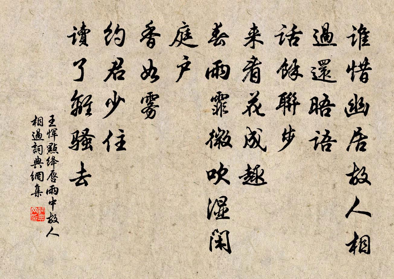詩詞名句歷史字典書法欣賞書法字典國語詞典說文解字康熙字典古漢語字典標 題 作 者 詩 句 點絳唇 雨中故人相過作者:王惲 朝代:元代點絳唇 雨中故人相過原文誰惜幽居,故人相過還晤語。話余聯步。來看花成趣。春雨霏微,吹濕閒庭戶。香如霧。約君少住。讀了離騷去。詩詞問答問:點絳唇 雨中故人相過的作者是誰?答:王惲問:點絳唇 雨中故人相過寫於哪個朝代?答:元代問:點絳唇 雨中故人相過是什麼體裁?答:詞王惲點絳唇 雨中故人相過書法欣賞點絳唇 雨中故人相過書法作品詩詞推薦湖上雨中晚歸釋文珦〔宋代〕冷澹一堤枯柳,孤高九里寒松。行盡北山煙雨,白雲深處聞鍾。摸魚兒 次韻謝張古愚程文海〔元代〕又山亭、一番春老,歸遲黃鶴何許。殷勤天上乘槎客,還記渚鷗沙鷺。憔悴處。奈青鏡難藏,一一都呈露。空庭細清遠店范成大〔宋代〕女僮流汗逐氈軿,雲在淮鄉有父兄。屠婢殺奴官不問,大書黥面罰猶輕。贈琴客陸元章白玉蟾〔宋代〕手持一枚寒水晶,十指擊戛如玉鳴。曲彈白雪陽春調,調有高山流水聲。松梢鶴唳恰夜半,寒煙寂寂風泠泠。紙衾驟雨華岳〔宋代〕牛尾烏雲潑濃墨,牛頭風雨翩車軸。怒濤頃刻卷沙灘,十萬軍聲吼鳴瀑。牧童家住溪西曲,侵早騎牛牧溪北。慌忙秋登巴陵望洞庭李白〔唐代〕清晨登巴陵,周覽無不極。明湖映天光,徹底見秋色。秋色何蒼然,際海俱澄鮮。山青滅遠樹,水綠無寒煙。來帆愷藏主號庾嶺釋智愚〔宋代〕財宗北祖爭衣處,雨洗風磨石尚新。靈跡豈知千載後,叢林猶有昔時人。漁父釋文珦〔宋代〕在處變名姓,往來長嘯歌。一身無賦役,幾口共煙波。江月垂綸下,江雲宿棹和。卻應嫌渭叟,老去脫寒蓑。謁金門·春漏促韋莊〔唐代〕春漏促,金燼暗挑殘燭。一夜簾前風撼竹,夢魂相斷續。有個嬌嬈如玉,夜夜繡屏孤宿。閒抱琵琶尋舊曲,遠山眉行路難五首楊萬里〔宋代〕黃金築台賜白璧,車前八騶門列戟。徹侯萬戶秩萬石,珠戶玉房貯傾國。傅呼一聲萬人開,將軍相國天上來。不知小重山(席上和人韻送李子永提乾)辛棄疾〔宋代〕旋制離歌唱未成。陽關先畫出,柳邊亭。中年懷抱管弦聲。難忘處,風月此時情。夜雨共誰聽。盡教清夢去,兩三玩丹砂 贈趙公馬鈺〔元代〕萬種全般教得人。怎生教你絕心塵。悟來方可得良因。怕死自然恩愛斷,忘機決定氣神淳。無為清淨合天真。滿庭芳(又上前人)張繼先〔宋代〕調理三關,安和四體,靜無憂撓相煎。太微冥契,元始語諸仙。玉宇重修妙典,西台□、南嶽題篇。崇□好,身田和元居中風水洞上祖龍圖韻張先〔宋代〕水色風光近使君,浥塵輕雨逐車輪。暫來不宿宜無恨,多少行春不到人。贈張軒民贊善王安石〔宋代〕潮打空城寂寞回,百年多病獨登台。誰人得似張公子,有底忙時不肯來。頌證道歌證道歌釋印肅〔宋代〕喚取機關木人問,觸目菩提誰辨論。亡僧可喻木人機,玄沙直指何勞頓。丁端叔送牡丹以詩來用韻酬之陳傅良〔宋代〕覺省他年見一班,老從湖海看春頒。瞻言百里幾相及,仰止高山竟莫攀。每事乞公留上策,不才容我著中間。一時夢玉人引范成大〔宋代〕送行人去,猶追路、再相覓。天末交情,長是合堂同席。從此尊前,便頓然少個,江南羈客。不忍匆匆,少駐船梅論俗詩四首何耕〔宋代〕傷人利己事多端,唆訟尤為第一般。二競力疲俱願息,中人未了又經官。輓趙秋曉陳庚〔宋代〕客至支筇出,俱雲步履強。禮猶尚筋力,病忍謂膏肓。此別終千古,相陪苦一霜。蕭蕭亭畔柳,回首重淒涼。名句推薦最愛蘆花經雨後,一蓬煙火飯魚船。林逋《詠秋江》 非君子不可與語變。王通《中說·卷七·述史篇》 獨有宦遊人,偏驚物候新。杜審言《和晉陵陸丞早春遊望》 貧賤非辱,貧賤而諂求於人者為辱;富貴非榮,富貴而利濟於世者為榮。王永彬《圍爐夜話·第三一則》 折花逢驛使,寄與隴頭人。陸凱《贈范曄詩》 幾硯昔年游,於今成十秋。司馬光《送龔章判官之衛州·新及第》 庭花蒙蒙水泠泠,小兒啼索樹上鶯。貫休《春晚書山家屋壁二首》 誰向若耶溪上,倩美人西去,麋鹿姑蘇。辛棄疾《漢宮春·會稽蓬萊閣懷古》 驕奢淫逸,所自邪也。左丘明《左傳·隱公·隱公三年》 秋到長門秋草黃。畫梁雙燕去,出宮牆。薛昭蘊《小重山·秋到長門秋草黃》