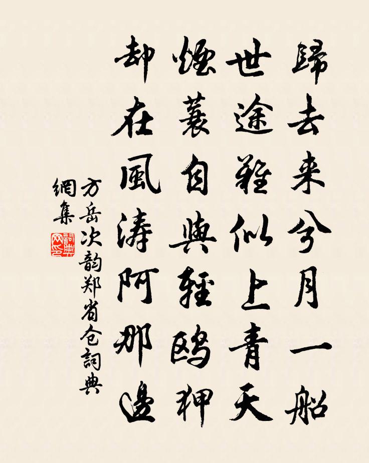 詩詞名句歷史字典書法欣賞書法字典國語詞典說文解字康熙字典古漢語字典標 題 作 者 詩 句 次韻鄭省倉作者:方岳 朝代:宋代次韻鄭省倉原文歸去來兮月一船,世途難似上青天。煙蓑自與輕鷗狎,卻在風濤阿那邊。詩詞問答問:次韻鄭省倉的作者是誰?答:方岳問:次韻鄭省倉寫於哪個朝代?答:宋代方岳次韻鄭省倉書法欣賞次韻鄭省倉書法作品詩詞推薦夜雪韓元吉〔宋代〕爐火深紅臘炬明,打窗風雪正縱橫。瓦瓶旋注山泉滿,卻作瀟瀟細雨聲。睡覺楊萬里〔宋代〕小醉如無酒,寒宵似度年。覺來因記夢,醒去不成眠。萬事從心下,三更到眼前。清愁政無那,一鴈叫霜天。秋郊有懷陸游〔宋代〕檐頭買雙兔,市店取斗酒;還家掃北窗,歡言酌親友。家貧氣未餒,禮薄情更厚。高吟金石裂,健筆龍蛇走。酒闌書山壁劉克莊〔宋代〕斸地栽林自起墳,一燈精舍疏玄文。詩成莫灑酒家壁,題遍青山題白雲。頌古二十四首釋勝〔宋代〕開口便見膽,工夫傲東魯。昔於豆子山,也解打瓦鼓。德壽宮慶壽口號十篇楊萬里〔宋代〕花外班行霧外天,何緣子細望龍顏。小窺玉色真難老,底用曜仙九轉丹。風雨歸舟圖家鉉翁〔宋代〕前津風色惡,斷岸寄孤艇。輸他田舍翁,午酲猶未醒。憶桃源張繼先〔宋代〕詞以答之長生之話口相傳。求丹金液全。混成一物作神仙。丁寧說與賢。休咽氣,莫胡言。豈知造化玄。用鉛投汞【商調】梧葉兒 廬山寺佚名〔元代〕瀑布倒銀漢,諸山捧墨池,九江郡一盤棋。金額元章字,白蓮陶令囗,珠玉謫仙題,信天下廬山第一。 蔣山寺 王通判輓詞樓鑰〔宋代〕才具盍時用,拂衣俄去之。善藏經世手,回施稱家兒。嬴博延陵恨,人琴子敬悲。連年事如許,天道杳難知。送羅季能赴江陵幕李曾伯〔宋代〕幕底從游數月間,孤燈凍飽相嘆。平生得此於人寡,舉世如斯知己難。舍我遽輕千里別,祝君惟有一分寬。楊花正後後閣端午貼子詞五首真德秀〔宋代〕永坤宮寧殿,時將萬卷看。從容聊灑翰,寶扇舞龍鸞。句晃逈〔宋代〕可能宴坐即宴坐,待全靜無全靜時。夏日湖上寄太白長老釋智圓〔宋代〕風撼芙蕖入座香,水軒閒坐趣何長。相懷不是人間景,隔岸歸禽噪晚涼。禱雨報恩到翟園四首楊萬里〔宋代〕草路無泥未有塵,城南城北總遊人。不緣香火來山墅,孤員今年半斷春。四景釋慧空〔宋代〕急雨近欲黑,斜暉遠更明。倚樓誰氏子,興與大江橫。哨遍劉克莊〔宋代〕勝處可宮,平處可田,泉土尤甘美。深復深,路絕住人稀。有人兮、盤旋於此。送子歸。是他隱居求志。是要明主留別吳七正字白居易〔唐代〕成名共記甲科上,署吏同登芸閣間。唯是塵心殊道性,秋蓬常轉水長閒。聞鶯姚勉〔宋代〕風吹微湍入松篁,雲幢葉蓋相低昂。山禽此時似得意,雜奏一曲娛新涼。流鶯頗嫌無宮商,飛來中間作笙簧。廣寒錢氏東皋張蘊〔宋代〕百年鐘鼓園林在,人物蕭疏更海鄉。藤絡湖嵌山解長,花移鄴本土猶香。棋聲靚晝松陰淡,扇影閒秋水氣長。莫道名句推薦稱尊長,勿呼名。對尊長,勿見能。李毓秀《弟子規·出則弟》 風遞幽香出,禽窺素艷來。齊己《早梅》 我有所念人,隔在遠遠鄉。白居易《夜雨》 碧野朱橋當日事,人不見,水空流。秦觀《江城子·西城楊柳弄春柔》 心不可太大,心太大,則舍近圖遠,難期有成矣。王永彬《圍爐夜話·第三十則》 樓角初銷一縷霞,淡黃楊柳暗棲鴉賀鑄《減字浣溪沙·樓角初銷一縷霞》 秋陰不散霜飛晚,留得枯荷聽雨聲。李商隱《宿駱氏亭寄懷崔雍崔袞》 遠牧牛,繞村四面禾黍稠。李涉《牧童詞》 在善用,不在眾。宋祁、歐陽修、范鎮、呂夏卿等《新唐書·列傳·卷三十六》 掩妾淚,聽君歌。李白《夜坐吟》