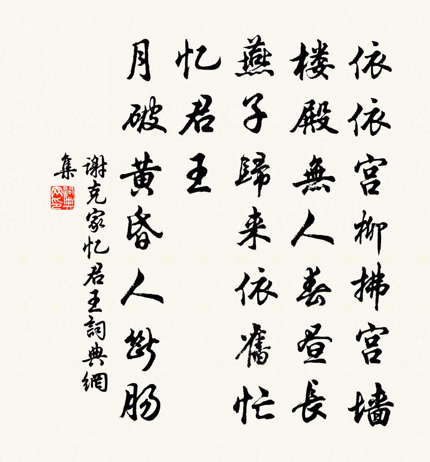 秦宮殿,翩翩只見雙飛燕”(唐昭宗李曄《菩薩蠻》)的感嘆:“燕子歸來依舊忙”。燕子是無情之物,它哪裡知道樓殿依舊,而主人已換,仍然忙著銜泥,在舊樑上築起新巢,正是“這雙燕何曾,念人言語”(《燕山亭》),儼然有“舊時王謝堂前燕,飛入尋常百姓家”的滄桑之感。然後點明題旨,懷念故君。這首小令,從頭到尾都是寫對君主的懷念,由柳拂宮牆,而想到宮殿的主人;由宮殿無人,而想到燕歸何處;由燕語呢喃,而想到“燕子不知何世”(周邦彥《西河》)。蓄意到此,便有精神百倍之勢,集中全力於這“月破黃昏人斷腸”的結句,自然真味無窮,辭意高絕,一個芳馨悱惻的藝術形象,生動地呈現在讀者的面前。因為它是從題前著筆,題外攝神,只用了一個“破”字,便把從清晨憶到黃昏,又從黃昏憶到月上柳梢,都沉浸在如痴如呆的回憶中。昔日的宮柳凝綠,今朝的淡月黃昏;昔日的笙歌徹旦,今朝的樓殿無人,在在是強烈的對比,在在是傷心的回憶,不言相憶之久,而時間之長自見;不言相憶之深,而惓顧之意甚明。“月破黃昏”是寫景;“人斷腸”是抒情,把寫景和抒情統一在一個完整的句子裡,而景物在感情的絲縷中織得更加光彩奪目,感情在景物的烘托中更加表現得淋漓盡致。不著一實語,而能以動盪見奇,迷離稱雋,辭有盡而意無窮,這正是許多詞人所努力追求的藝術境界。