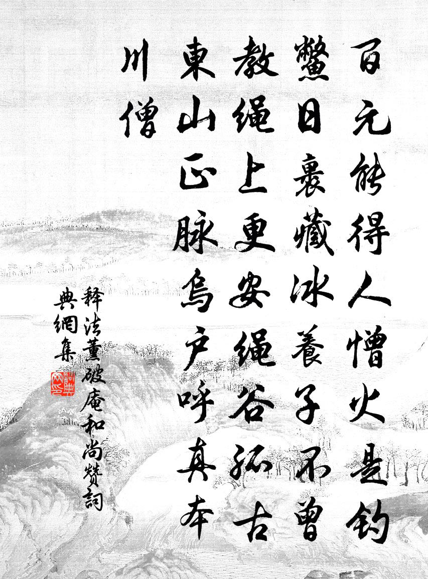 詩詞名句歷史字典書法欣賞書法字典國語詞典說文解字康熙字典古漢語字典標 題 作 者 詩 句 破庵和尚贊作者:釋法薰 朝代:宋代破庵和尚贊原文百元能,得人憎。火是釣鱉,日裹藏冰。養子不曾教,繩上更安繩。谷孤古東山正脈,烏戶呼真本川僧。詩詞問答問:破庵和尚贊的作者是誰?答:釋法薰問:破庵和尚贊寫於哪個朝代?答:宋代釋法薰破庵和尚贊書法欣賞破庵和尚贊書法作品詩詞推薦大林寺 上人茅齋查慎行〔清代〕盤煙下層霄,山骨微負士。陰陰日光淡。漠漠風氣古。寶樹壓橋低,一溪環菜圃。香山舊吟地,花徑兼宿莽。廢寺十月見菊趙葵〔宋代〕落拓山園載酒來,江梅含雪倚春台。花花無藉秋光老,猶自離披帶雨開。和喜雨詩廖行之〔宋代〕夏畦雲稼憂芳蕤,炎官火傘烘晴曦。何人半夜起龍蟄,慰我卒歲豐年期。吾生正作一飽計,天意似憫三農時。椎牛龍丘途中二首(一作李商隱詩)杜牧〔唐代〕漢苑殘花別,吳江盛夏來。唯看萬樹合,不見一枝開。水色繞湘浦,灘聲怯建溪。淚流回月上,可得更猿啼?祝英台近(悼得趣,贈宏庵)吳文英〔宋代〕黯春陰,收燈後,寂寞幾簾戶。一片段預告飛,人駕彩雲去。應是蛛網金徽,拍天寒水,恨聲斷、孤鴻洛浦。對君訴。古松劉子翬〔宋代〕手植知何代,樅樅萬蓋齊。韻清琴易寫,乾直鳥難棲。慘澹連雲塢,鬅鬙蔭石溪。刳明雖小用,曾照路人迷。壁老求笑庵詩陸游〔宋代〕台省諸公六出奇,江湖狂客一生痴。無人為問淨光老,撫掌掀髯端為誰?石井泉徐誼〔宋代〕川原膴膴小曾巒,千古英雄劍氣寒。滲漉仁風並義澤,只今光焰在毫端。霜梅李龍高〔宋代〕青女欺花戰未分,花神直訴與東君。冰山回首知何許,依舊山人住白雲。孫季蕃故居周弼〔宋代〕笑語失詼諧,人誰不愴懷。夢殘秋雨寺,魂散夕陽街。缺灶粘煎藥,乾爐積燎柴。風流何必葬,便擁菊花埋。壕上趙師秀〔宋代〕遠近人家住,過橋路盡通。野田行瘦馬,淺渚聚群鴻。地靜微泉響,天寒落日紅。若非身作吏,不道是城中。寧夏糜公范王洋〔宋代〕塵滿簪纓緇滿衣,幾人真解棄如泥。水方流急收驚楫,藩自無心看觸羝。陶令縱教貪漉酒,謝公寧不念丞黎。也知吳仲庶殿院寄示與呂沖之馬仲塗唱和詩六篇邀梅堯臣〔宋代〕出舟湖渺渺,月白絕纖氛。已見水如監,莫生波上雲。獨征何慕侶,冷酌不知醺。露下清吟久,同心本愛君。送裴如晦即席分題三首王安石〔宋代〕十月潁水冰,問君行何為。行不顧斗米,自與五湖期。平生湖上游,幽事略能知。此後君最樂,窮年得游嬉。彩鯨飲天慶觀即席賦吳體方回〔宋代〕寂靜日月白雲鄉,漂搖湖海厖眉郎。壁間猶見畫龍在,柱表不聞歸鶴翔。杯酒新竹與風色,爐熏異花無此香。索茗落第西還別魏四懍陳子昂〔唐代〕轉蓬方不定。落羽自驚弦。山水一為別。歡娛復幾年。離亭暗風雨。征路入雲煙。還因北山逕。歸守東陂田。復堂獨坐陳宓〔宋代〕漫道清明僎,真成首夏天。南風回礎汗,小雨駐爐煙。花柳無心對,詩書隱几眠。杯茶時猛省,事業愧先賢。僑寄山居霍然幾月凡見之於目聞之於耳者輒綴王志道〔宋代〕羃羃黃雲麥壠秋,牧童橫笛倒騎牛。百爹飼養痢葫蘆扇,持向田頭蔽日頭。水竹野十詠盟鷗葉茵〔宋代〕同此江湖心,有盟非知已。我亦畏機人,莫入驚波裹。浣溪沙 洞庭張孝祥〔宋代〕行盡瀟湘到洞庭。楚天闊處數峰青。旗梢不動晚波平。紅蓼一灣紋纈亂,白魚雙尾玉刀明。夜涼船影浸疏星。名句推薦早知潮有信,嫁與弄潮兒。李益《江南曲》 宜有詞仙,擁素雲黃鶴,與君遊戲。姜夔《翠樓吟·淳熙丙午冬》 落日無人松徑里,鬼火高低明滅。薩都剌《念奴嬌·登石頭城次東坡韻》 青天有月來幾時?我今停杯一問之。李白《把酒問月·故人賈淳令予問之》 卻嫌脂粉污顏色,淡掃蛾眉朝至尊。張祜《集靈台·其二》 笑拈芳草不知名,乍凌波、斷橋西堍。吳文英《西子妝慢·湖上清明薄游》 家貧思良妻,國亂思良相。司馬光《資治通鑑·周紀·周紀一》 世間無限丹青手,一片傷心畫不成。高蟾《金陵晚望》 言無二貴,法不兩適。韓非及後人《韓非子·問辯》 今朝有酒今朝醉,明日愁來明日憂。佚名《增廣賢文·上集》