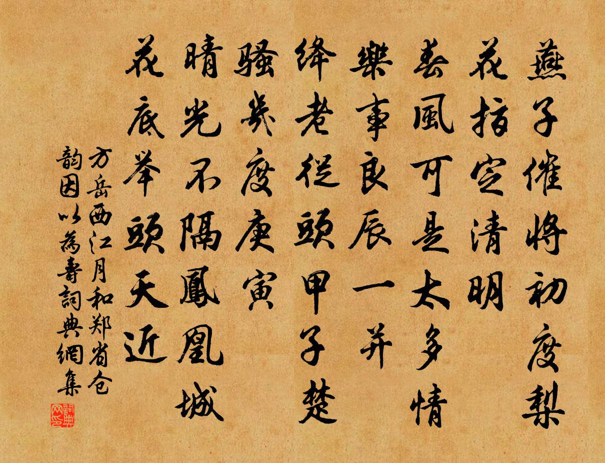 詩詞名句歷史字典書法欣賞書法字典國語詞典說文解字康熙字典古漢語字典標 題 作 者 詩 句 西江月(和鄭省倉韻,因以為壽)作者:方岳 朝代:宋代原文燕子催將初度,梨花指定清明。春風可是太多情。樂事良辰一併。絳老從頭甲子,楚騷幾度庚寅。晴光不隔鳳凰城。花底舉頭天近。詩詞問答問:《西江月(和鄭省倉韻,因以為壽)》的作者是誰?答:方岳問:該詩寫於哪個朝代?答:宋代問:該詩是什麼體裁?答:詞書法欣賞西江月(和鄭省倉韻,因以為壽)書法作品詩詞推薦登湘南樓和方孚若韻李曾伯〔宋代〕天教管鄰眾山來,筍立平章翠作堆。上馬休憐翁矍鑠,酌罍聊賦彼崔嵬。樓高蒼桂奇觀列,人對黃花逸興催。公退賀新郎佚名〔宋代〕風雨連朝夕。最驚心、春光蜿晚,又過寒食。落盡一番新桃李,芳草南園似積。但燕子、歸來幽寂。況是單棲饒惆題老融群牛圖釋紹曇〔宋代〕三三五五戲平蕪,踏裂春風百草枯。莫寫溈山僧某甲,恐人悟作祖師圖。【正宮】脫布衫盍西村〔元代〕春宴柳花風微盪香埃,梨花雪亂點蒼苔。錦繡雲紅窗縹緲,麝蘭煙翠簾靉靆。【小梁州】珠箔銀屏次第開,十二瑤簡傅十八官陸游〔宋代〕朋舊凋零盡,新交得雋人。文章諧律呂,議論足精神。甚欲邀聯騎,無如困負薪。蘭亭修禊近,為記永和春。長相思呂本中〔宋代〕要相忘。不相忘。玉樹郎君月艷娘。幾回曾斷腸。欲下床。卻 * 。上得床來思舊鄉。北風吹夢長。沁園春劉子寰〔宋代〕長壽真人,玉佩瓊裾,霞衣月裳。趁桃迎初度,千年方熟,蒲經端午,三日留春。蘭杜綏旌,芙蓉搴蓋,飛下清源鷓鴣天(許總管席上)朱敦儒〔宋代〕至節先庚欲雪天。玳筵圍錦帳青氈。嫖姚副帥招佳客,太守高明別乘賢。歌宛轉,舞蹁躚。金釵十二擁嬋娟。老人小說開闢羅燁〔宋代〕小說紛紛皆有之,須憑實學是根基。開天闢地通經史,博古明今歷傳奇。藏蘊滿懷風與月,吐談萬捲曲和詩。辨論次韻仇仁近晴窗二首方回〔宋代〕往時淟涊玷蕃宣,處士名聞積有年。甚欲同傾彭澤酒,未能略送始興錢。細看好句無疵處,時出名言亦自然。苦海送友人使河源賈至〔唐代〕送君魯郊外,下車上高丘。蕭條千里暮,日落黃雲秋。舉酒有餘恨,論邊無遠謀。河源望不見,旌旆去悠悠。題宣州推官廳覽翠堂文天祥〔宋代〕都官自楚產,文採光陸離。當年從事君,如與山川期。歲月忽已遒,天球落塵土。豈曰無嘉賓,過者不我顧。誰令象李嶠〔唐代〕鬱林開郡畢,維揚作貢初。萬推方演夢,惠子正焚書。執燧奔吳戰,量舟入魏墟。六牙行致遠,千葉奉高居。夜意陸游〔宋代〕火雲夕方收,草露秋已白。堂空燈欲翳,壁壞蟲自嘖。四顧寂無人,獨立岸吾幘。窮通何足論,等是百年客。何能贈竇十馮道〔唐代〕燕山竇十郎,教子有義方。靈椿一株老,丹桂五枝芳。柴秋堂越上寄詩就韶柬奚秋崖汪元量〔宋代〕越王台上我同游,越女樓中君獨留。燕子日長宜把酒,鯉魚風起莫行舟。江山有待偉人出,天地不仁前輩休。何處秋日洛陽官舍寄上水部家兄竇牟〔唐代〕洛陽歸老日,此縣忽為君。白髮兄仍見,丹誠帝豈聞。九衢橫逝水,二室散浮雲。屈指豪家盡,傷心要地分。禁中和張舍人吳融〔唐代〕玉女盆邊雪未銷,正多春事莫無憀。杏花向日紅勻臉,雲帶環山白系腰。鶯轉樹頭欹枕聽,凍開泉眼杖藜挑。陵遷壽許侯楊公遠〔宋代〕冬孟猶餘一葉蓂,中原賢哲此時生。星輝南極躔吳分,月出東山照歙城。耐與寒花香晚節,清如冷蕊味和羹。童顏偈頌五十一首釋道沖〔宋代〕群陰剝盡,一陽來復。萬匯鹹亨承化育,拄杖機輪轉轆轆。轉天關,回地軸。百億分身遍剎塵,應時納佑從人慾。名句推薦牆角數枝梅,凌寒獨自開。王安石《梅花 / 梅》 一物失稱,亂之端也。夫德不稱位,能不稱官,賞不當功,罰不當罪,不祥莫大焉。荀子《荀子·正論》 夫死戰場子在腹,妾身雖存如晝燭。張籍《征婦怨》 曉月過殘壘,繁星宿故關。司空曙《賊平後送人北歸》 君看六幅南朝事,老木寒雲滿故城。韋莊《金陵圖》 春思亂,芳心碎。惠洪《千秋歲·半身屏外》 信命者,亡壽夭;信理者,亡是非;信心者,亡逆順;信性者,亡安危。列子及其弟子《列子·力命》 豹死留皮,人死留名。歐陽修《新五代史·列傳·死節傳第二十》 明歲秋風知再會,暫時分手莫相思。曹雪芹《殘菊》 君家玉女從小見,聞道如今畫不成。黃庭堅《謝張仲謀端午送巧作》