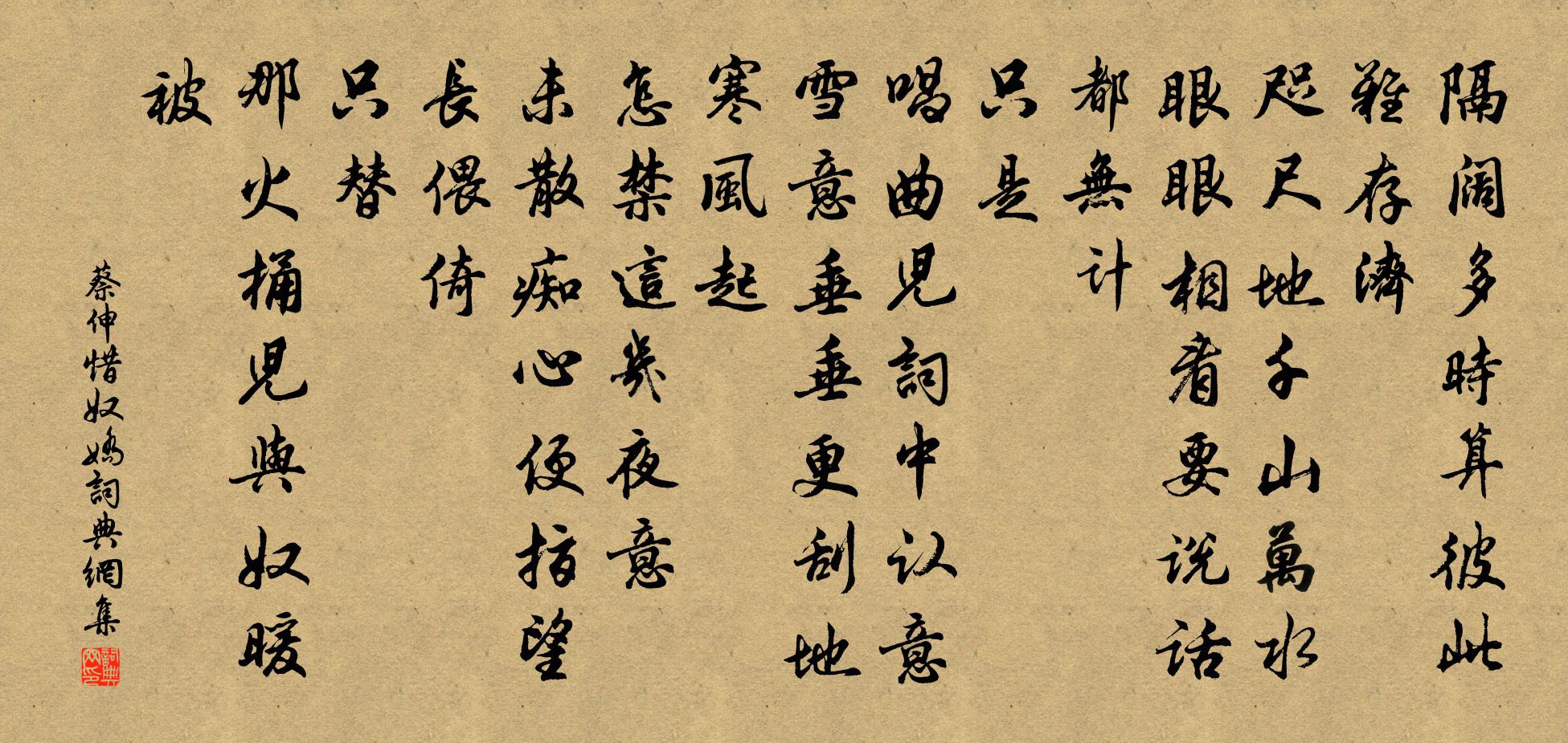 詩詞名句歷史字典書法欣賞書法字典國語詞典說文解字康熙字典古漢語字典標 題 作 者 詩 句 惜奴嬌作者:蔡伸 朝代:宋代惜奴嬌原文隔闊多時,算彼此、難存濟。咫尺地、千山萬水。眼眼相看,要說話、都無計。只是。唱曲兒、詞中認意。雪意垂垂,更刮地、寒風起。怎禁這幾夜意。未散痴心,便指望、長偎倚。只替。那火桶兒、與奴暖被。詩詞問答問:惜奴嬌的作者是誰?答:蔡伸問:惜奴嬌寫於哪個朝代?答:宋代問:惜奴嬌是什麼體裁?答:詞蔡伸惜奴嬌書法欣賞惜奴嬌書法作品詩詞推薦許遠文天祥〔宋代〕起師哭玄元,義氣震天地。百戰奮雄姿,臠妾士揮淚。睢陽水東流,雙廟垂百世。當時令狐潮,乃是賊遊說。事爭吟邵雍〔宋代〕旱極望雨意,病危思藥心。人人當此際,不待勸而深。過喜祥山館王建〔唐代〕夜過深山算驛程,三回黑地聽泉聲。自離軍馬身輕健,得向溪邊盡足行。淮西道中鄭獬〔宋代〕夾道柳梢長,竹橋風影涼。行人殘照里,歸路白雲旁。泉淺帶土味,岩深聞草香。到家花已盡,杏頰擁枝黃。孫發百篇將游天台請詩贈行,因以送之皮日休〔唐代〕孫子荊家思有餘,元戎曾薦入公車。百篇宮體喧金屋,一日官銜下玉除。紫府近通齋後夢,赤城新有寄來書。因逢送周守二首趙蕃〔宋代〕雨珠雨玉非襦粟,雨雨懸知勝珠玉。去年病禱只如楚,今歲應祈如撒菽。黃雲割盡綠浪搖,可實飢腸慰枵腹。微官雜詩二十七首曹勛〔宋代〕遠水兼天冷暮雲,驚風脫葉靜逾聞。 * 宴坐都無事,只有山爐供夕熏。戊申年七夕五絕錢惟演〔宋代〕烏鵲飛來接斷雲,祇貪清淺渡星津。不知一夜支機石,卻屬乘槎上漢人。望九華山柴夔〔唐代〕九華如劍插雲霓,青靄連空望欲迷。北截吳門疑地盡,南連楚界覺天低。龍池水蘸中秋月,石路人攀上漢梯。惆悵癸卯元日方岳〔宋代〕政坐聰明誤乃翁,昔將鞭影戲兒童。春皋本分扶犁手,共駕烏犍待歲豐。題畫軸卷後衛宗武〔宋代〕林阜玉參差,寒烏千萬斯。直疑飛繞處,錯認月明枝。贈楞嚴舒上人宋祁〔宋代〕丈室錦城隈,庭閒地遍苔。飯從香積取,花續少林開。講晝經殘葉,禪宵燭委煤。無嫌一時學,要是暮雲才。春日田園雜興十首陳舜道〔宋代〕春來非是愛吟詩,詩是田園樂與時。清入吟懷花月照,紅生笑面柳風吹。村聲盪耳鳥監角,社酒柔情玉練槌。閒悶臨江仙 送光州曾使君周紫芝〔宋代〕記得武陵相見日,六年往事堪驚。回頭雙鬢已星星。誰知江上酒,還與故人傾。鐵馬紅旗寒日暮,使君猶寄邊城。南歌子陳克〔宋代〕北固煙中寺,西津雨後山。看公英氣兩眉間。如在林霏、江月襲人寒。展翼聲名久,占熊福艾全。風流不是地行仙田家即事趙蕃〔宋代〕漫道詩書可起家,未知田舍足生涯。不辭傴僂翁栽稻,能作紛耘婦剝麻。口腹定繇勤力許,衣裘寧怕大寒加。罔知宮前早春(一作華清宮)王建〔唐代〕酒幔高樓一百家,宮前楊柳寺前花。內園分得溫湯水,二月中旬已進瓜。題僧壁張祜〔唐代〕出門無一事,忽忽到天涯。客地多逢酒,僧房卻厭花。棋因王粲覆,鼓是禰衡撾。自喜疏成品,生前不怨嗟。蝶戀花石孝友〔宋代〕薄倖人人留不住。楊柳花時,還是成虛度。一枕夢回春又去。海棠吹落胭脂雨。金鴨未銷香篆吐。斷盡柔腸,看取郿塢蘇軾〔宋代〕衣中甲厚行何懼,塢里金多退足憑。畢竟英雄誰得似,臍脂自照不須燈。名句推薦請為父老歌,艱難愧深情杜甫《羌村三首·其三》 裊裊兮秋風,洞庭波兮木葉下。屈原《九歌·湘夫人》 花滿渚,酒滿甌,萬頃波中得自由。李煜《漁父·一棹春風一葉舟》 黃雲隴底白雲飛,未得報恩不能歸。李頎《古意》 悲懷感物來,泣涕應情隕。潘安《悼亡詩三首》 口惠而實不至,怨菑及其身。戴聖《禮記·表記》 燕草如碧絲,秦桑低綠枝。李白《春思》 垂柳覆金堤,蘼蕪葉復齊。薛道衡《昔昔鹽》 富觀其所與,貧觀其所取,達觀其所好,窮觀其所為王通《中說·卷二·天地篇》 夫妻反目,不能正室也。佚名《易傳·象傳上·小畜》