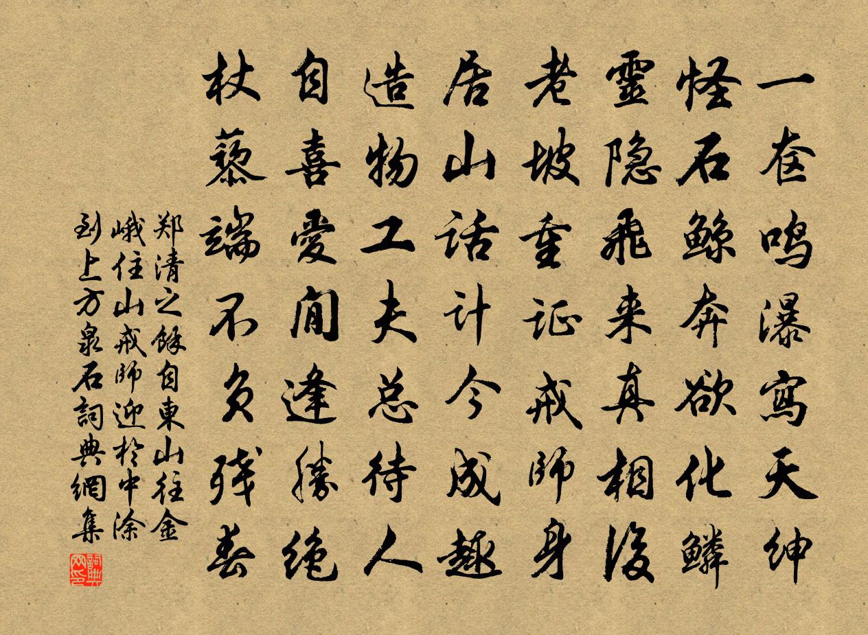 詩詞名句歷史字典書法欣賞書法字典國語詞典說文解字康熙字典古漢語字典標 題 作 者 詩 句 余自東山往金峨住山戒師迎於中塗到上方泉石作者:鄭清之 朝代:宋代原文一奩鳴瀑寫天紳,怪石鯨奔欲化鱗。靈隱飛來真相後,老坡重證戒師身。居山話計今成趣,造物工夫總待人。自喜愛閒逢勝絕,杖藜端不負殘春。詩詞問答問:《余自東山往金峨住山戒師迎於中塗到上方泉石》的作者是誰?答:鄭清之問:該詩寫於哪個朝代?答:宋代書法欣賞余自東山往金峨住山戒師迎於中塗到上方泉石書法作品詩文賞析【原題】:余自東山往金峨住山戒師迎於中塗到上方泉石幽勝有心匠助天巧者因成數語以贈詩詞推薦和君貺少林寺司馬光〔宋代〕達磨自雲傳佛心,緒言迷世到於今。既攜只履歸西域,安得遺靈在少林。孤月正明高殿冷,清風不斷老松深。謝公冬夜讀書示子聿陸游〔宋代〕簡斷編殘字欲無,吾兒不負乃翁書。絕勝鎖向朱門裡,整整牙籤飽蠹魚。句孟安序〔宋代〕扁舟卻下五溪水,勝地重遊八跡壇。正月九日有美堂飲醉歸徑睡五鼓方醒不復能眠蘇軾〔宋代〕之眾人事紛擾,志士獨悄悄。何異琵琶弦,常遭腰鼓鬧。三杯忘萬慮,醒後還皎皎。有如轆轤索,已脫重縈繞。家種花二首蘇轍〔宋代〕築室力已盡,種花功尚疏。山丹得春雨,艷色照庭除。末品何曾數,群芳自不如。今秋接千葉,試取洛人余。題星子懸黃宰世高問政堂楊萬里〔宋代〕黃子儂故人,危子儂門生。向來同登漱玉亭,銀河洗面醉不醒。四年二子不見面,過眼光陰掣飛電。今晨忽得問政水調歌頭(和吳秀岩韻)程公許〔宋代〕駝褐倚禪榻,絲鬢颺茶煙。誰知老子方寸,歷歷著千年。試問汗青餘幾,一笑腰黃縈夢,我自樂天全。出處兩無累簡任新恩張煒〔宋代〕自別梧姿二十年,情親何暇雁傳箋。深疑楚澤蟠胸次,不放吳霜點鬢邊。我憶花間聽樂府,君嗟柳下度吟鞭。於今十月十四夜夢與客分題得早行陸游〔宋代〕蓐食寒燈下,脂車小市傍。驛門猶淡月,街樹正清霜。觸目關河異,興懹道路長。丈夫當自力,雙鬢易蒼蒼。夢遊三首徐鉉〔唐代〕繡幌銀屏杳靄間,若非魂夢到應難。窗前人靜偏宜夜,戶內春濃不識寒。蘸甲遞觴織似玉,含詞忍笑膩於檀。錦書雨後登城上亭朱翌〔宋代〕何堪濕熱坐支離,且就虛涼看劇棋。避雨唯應急走耳,登城原丐少休之。江山政此成三絕,耳目醒然亦一奇。突兀贈番易程克已高翥〔宋代〕見說番易有老程,與人懷抱亦分明。一千里外未識面,二十年間長慕名。因聽酒邊談舊事,便從客裹定交情。他時小車行邵雍〔宋代〕喜醉豈無千日酒,惜春遠有四時花。小車行處人歡喜,滿洛城中都似家。楊歧祖師贊釋普濟〔宋代〕三腳驢子弄蹄行,金毛師子大哮吼。五峰峭峻摩蒼穹,千古萬古楊家愧。雲羅鄴〔唐代〕紛紛靄靄遍江湖,得路為霖豈合無。莫使悠颺只如此,帝鄉還更暖蒼梧。次韻安禮見寄楊時〔宋代〕末俗相看老尚新,交遊千里更誰親。蕭條身世聊安分,迂闊行藏懶徇人。宦路競羞關柝吏,勞生誰息利名身。我慚聞喜宴李教君瑞不赴小詩讚美劉克莊〔宋代〕膾人肝與采山薇,舉世營營為飽飢。始信洋洋而逝矣,已烹鶂鶂復哇之。伏雌雉亦防身害,疇昔羊能兆禍基。獨有次徐相公韻十首李顯忠釋行海〔宋代〕五丈高原躍戰鞍,同州太守舊藩官。路挑野斗皈南急,旗獵風鳴帶北寒。採石盤中兵膽涌,橘紅袍上箭痕乾。雞豚秋夜病起懷端叔作詩寄之秦觀〔宋代〕寢瘵當老秋,入夜庭軒空。天光脆如洗,月色清無縫。風飆戾戾輕,露氣霏霏重。檐花伴徐步,籠燭窺孤諷。緬惟宿天柱觀(一作宿靈洞觀)靈一〔唐代〕石室初投宿,仙翁喜暫容。花源隔水見,洞府過山逢。泉涌階前地,雲生戶外峰。中宵自入定,非是欲降龍。名句推薦順天意者,義政也;反天意者,力政也。墨子《墨子·26章 天志(上)》 天行健;君子以自強不息。佚名《易傳·象傳上·乾》 隔岸荒雲遠斷,繞磯小樹微明。歸莊《錦堂春·半壁橫江矗起》 此後錦書休寄,畫樓雲雨無憑。晏幾道《清平樂·留人不住》 靈山多秀色,空水共氤氳。張九齡《湖口望廬山瀑布泉 / 湖口望廬山瀑布水》 今春香肌瘦幾分?縷頻寬三寸。王實甫《十二月過堯民歌·別情》 細看來,不是楊花,點點是離人淚。蘇軾《水龍吟·次韻章質夫楊花詞》 青海長雲暗雪山,孤城遙望玉門關。王昌齡《從軍行七首·其四》 結髮為夫妻,恩愛兩不疑。蘇武《留別妻》 晴日暖風生麥氣,綠陰幽草勝花時。王安石《初夏即事》