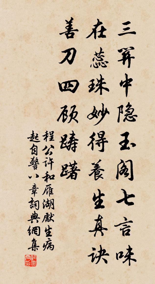 詩詞名句歷史字典書法欣賞書法字典國語詞典說文解字康熙字典古漢語字典標 題 作 者 詩 句 和雁湖先生病起自警八章作者:程公許 朝代:宋代和雁湖先生病起自警八章原文三關中隱玉閣,七言味在蕊珠。妙得養生真訣,善刀四顧躊躇。詩詞問答問:和雁湖先生病起自警八章的作者是誰?答:程公許問:和雁湖先生病起自警八章寫於哪個朝代?答:宋代程公許和雁湖先生病起自警八章書法欣賞和雁湖先生病起自警八章書法作品詩詞推薦寒食蔣夢炎〔宋代〕不暖不寒寒食天,小橋楊柳未飛綿。三分春色一分在,十日晴無兩日全。桐角喚回前嶂曉,子規啼破隔江煙。麻裙贈曾槃樂道趙蕃〔宋代〕我居懷玉山,茶山非一游。每觀文清竹,凜若人好修。往來道嘉禾,詩曾長公投。十年再建業,問勞加綢繆。中歌回先生過湖州東林沈氏,飲醉,以石榴皮書其蘇軾〔宋代〕世俗何知貧是病,神仙可學道之餘。但知白酒留佳客,不問黃公覓素書。鄭子仁生朝項安世〔宋代〕萬紫千紅變綠時,高門廣路繡弧垂。梅梢暗結和羹實,蠶簇初抽演綍絲。首占夏時天已許,名喧春牓世方知。家傅大司成顏幾聖率同舍招游裴園,泛舟繞孤山賞楊萬里〔宋代〕游盡西湖賞盡蓮,玉壺落日泊樓船。莫嫌當處荷花少,剩展湖光幾鏡天。和曾令綽買宅貽景仁韓維〔宋代〕久治孤學慕軻丘,投老還鄉寡所求。蓬華隨緣安靜默,林泉乘興訪深幽。高門此地成君志,方駕何時寫我憂。白首續賦家園七詠意遠亭劉子翬〔宋代〕雨余陂水平,徙倚聊一望。歸雲淡欲無,宇宙何清曠。吾心游太虛,聊寄此亭上。寄張都乾蒙正劉過〔宋代〕林深葉密綠陰繁,荷漸生芽蒲有根。心事嗟跎過歲月,故人落寞共乾坤。舟行蓴菜水雲浦,路入楊梅煙雨村。何日和天衣聰老五首王之道〔宋代〕達磨東來不記年,一燈然處百燈然。顧從清淨求明了,應喜晨齋學省緣。踏莎行杜安世〔宋代〕嫩柳成陰,殘花雙舞。塵消院落新經雨。洞房深掩日長天,珠簾時有沈煙度。夜夢淒涼,晨妝薄注。香肌瘦盡寬金寄侍郎王曙偈釋警玄〔宋代〕吾年八十五,修因至於此。問我歸何處,頂相終難睹。已亥雜詩 269龔自珍〔清代〕美人捭闔計仍頻,我佩陰符亦可憑。綰就同心堅待辱,羽 山下是西陵。寄元齡弟五首裘萬頃〔宋代〕一室蕭然百事無,崇朝趺坐對熏爐。岫雲舒捲元無礙,贏得從容養病軀。大暑松下臥起二首陳天瑞〔宋代〕炎威一何驕,不有商飆慘。蒼茫雲海路,飛龍不可覽。我本灌園人,昔乃從鉛槧。萬事已恢心,十載空嘗膽。亭亭挽趙秋曉釋覺真〔宋代〕合掌焚香敬揲蓍,數符大衍為君悲。生如玄德不為夭,命許宣尼只自知。方丈室中曾示病,三生石上又前期。他年過平泉鋪李復〔宋代〕去家十日九有雨,林間怒鳩猶逐婦。村店泥深晝閉門,系馬臨河自炊黍。生桑煙重不供爨,粗糲如沙聊把筋。推盤景祐祀社稷三首佚名〔宋代〕禮崇明福,維聲斯酒。潔粢豈盛,分時徼牲。齊莊嚴祗,升燎於槱。其報伊何,如山如阜。長相思(娥眉亭)黃機〔宋代〕東梁山。西梁山。占斷長江相對閒。古今雙鬢斑。天漫漫。水漫漫。人事如潮多往還。淺顰深恨間。送客姜特立〔宋代〕今日出郊送客,明朝肩輿入州。六十年前伎倆,白頭也合歸休。夜泊有懷權德輿〔唐代〕棲鳥向前林,暝色生寒蕪。孤舟去不息,眾感非一途。川程方浩淼,離思方鬱紆。轉枕眼未熟,擁衾淚已濡。窘然名句推薦天意眷我中興,吾皇神武,踵曾孫周發。黃中輔《念奴嬌·炎精中否》 桃李務青春,誰能貫白日。李白《長歌行》 一壺濁酒喜相逢,古今多少事,都付笑談中。羅貫中《三國演義·第一回》 曾經滄海難為水,除卻巫山不是雲。元稹《離思五首·其四》 燕子來時新社,梨花落後清明。晏殊《破陣子·春景》 古戍蒼蒼烽火寒,大荒沈沈飛雪白。李頎《聽董大彈胡笳聲兼寄語弄房給事》 枕簟溪堂冷欲秋。斷雲依水晚來收。辛棄疾《鷓鴣天·鵝湖歸病起作》 洊雷,震;君子以恐懼修省。佚名《易傳·象傳下·震》 過江千尺浪,入竹萬竿斜。李嶠《風》 雖至親亦忍絕,縱為惡亦不讓。來俊臣《羅織經·事上卷第二》